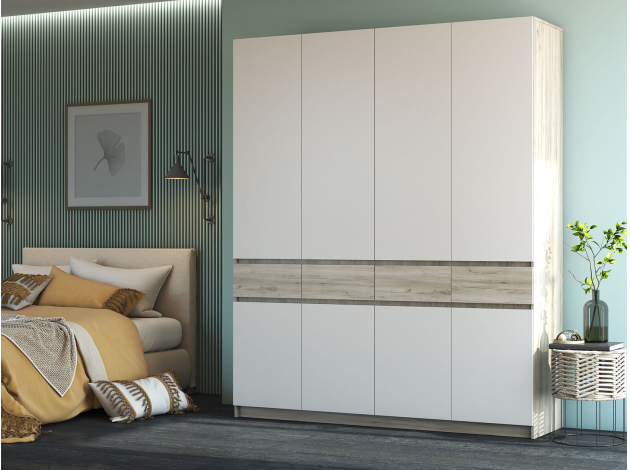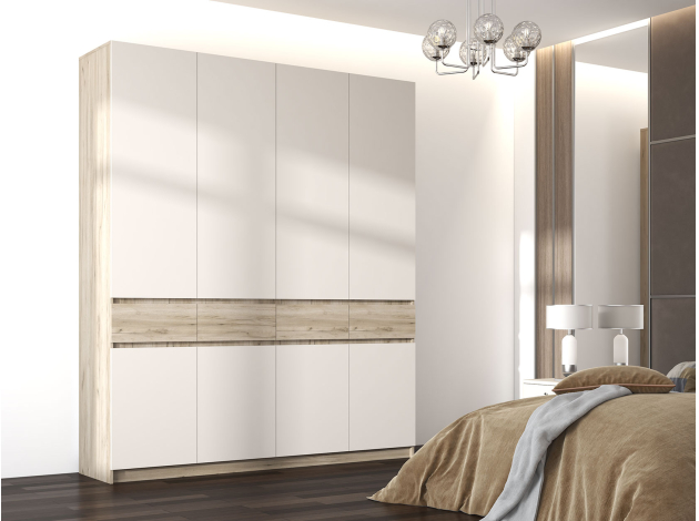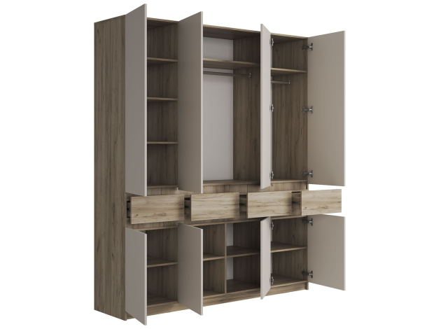 Распашной шкаф Бостон организует продуманную систему хранения гардероба в современном интерьере, рационально используя пространство. Комбинированное наполнение представлено двумя отделениями со штангами для вешалок, множеством полок для сложенной одежды и сезонной обуви, а также выдвижными ящиками, где удобно держать в быстром доступе полезные мелочи. Ящики оснащены шариковыми направляющими для плавного бесшумного хода. Дверцы без внешней фурнитуры открываются при помощи зазоров на фасадах, скрытых за декоративными планками.