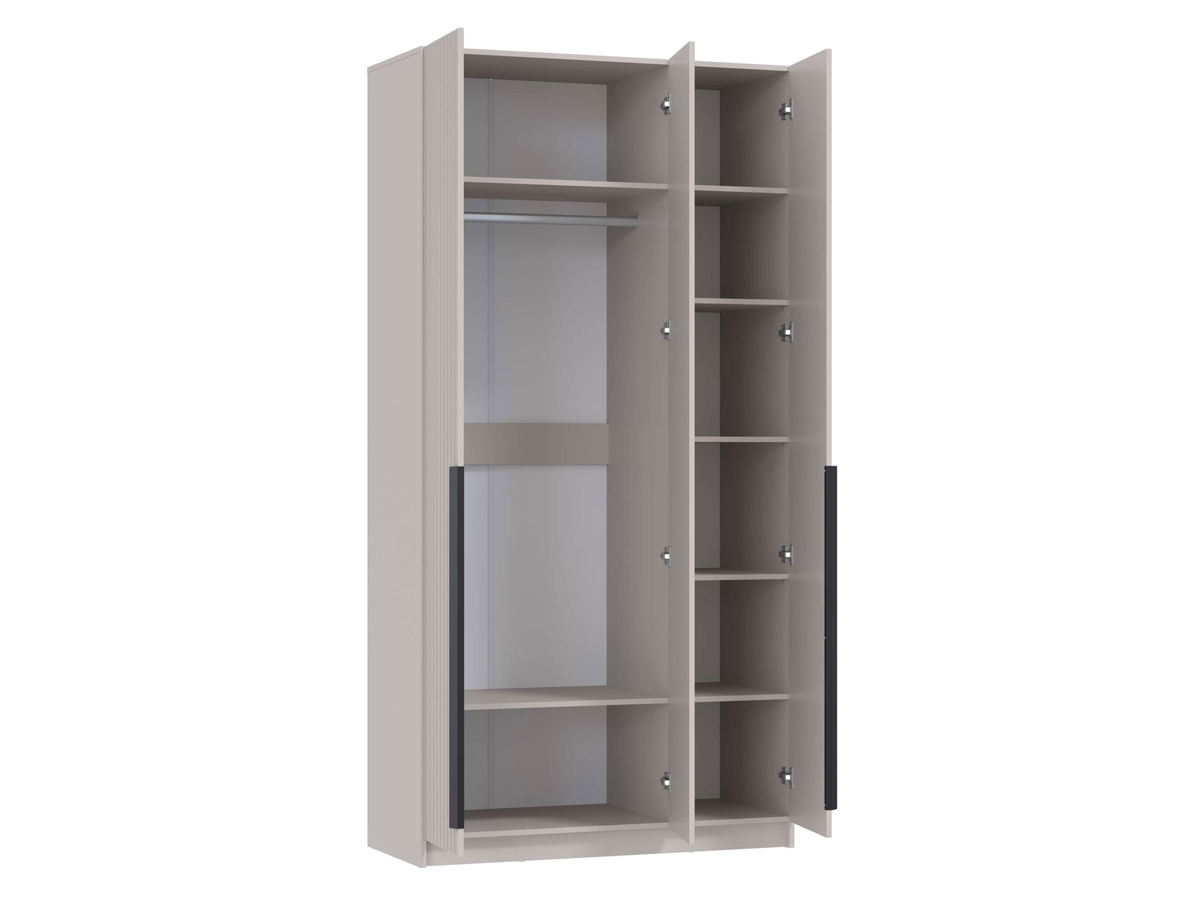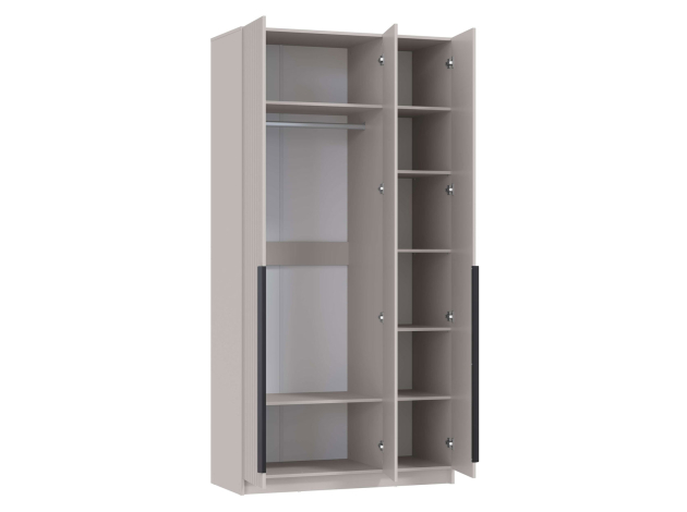 Распашной шкаф Брандо Миди элегантный, просторный и очень удобный. Стильная фрезеровка и тонкие вертикальные ручки подчеркивают утонченный облик модели. Внутреннее наполнение включает отделение со штангой и полки, что позволяет аккуратно разместить одежду из деликатных тканей, трикотаж и другие предметы гардероба.