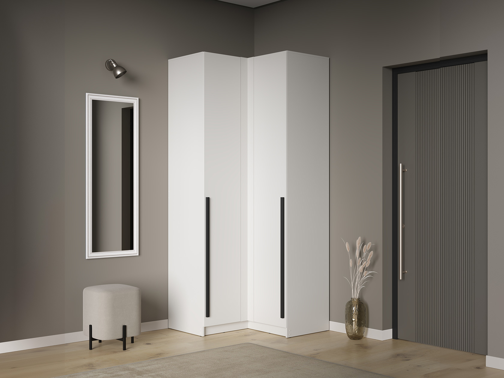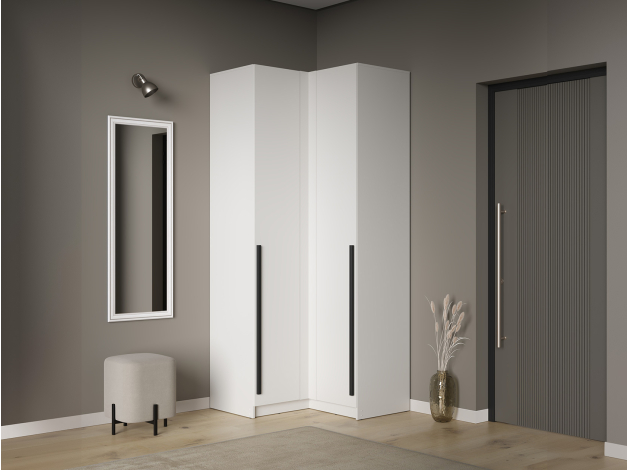Угловой шкаф Брандо Стандарт объединяет две просторные секции для хранения. Полки и ниша со штангой помогут удобно разместить любые предметы гардероба. Минималистичные фасады дополнены строгими вертикальными ручками. Такой дизайн позволяет интегрировать мебель в современный интерьер.