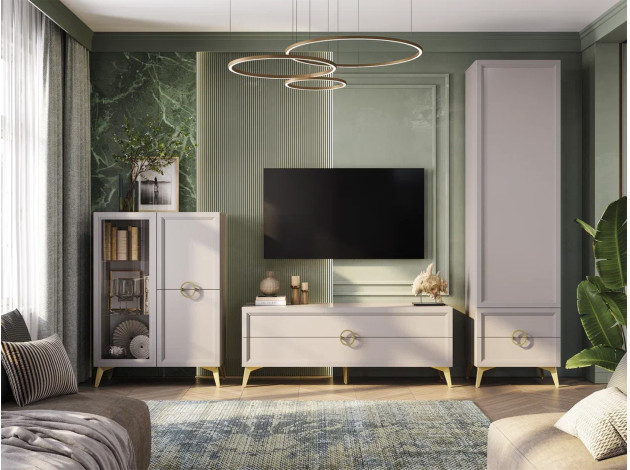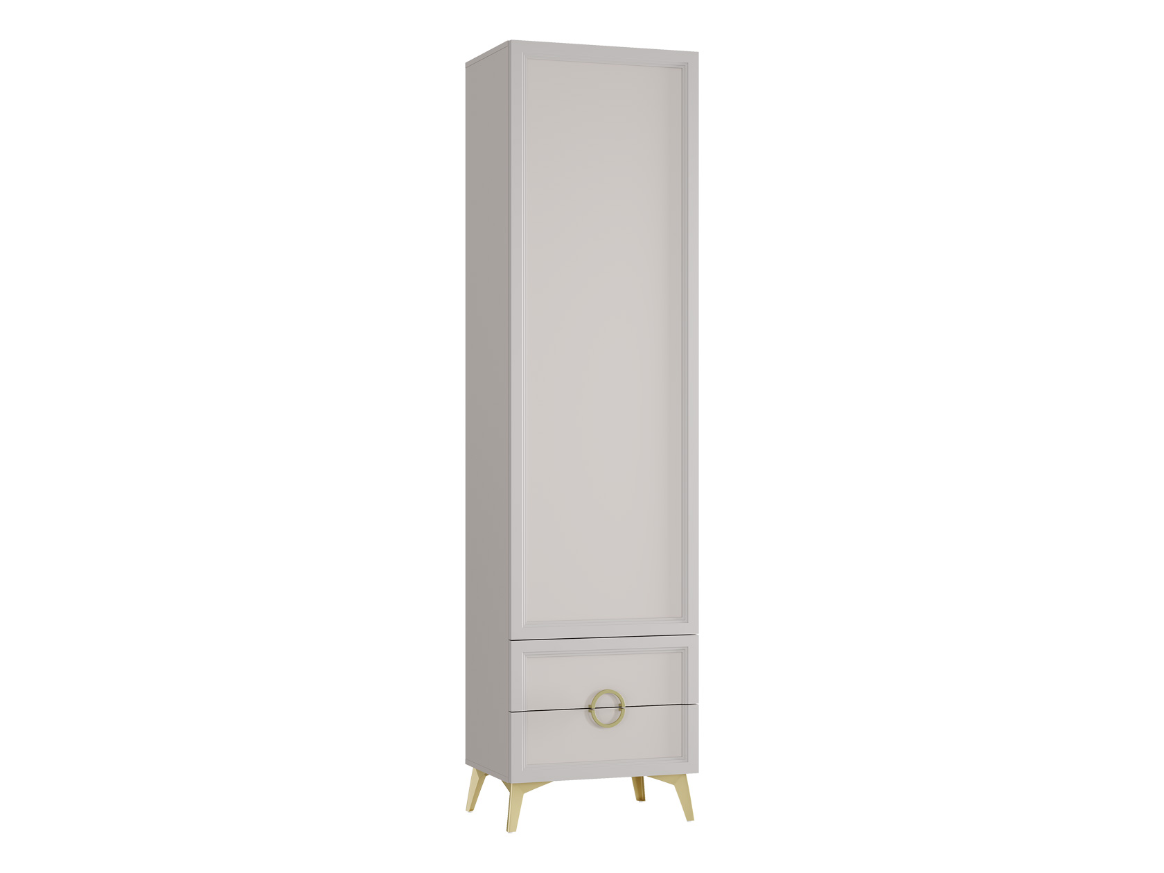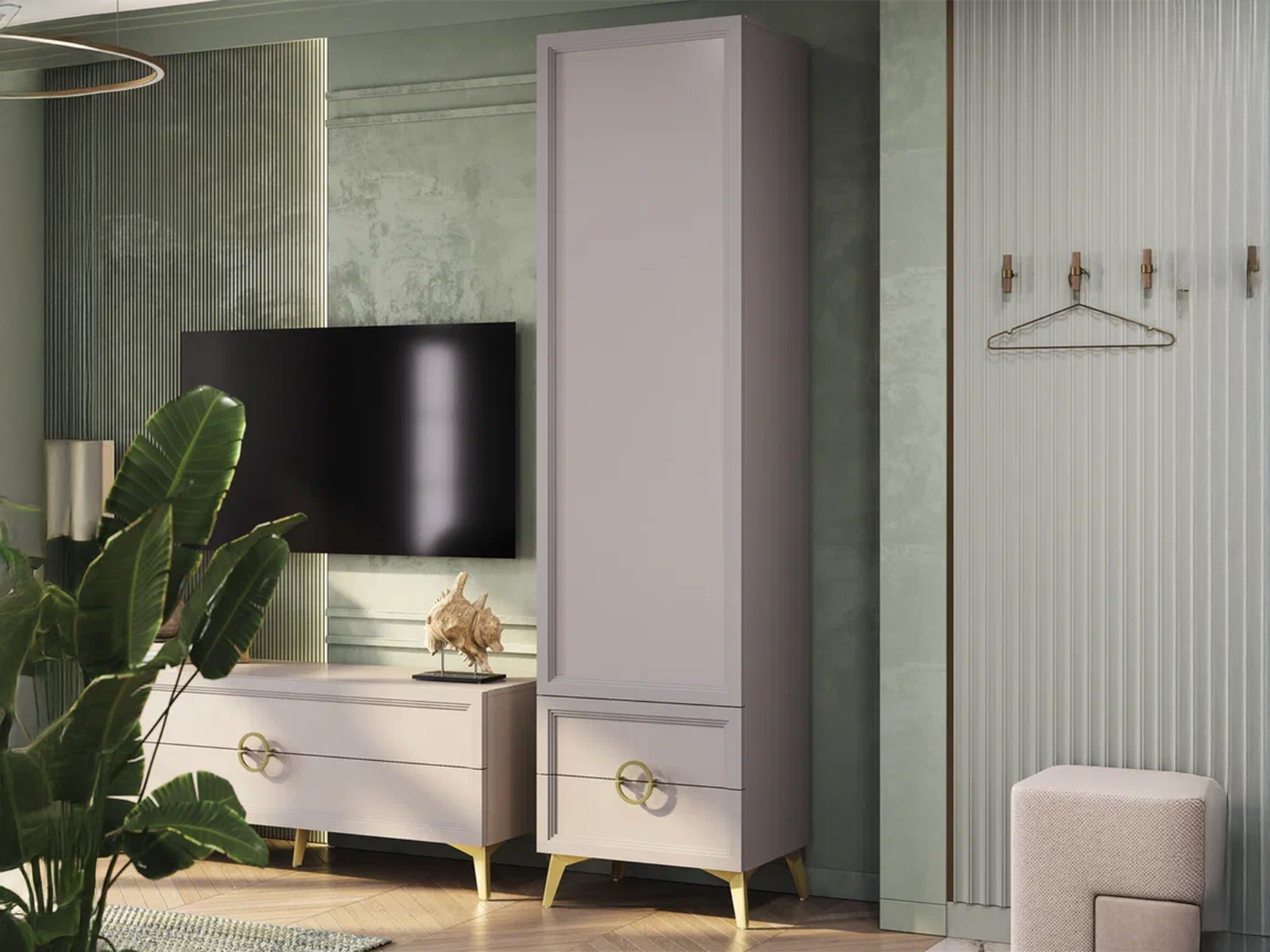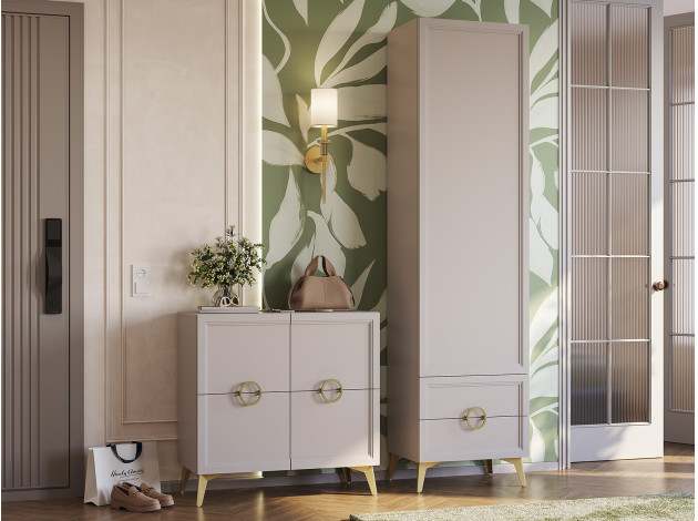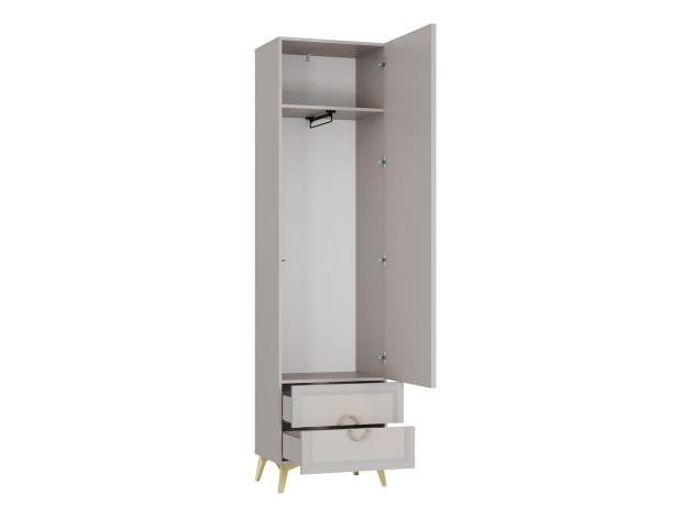 Пенал Эстетика расширит возможности для хранения и придаст интерьеру особый шарм. На поперечной штанге удобно расположить одежду на вешалках, а в выдвижных ящиках — распределить белье и полезные мелочи. Полукруглые ручки в оттенке золота делают акцент на объемной фрезеровке фасадов.