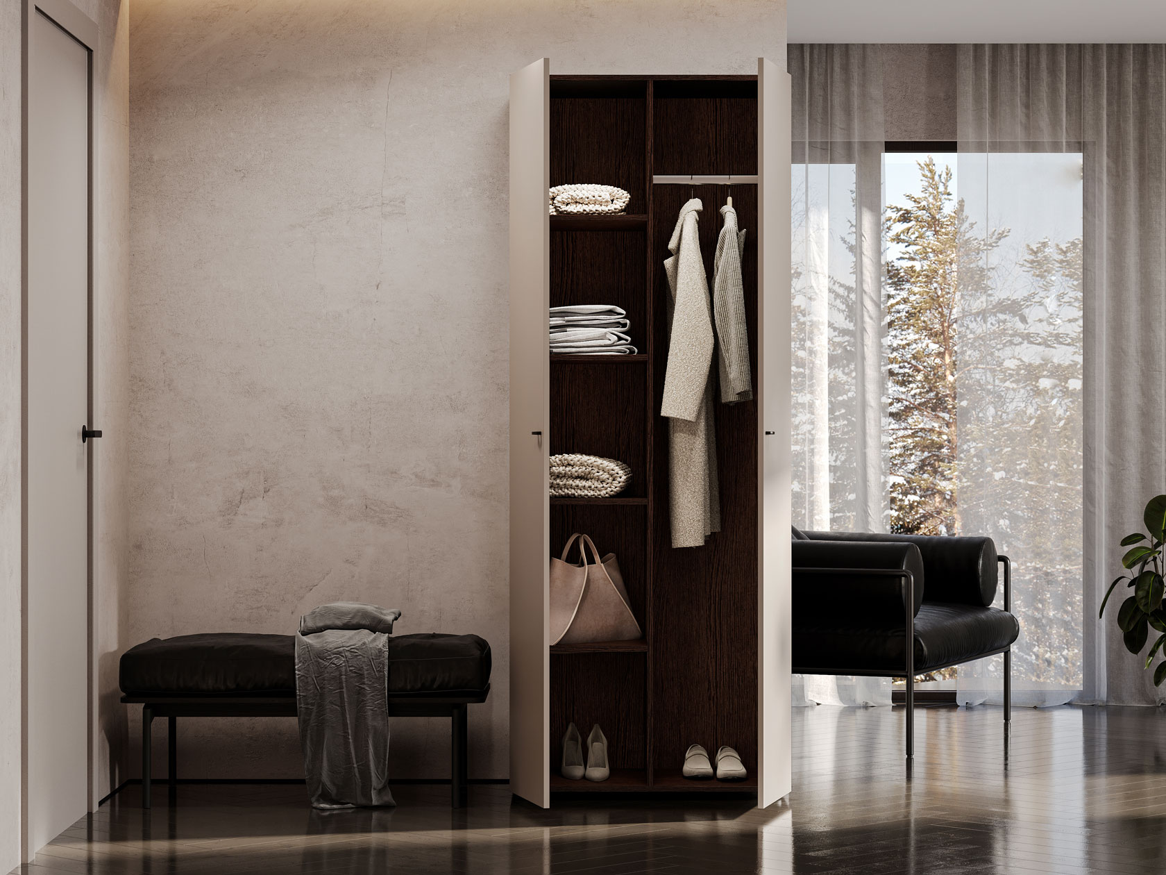 Распашной шкаф Гиза поможет организовать хранение одежды, обуви и сопутствующих аксессуаров. Разноплановое наполнение позволяет аккуратно разместить на вешалках предметы гардероба из мнущихся тканей, а также сложить на полки белье и повседневные вещи.