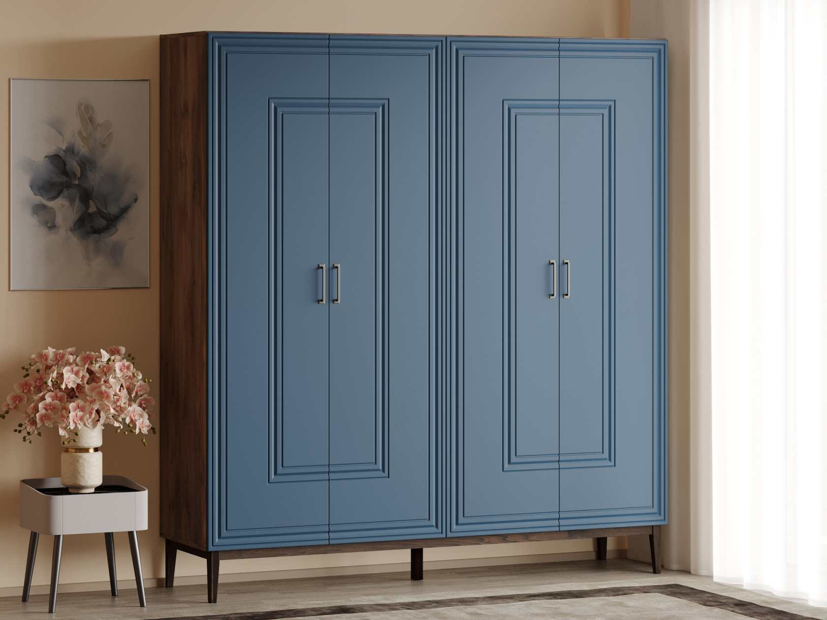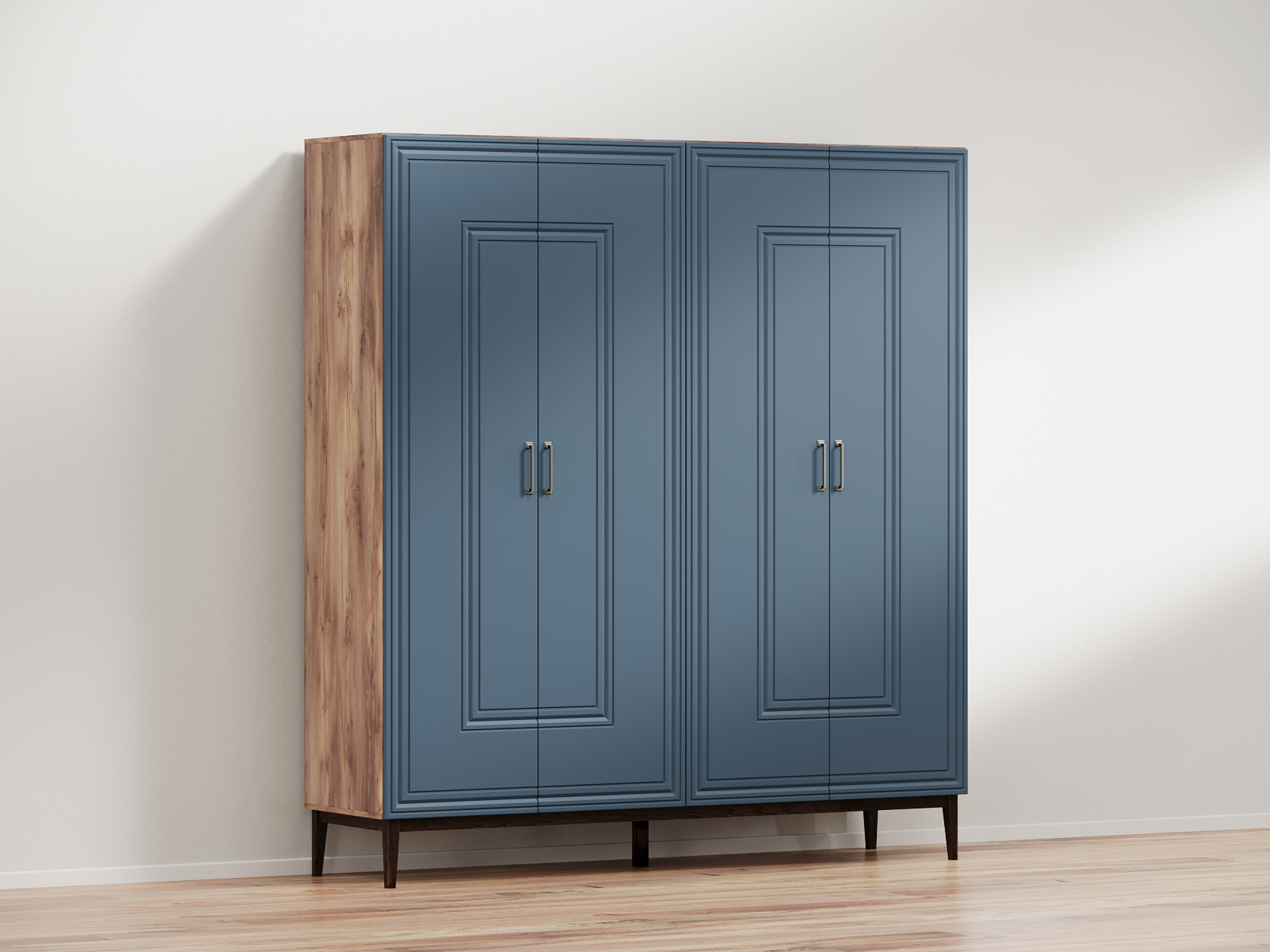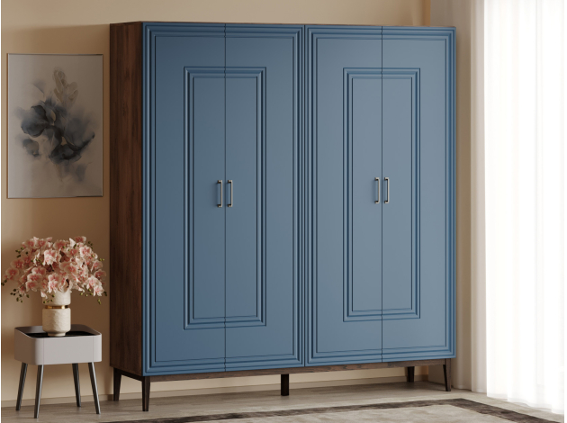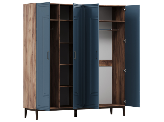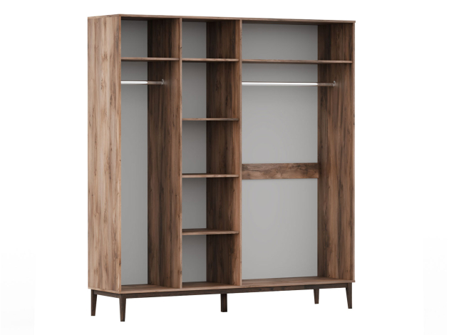 Распашной шкаф Эвора — вместительное решение для хранения предметов гардероба, белья и других принадлежностей. Два отделения со штангами для вешалок позволяют разделить верхнюю и повседневную одежду. Фасады украшены фрезеровкой и стильными ручками, которые придают модели особый шарм.