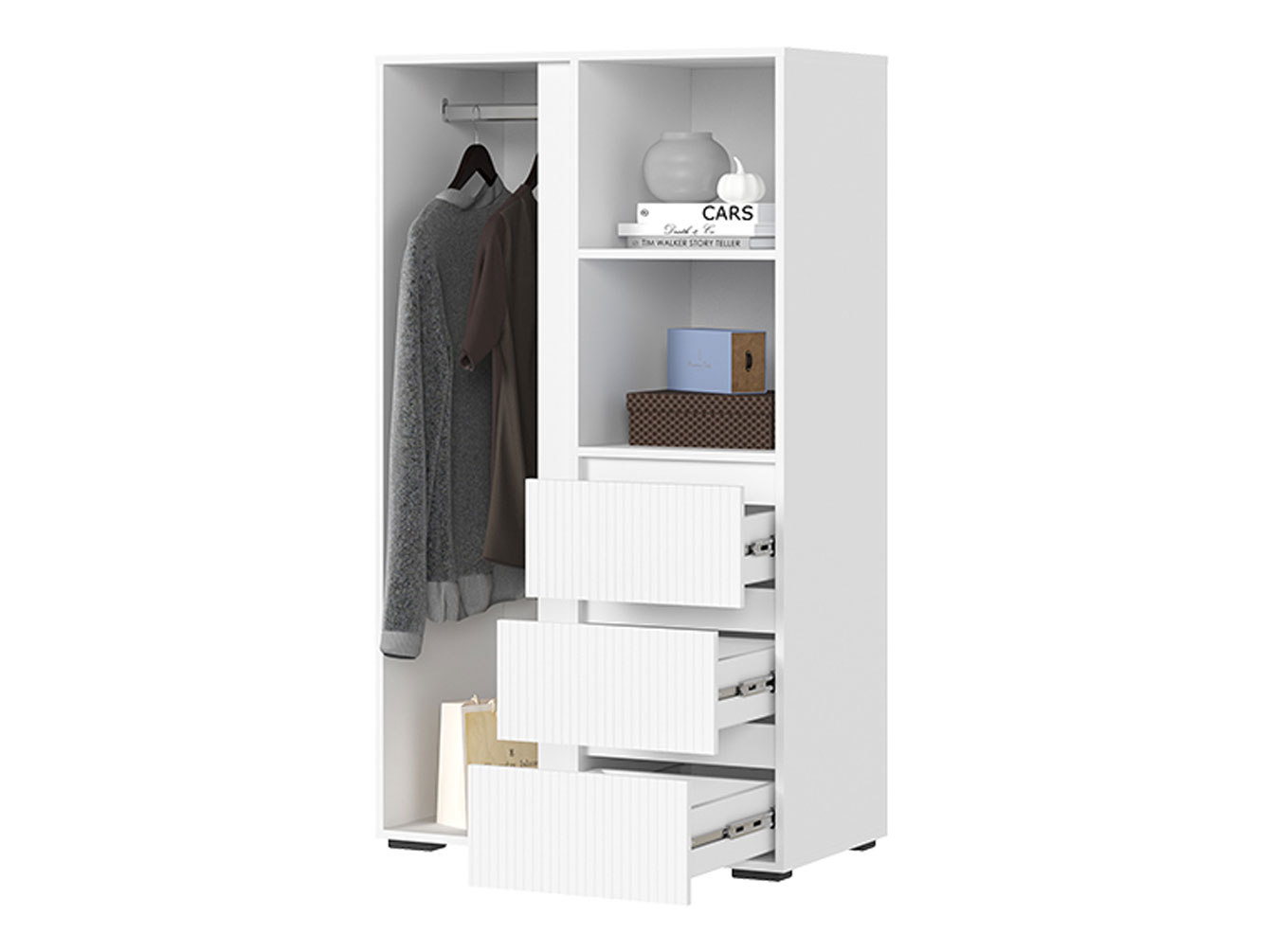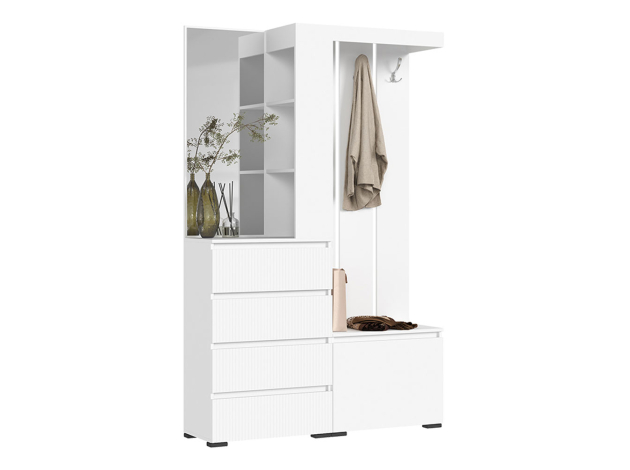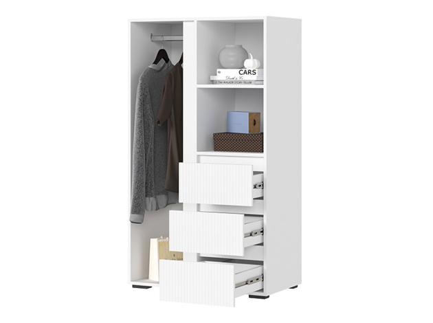 Распашной шкаф Хелен Комби организует комфортное хранение различных вещей. Разноплановое наполнение позволяет распределить одежду на вешалках и полках. Выдвижные ящики подойдут для белья и аксессуаров. Открытые ниши можно использовать для размещения статуэток, фоторамок и другого декора.