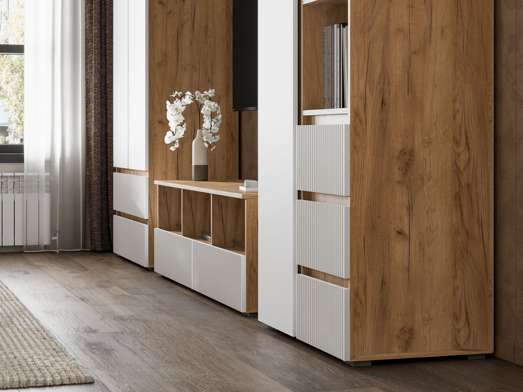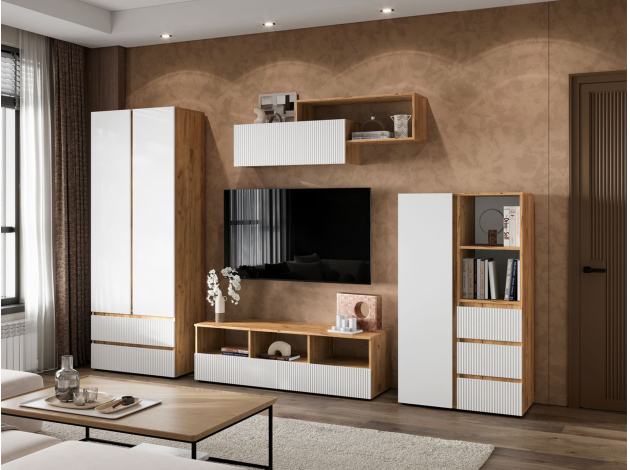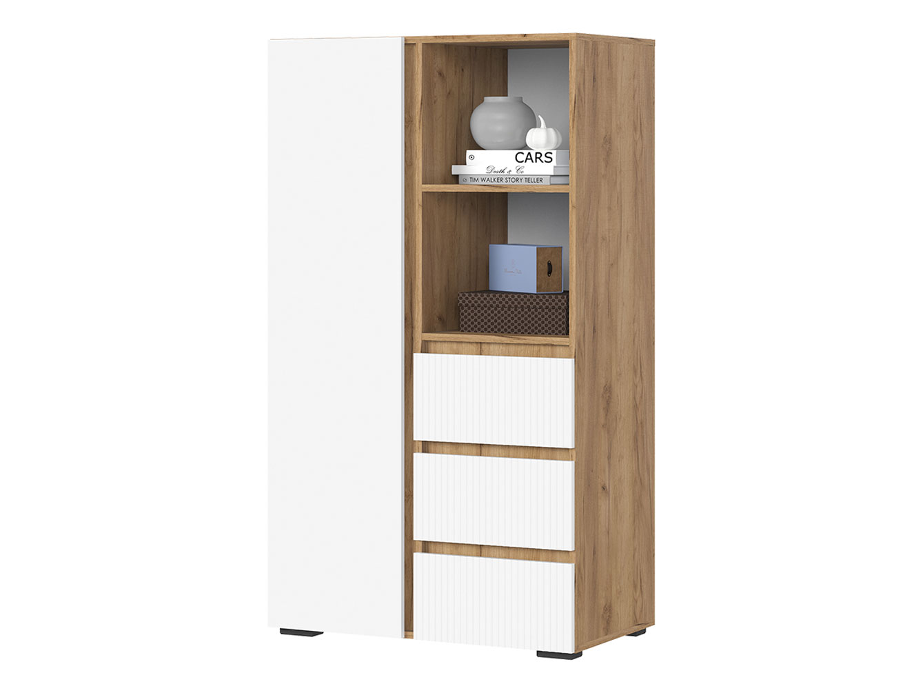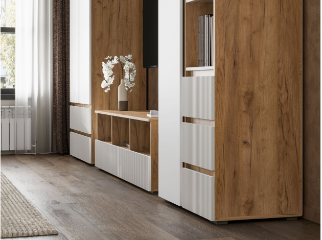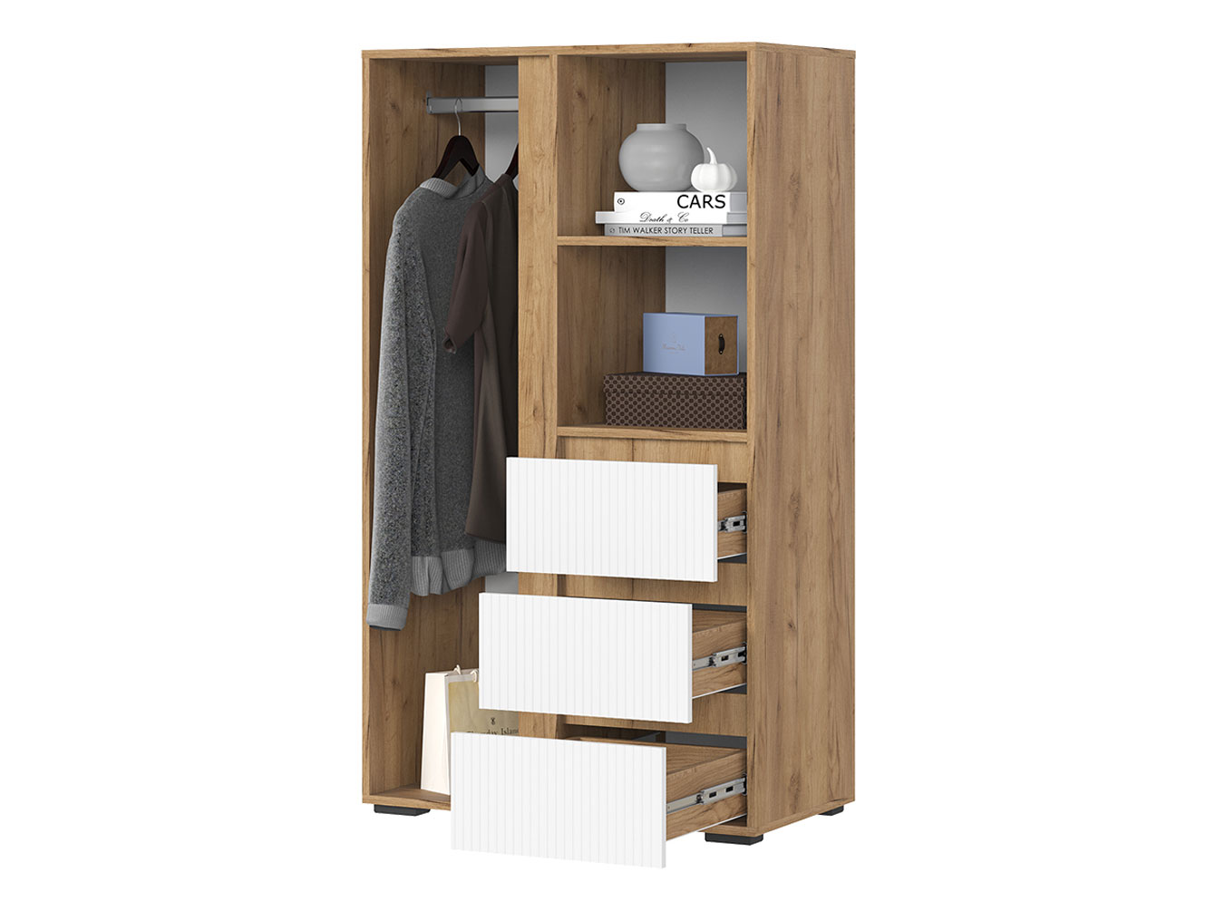 Распашной шкаф Хелен Комби организует комфортное хранение различных вещей. Разноплановое наполнение позволяет распределить одежду на вешалках и полках. Выдвижные ящики подойдут для белья и аксессуаров. Открытые ниши можно использовать для размещения статуэток, фоторамок и другого декора.