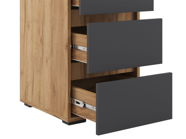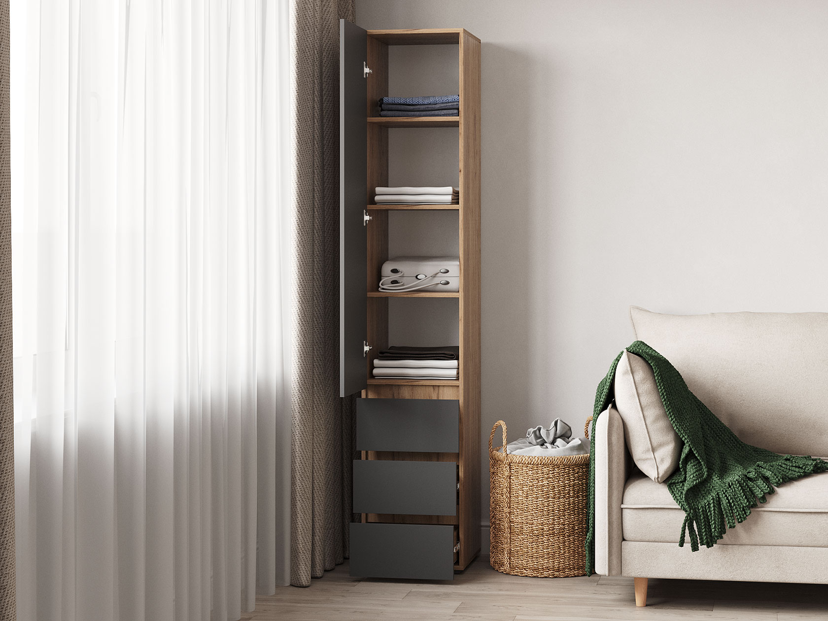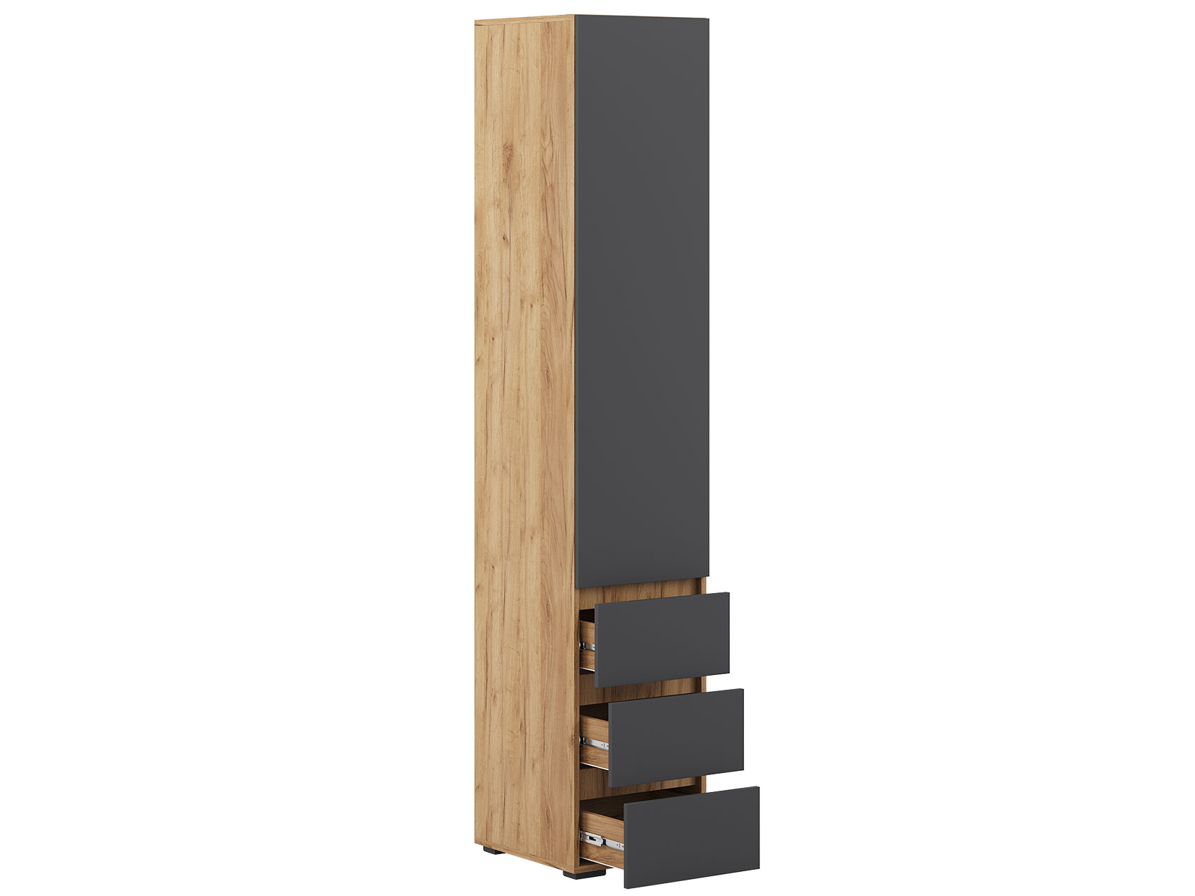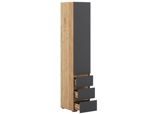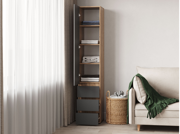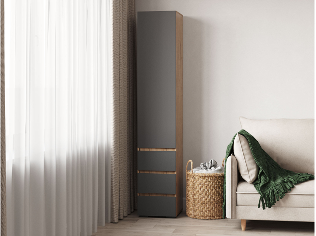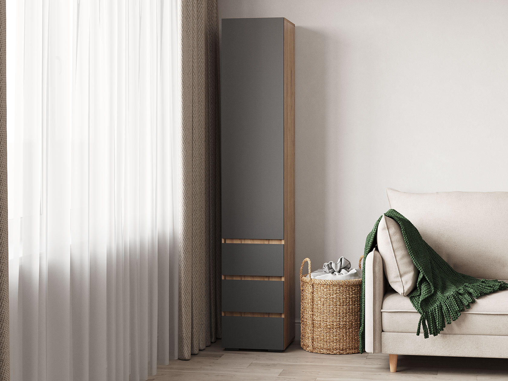 Распашной шкаф Элли — небольшая, но очень удобная и функциональная модель. Неглубокие полки и выдвижные ящики позволят распределить одежду и аксессуары так, чтобы легко находить нужную вещь даже в спешке. На фасадах нет лицевой фурнитуры.