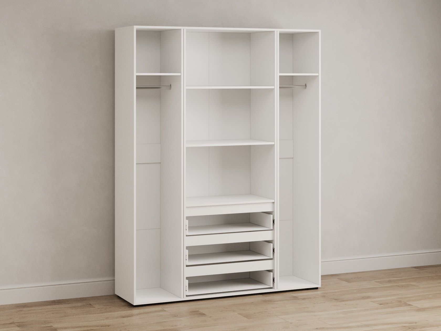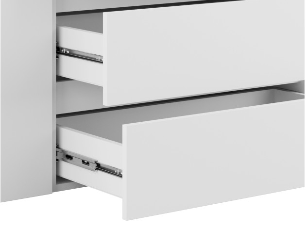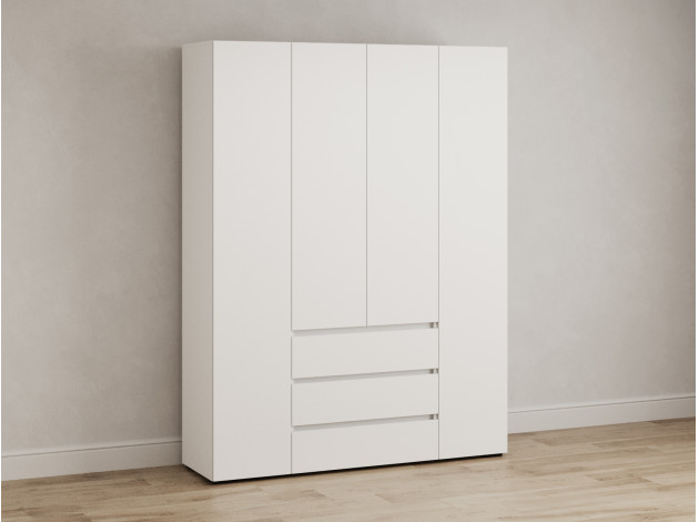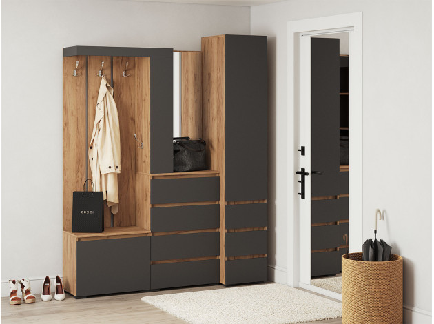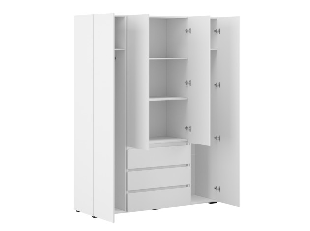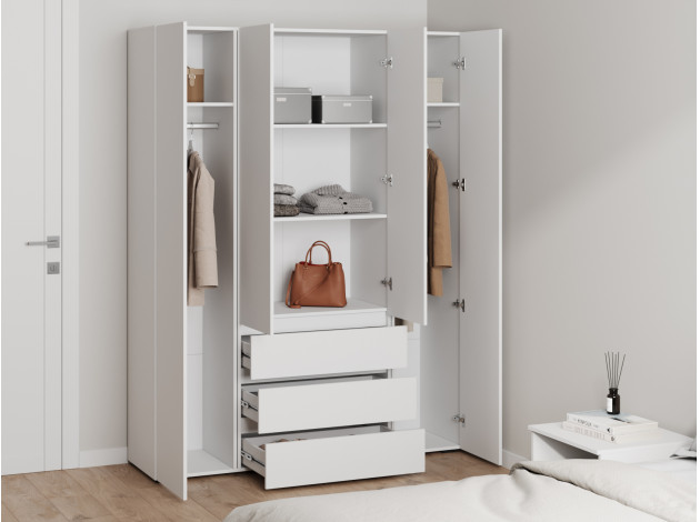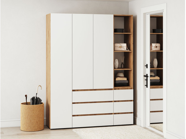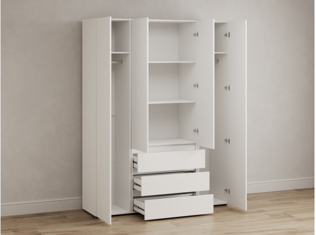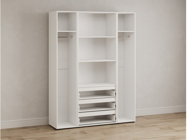 Распашной шкаф Элли — простой способ разместить гардероб, сэкономив пространство комнаты. Благодаря небольшой глубине модель помещается даже в узком проходе, а продуманное наполнение помогает организовать удобное хранение повседневной одежды. Ящики и дверцы открываются за выступающий край фасада.