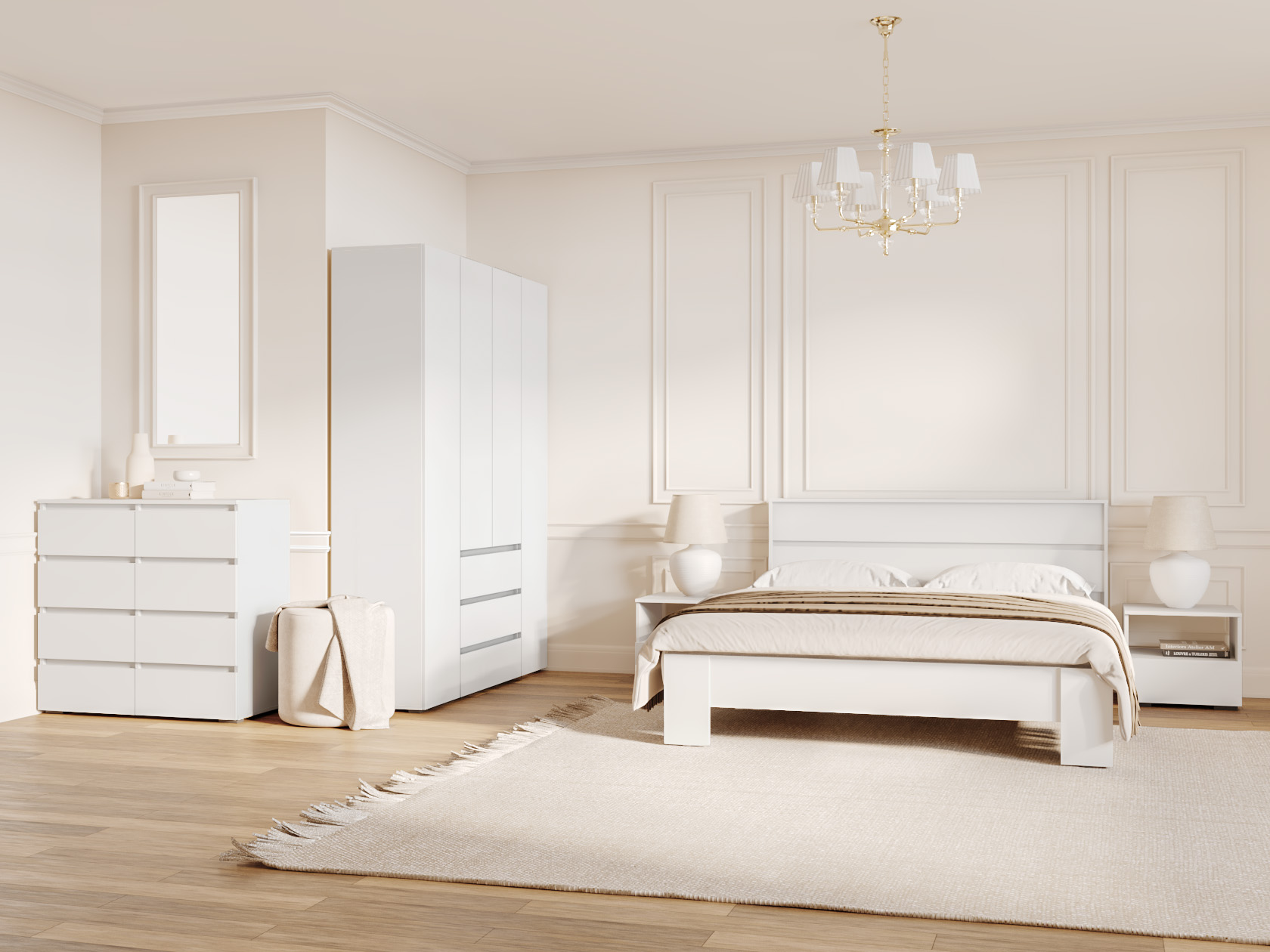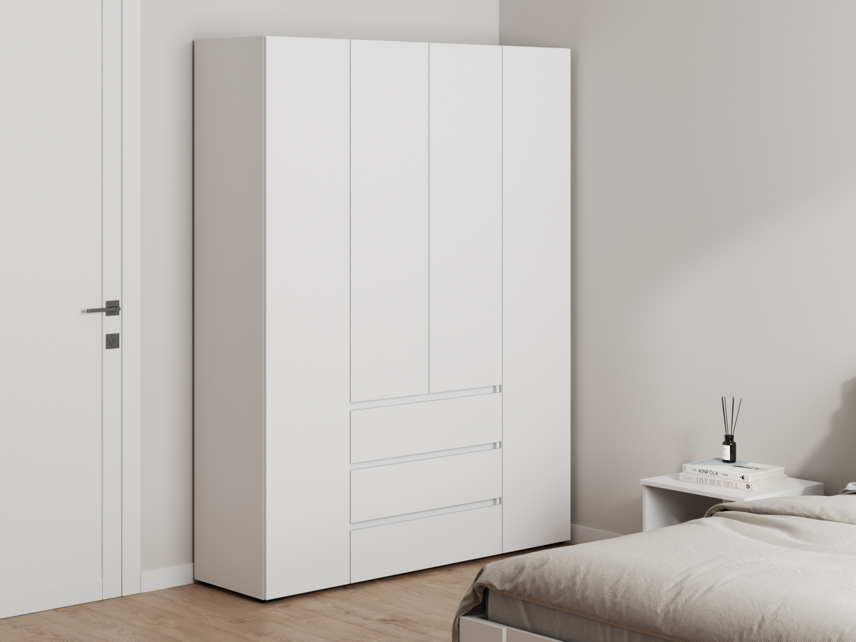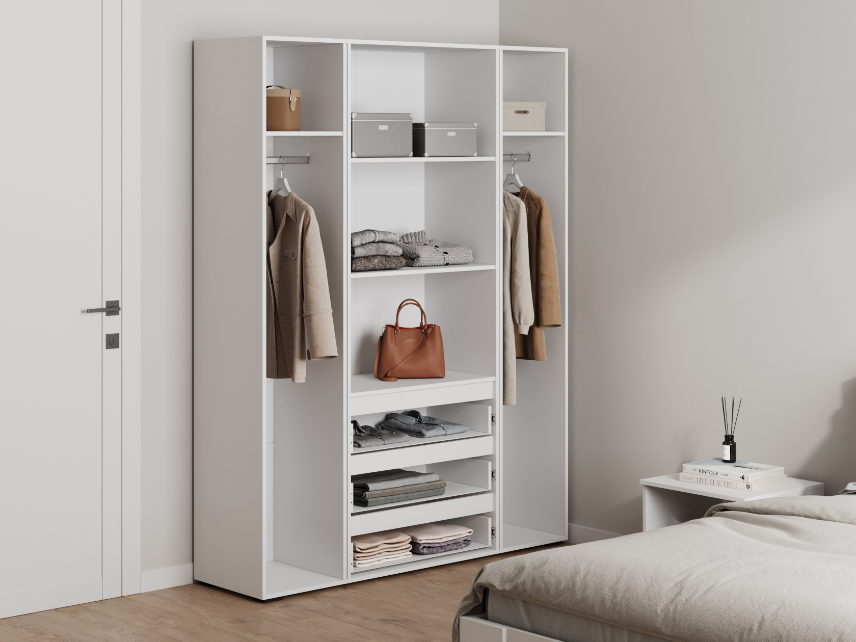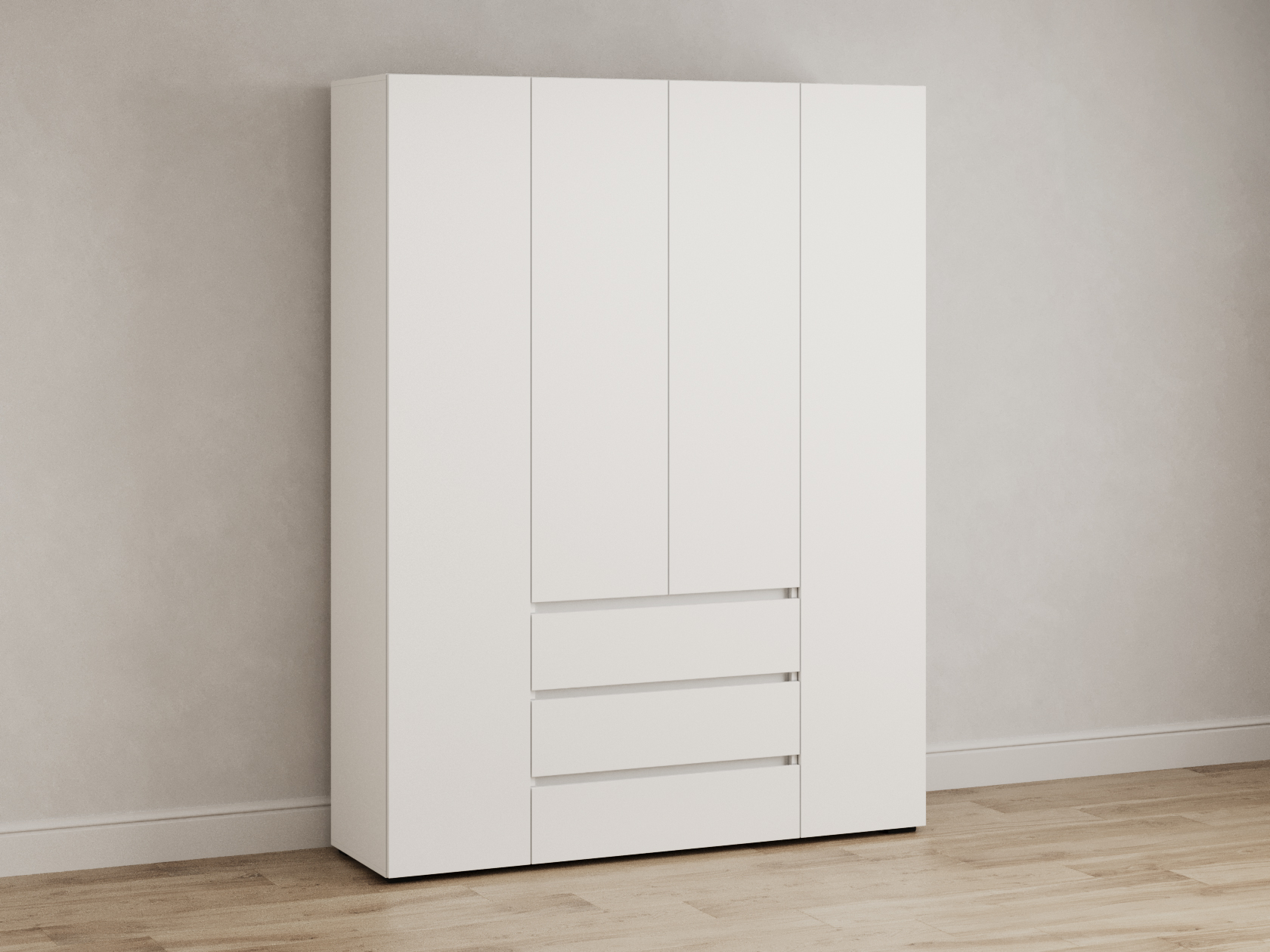 Распашной шкаф Элли — простой способ разместить гардероб, сэкономив пространство комнаты. Благодаря небольшой глубине модель помещается даже в узком проходе, а продуманное наполнение помогает организовать удобное хранение повседневной одежды. Ящики и дверцы открываются за выступающий край фасада.