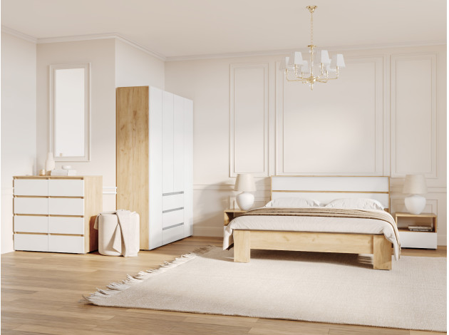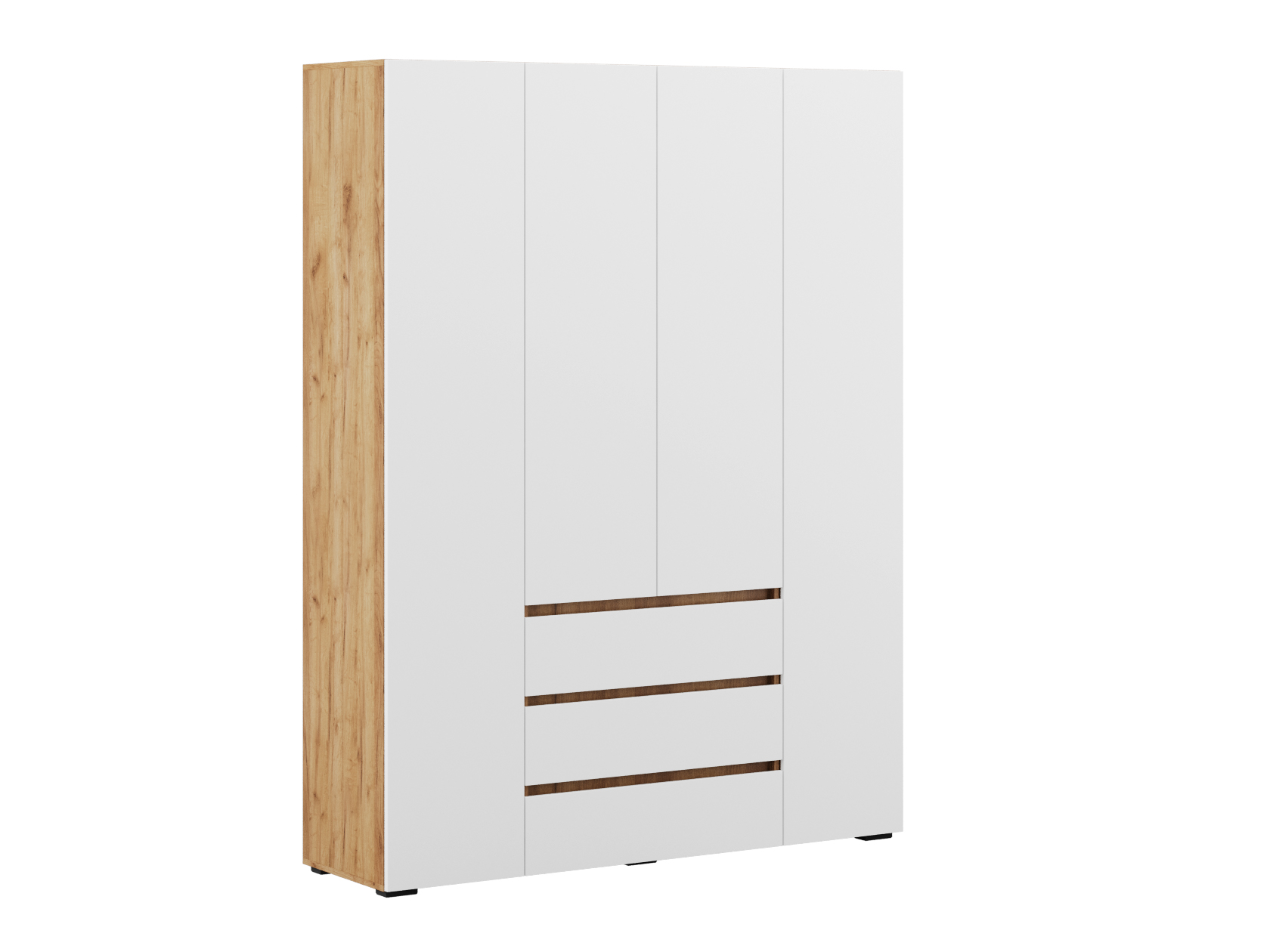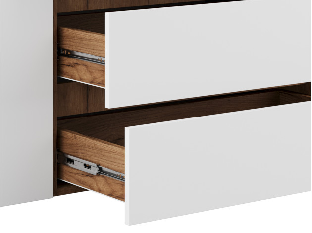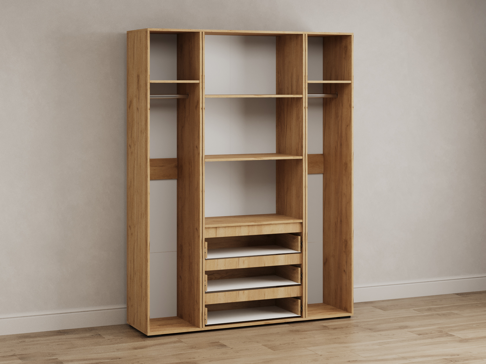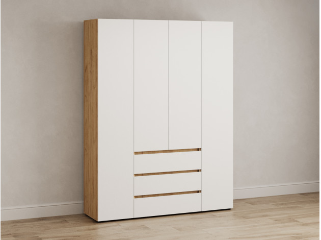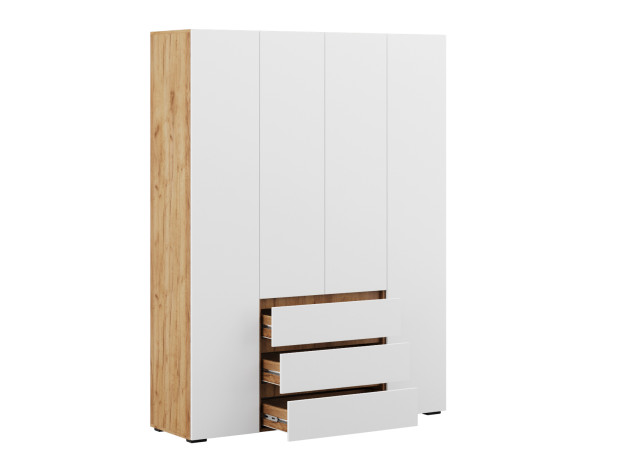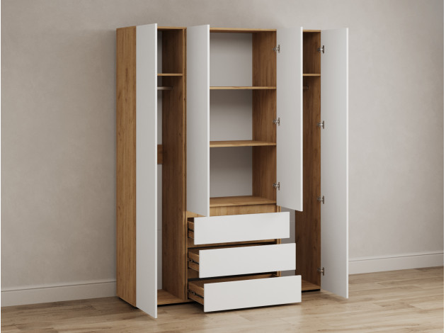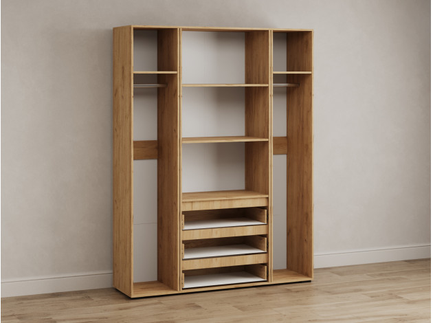 Распашной шкаф Элли — простой способ разместить гардероб, сэкономив пространство комнаты. Благодаря небольшой глубине модель помещается даже в узком проходе, а продуманное наполнение помогает организовать удобное хранение повседневной одежды. Ящики и дверцы открываются за выступающий край фасада.