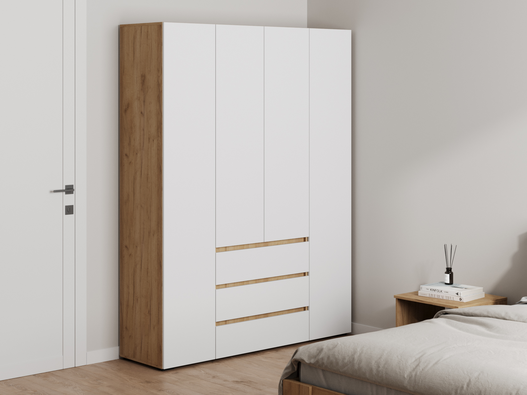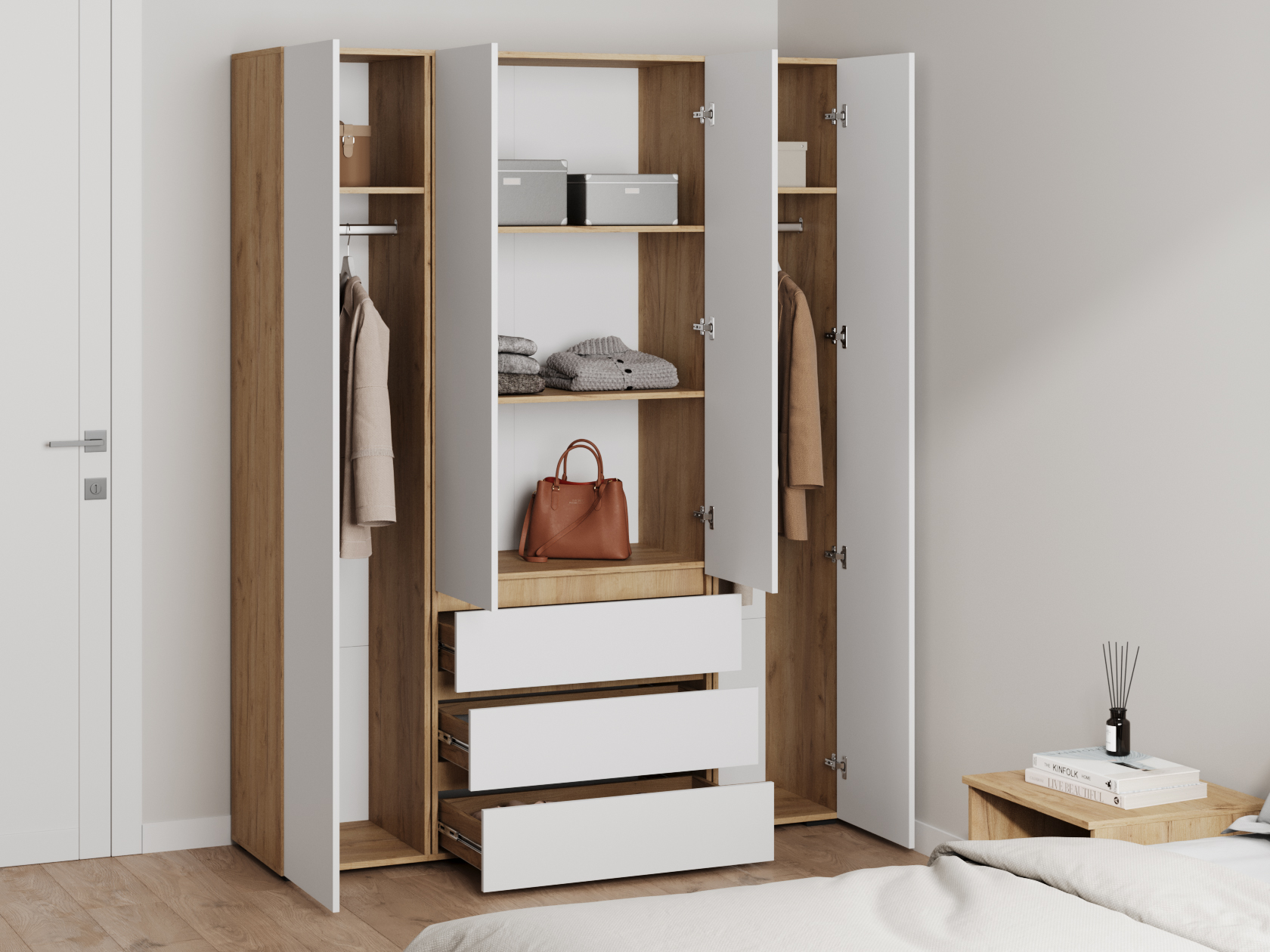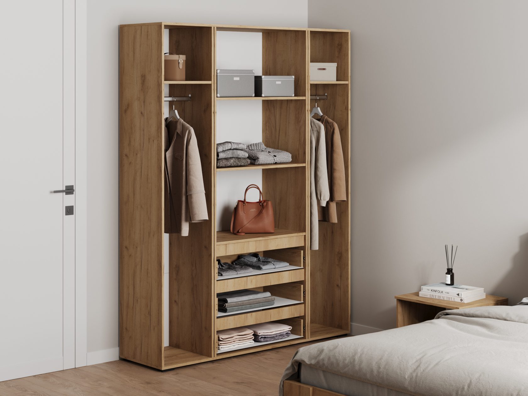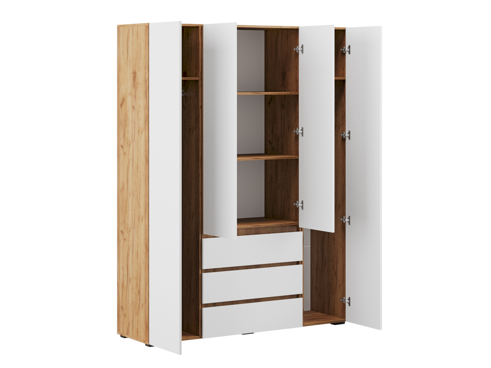 Распашной шкаф Элли — простой способ разместить гардероб, сэкономив пространство комнаты. Благодаря небольшой глубине модель помещается даже в узком проходе, а продуманное наполнение помогает организовать удобное хранение повседневной одежды. Ящики и дверцы открываются за выступающий край фасада.