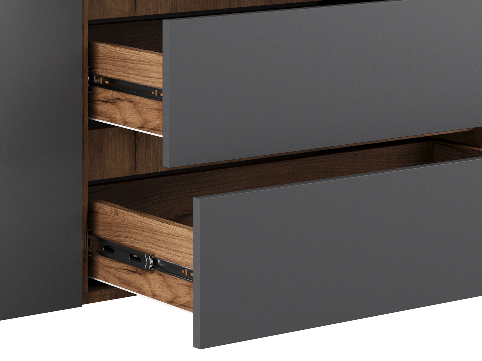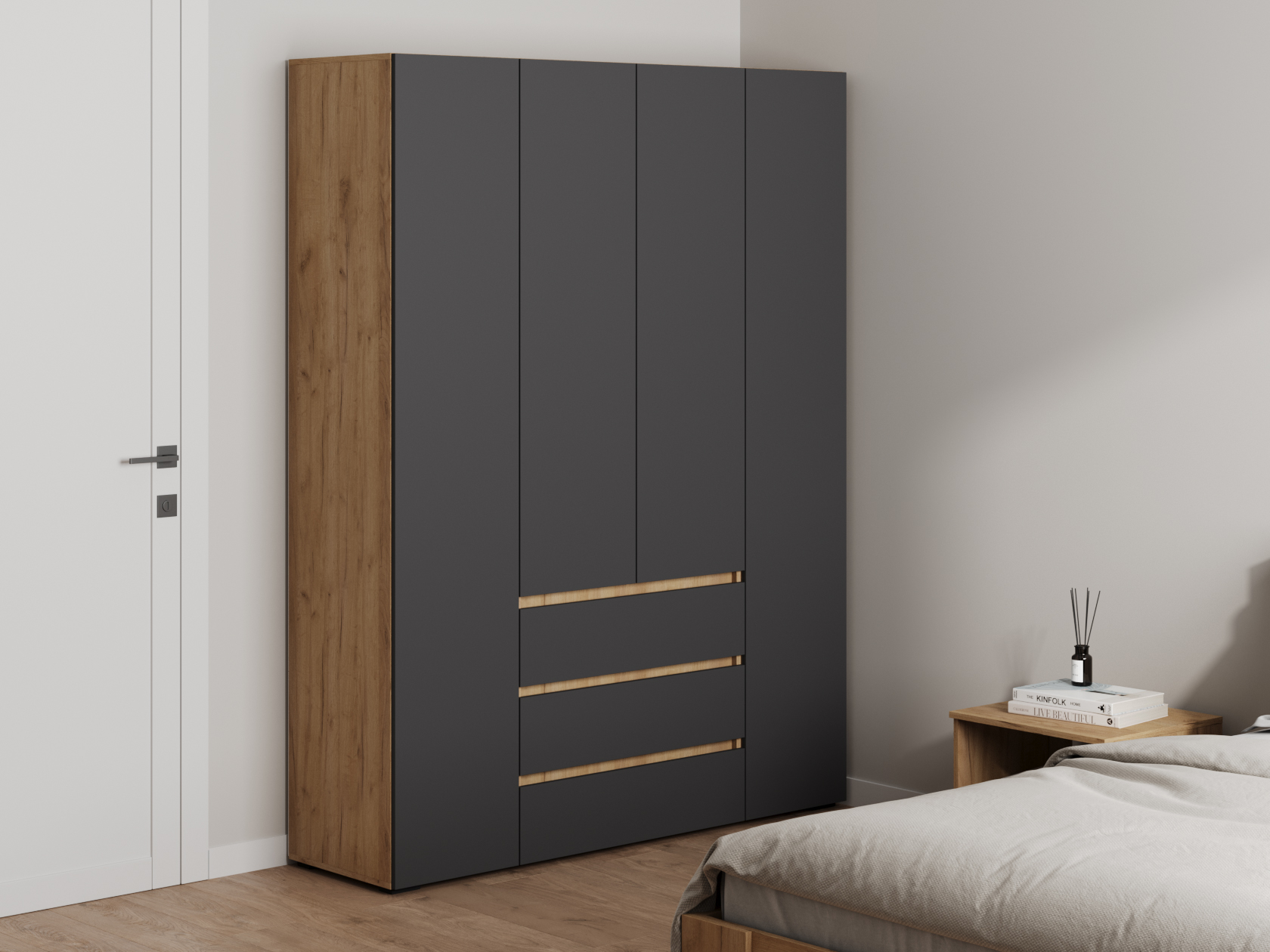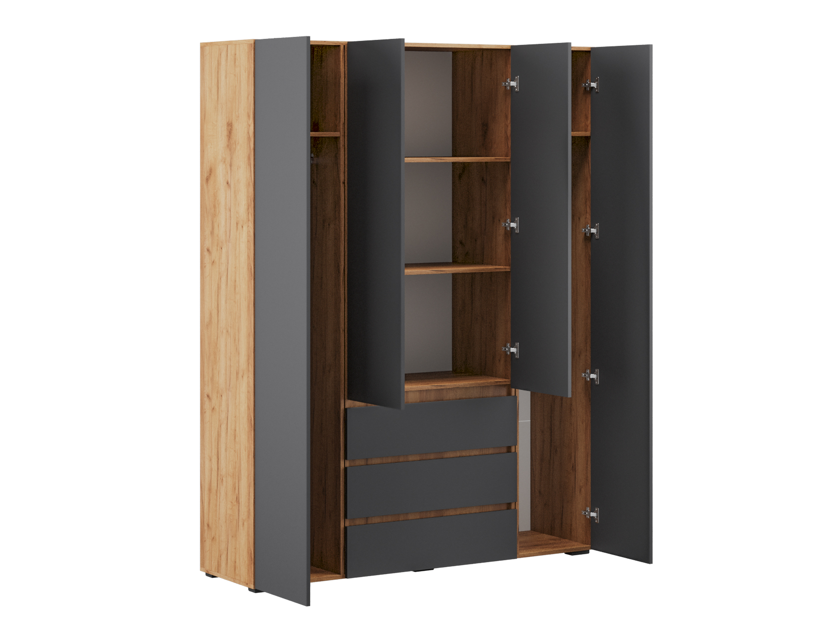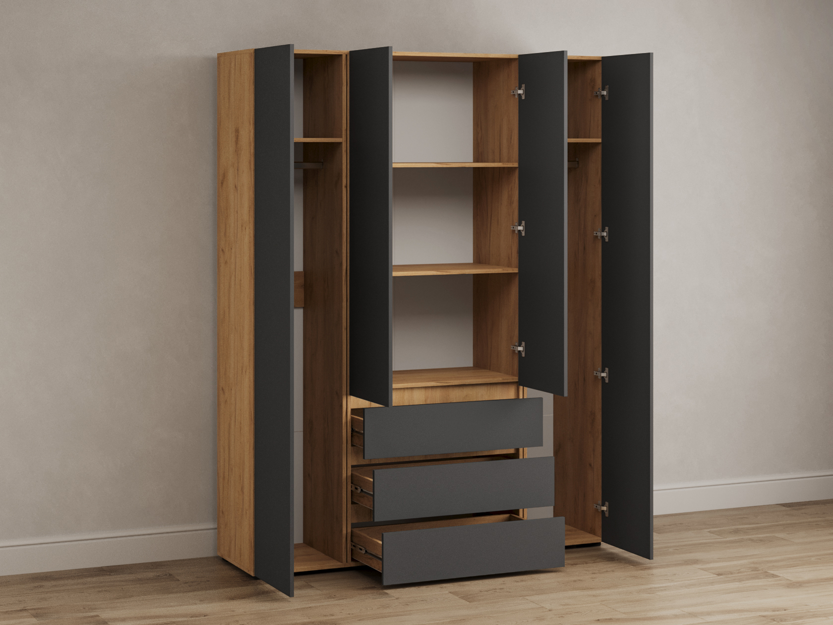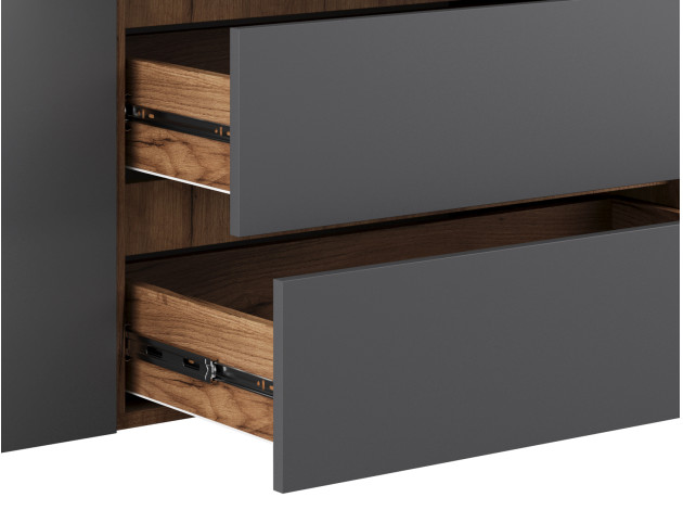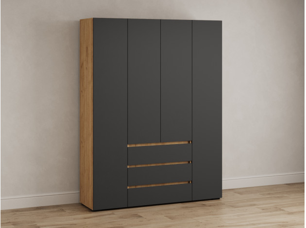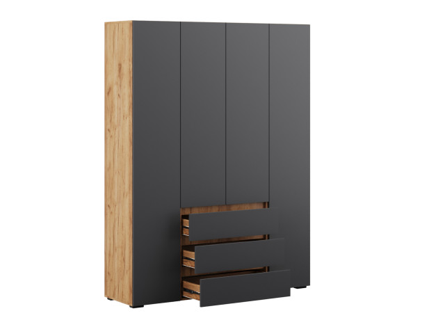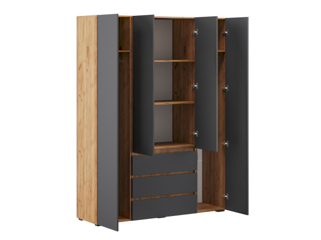 Распашной шкаф Элли — простой способ разместить гардероб, сэкономив пространство комнаты. Благодаря небольшой глубине модель помещается даже в узком проходе, а продуманное наполнение помогает организовать удобное хранение повседневной одежды. Ящики и дверцы открываются за выступающий край фасада.