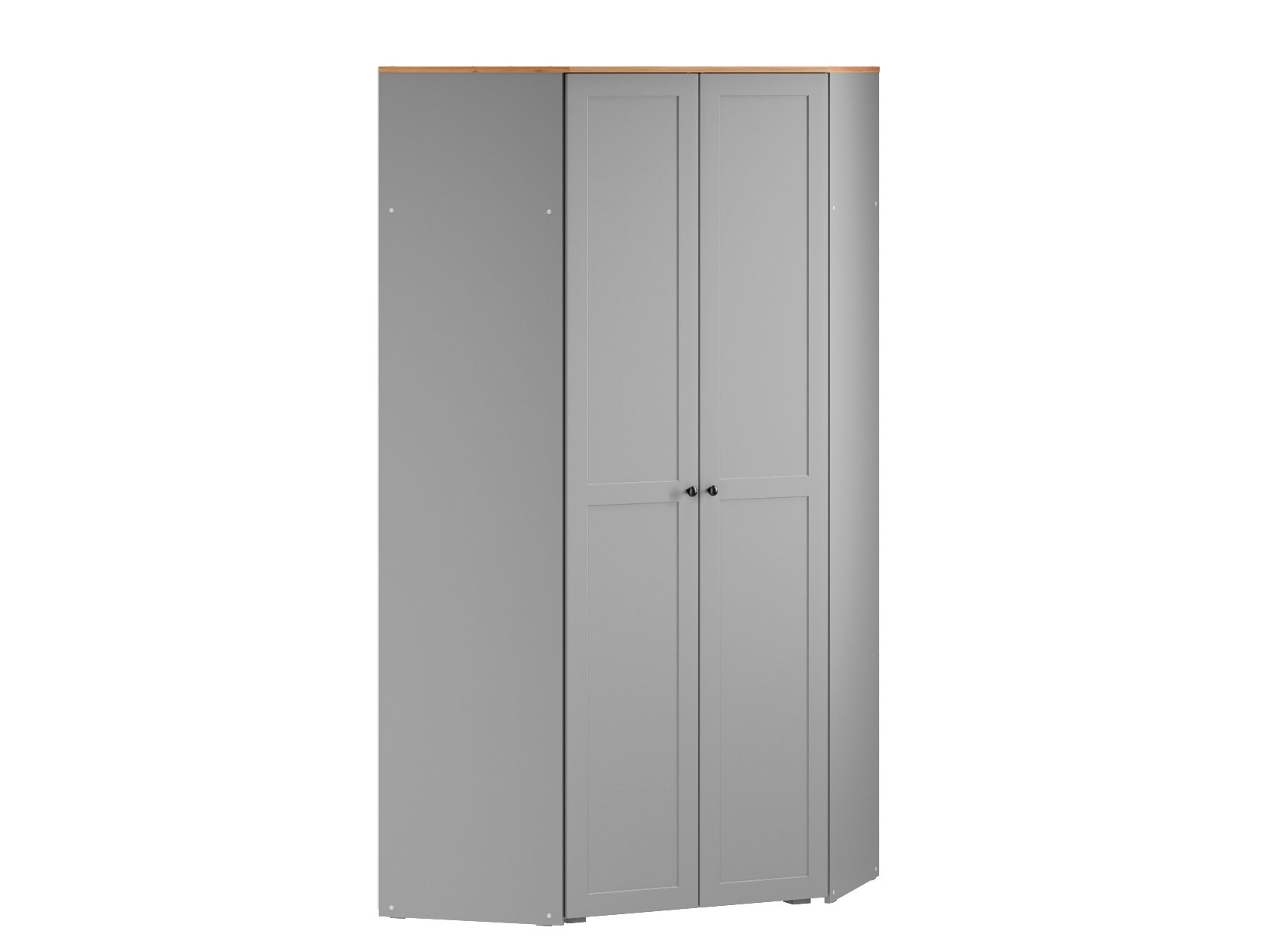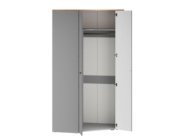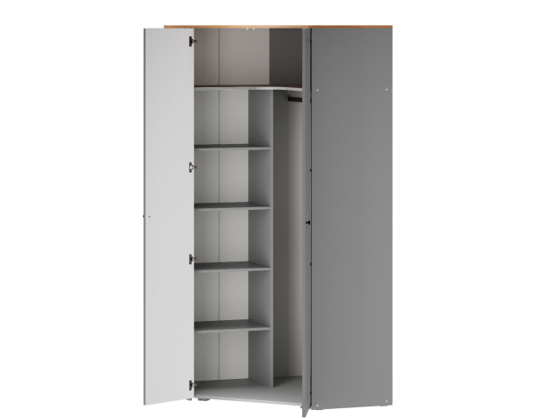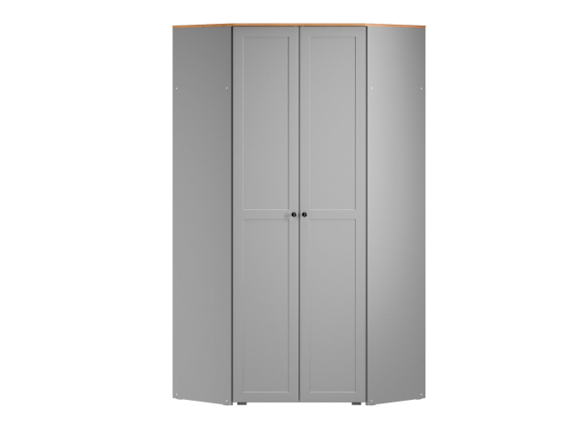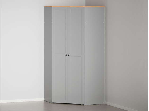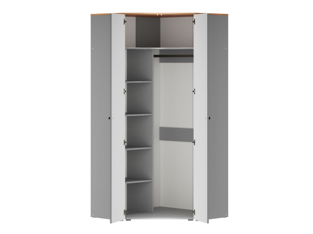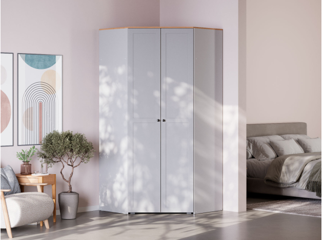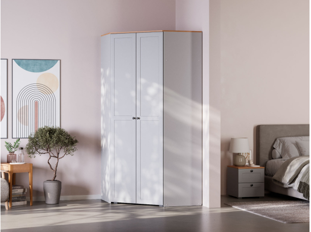 Угловой шкаф Хеминг станет полноценной системой хранения всех предметов гардероба, аксессуаров и различных мелочей. Благодаря особенностям конструкции модель позволяет сэкономить полезную площадь комнаты. За глухими распашными дверцами скрываются штанга для плечиков, полки и глубокая антресольная ниша для объемных вещей.