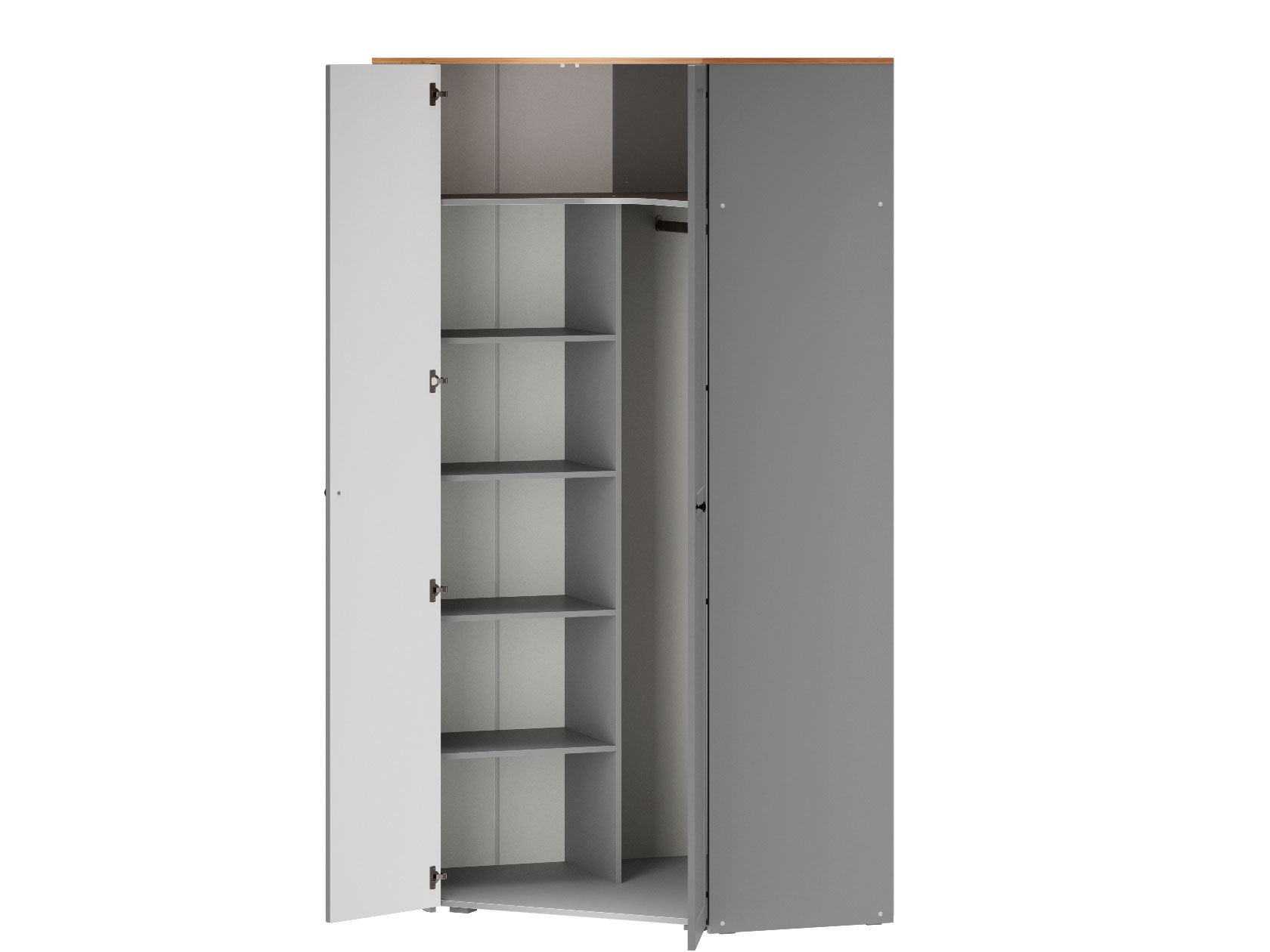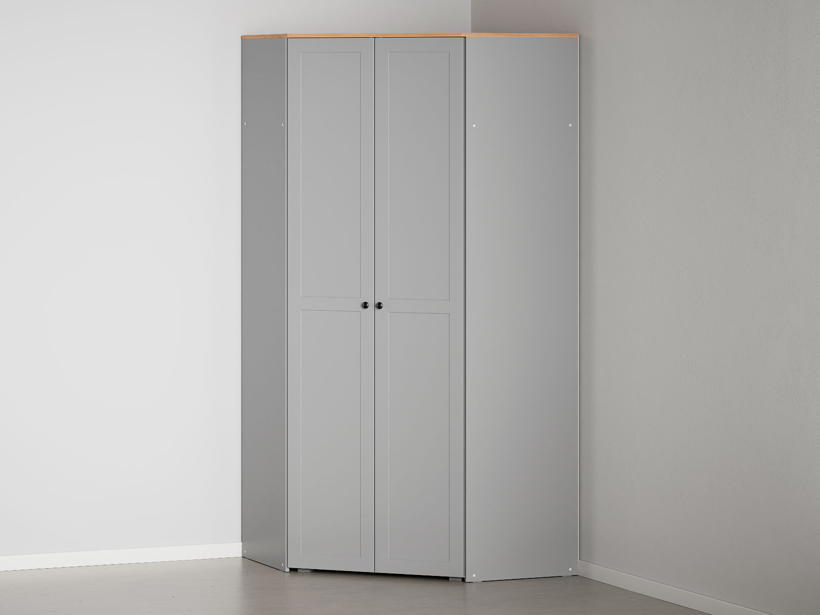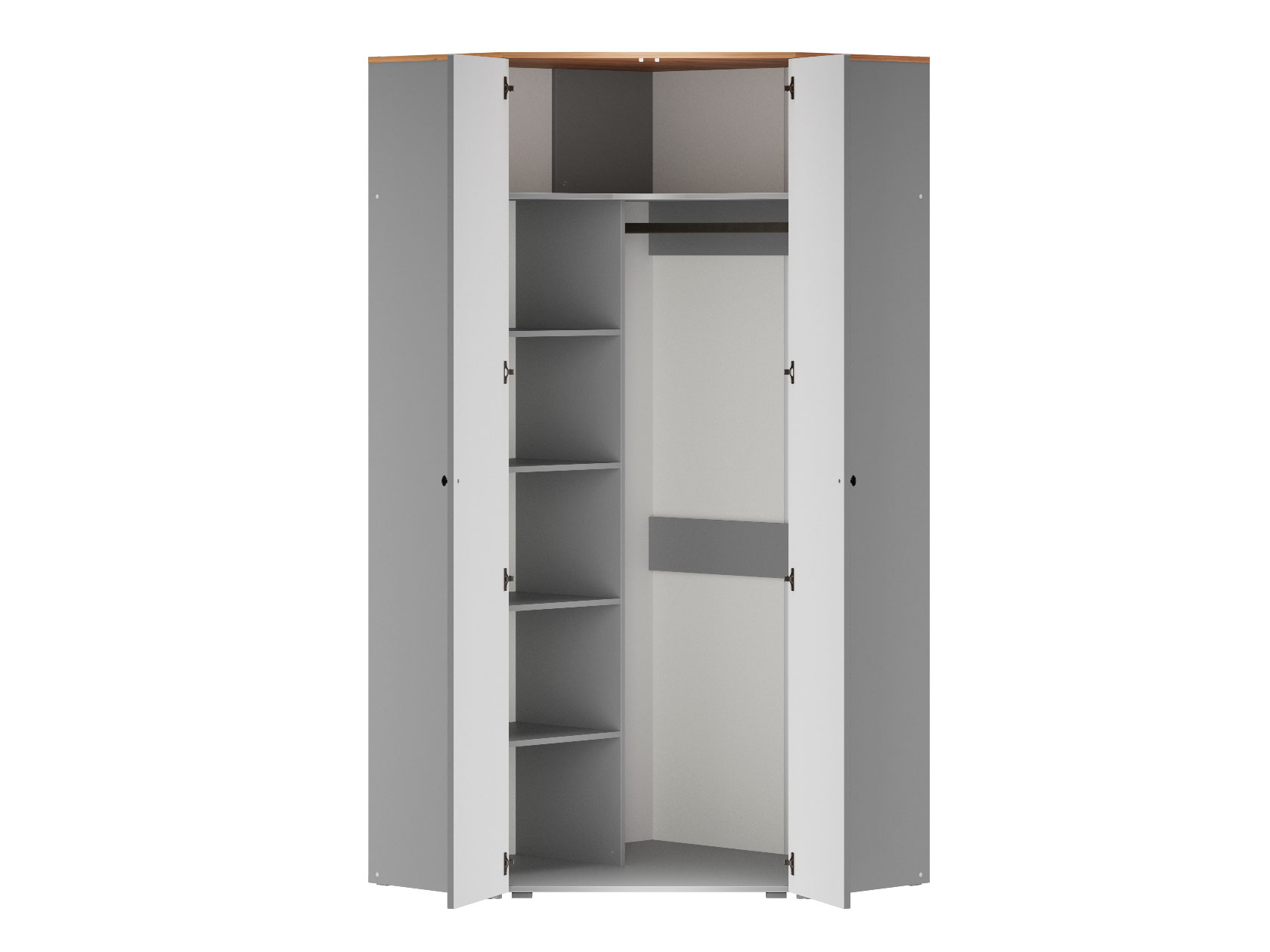 Угловой шкаф Хеминг станет полноценной системой хранения всех предметов гардероба, аксессуаров и различных мелочей. Благодаря особенностям конструкции модель позволяет сэкономить полезную площадь комнаты. За глухими распашными дверцами скрываются штанга для плечиков, полки и глубокая антресольная ниша для объемных вещей.