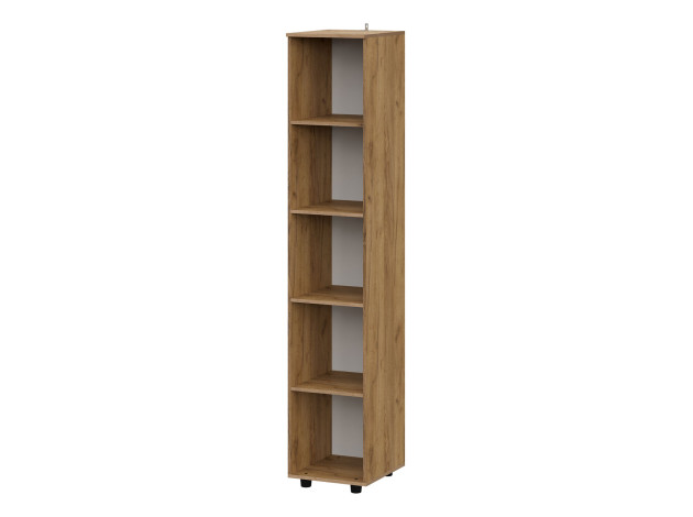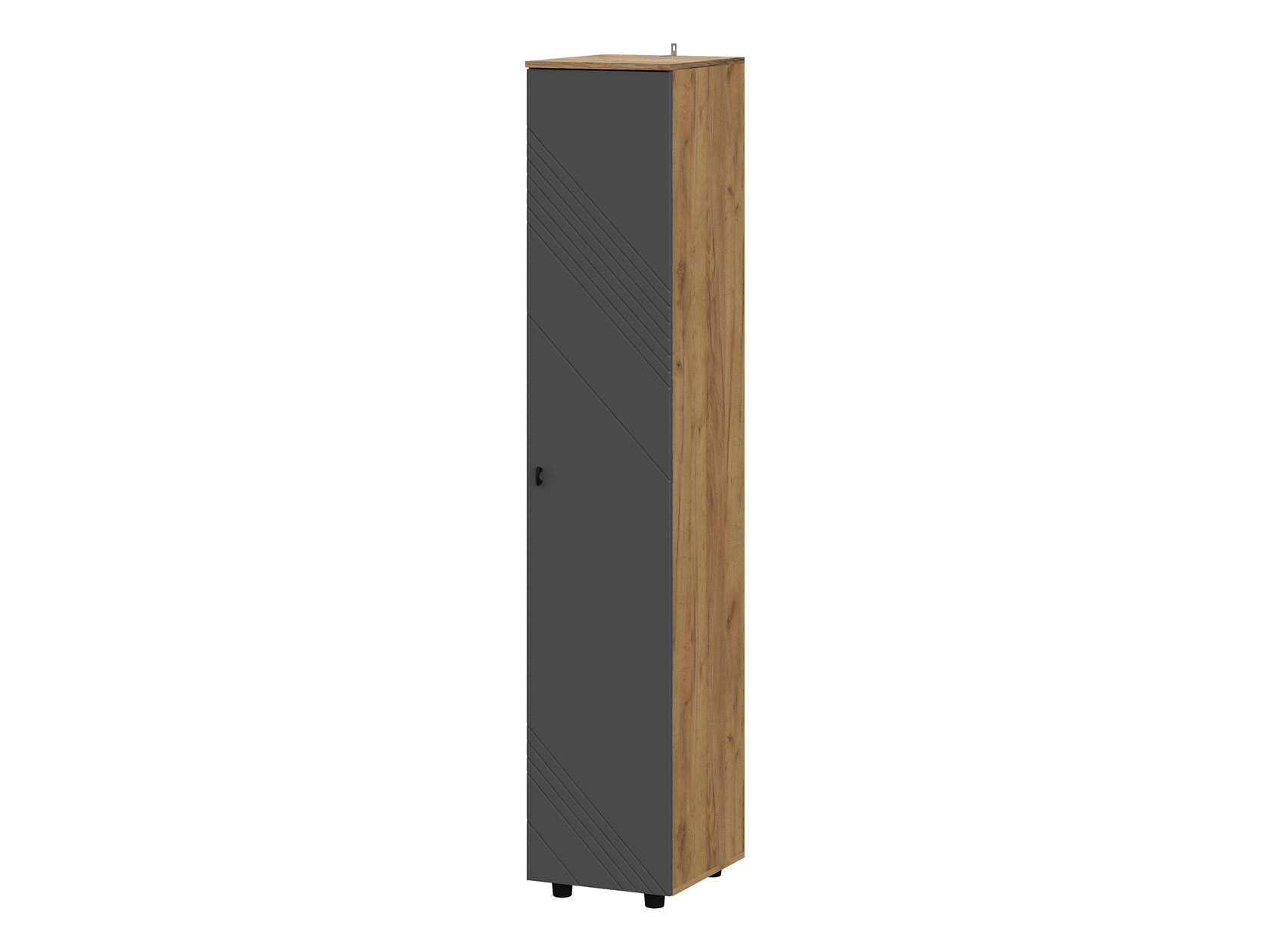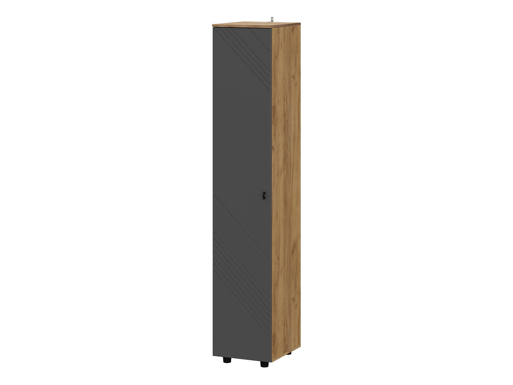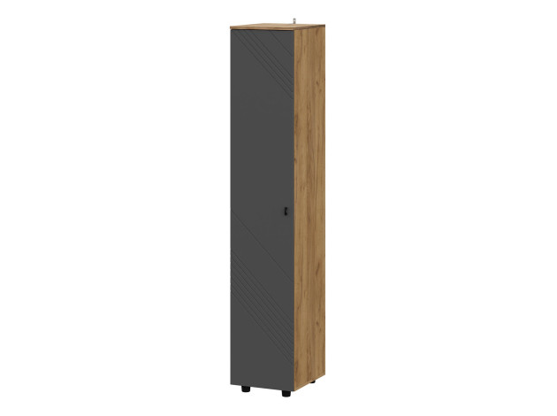 Шкаф-пенал Кайло станет незаменимым помощником в хранении различных вещей. Пространство внутри представлено полками для удобного размещения одежды, белья и аксессуаров. Фасад с декоративной фрезеровкой в виде наклонных линий сочетается с текстурой дерева. Такой дизайн подчеркивает современный облик мебели.