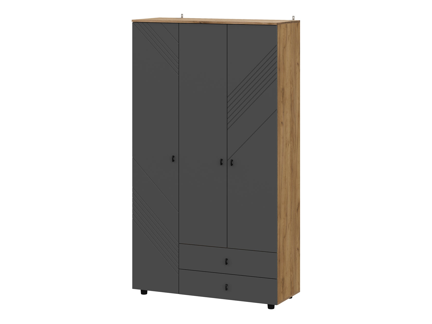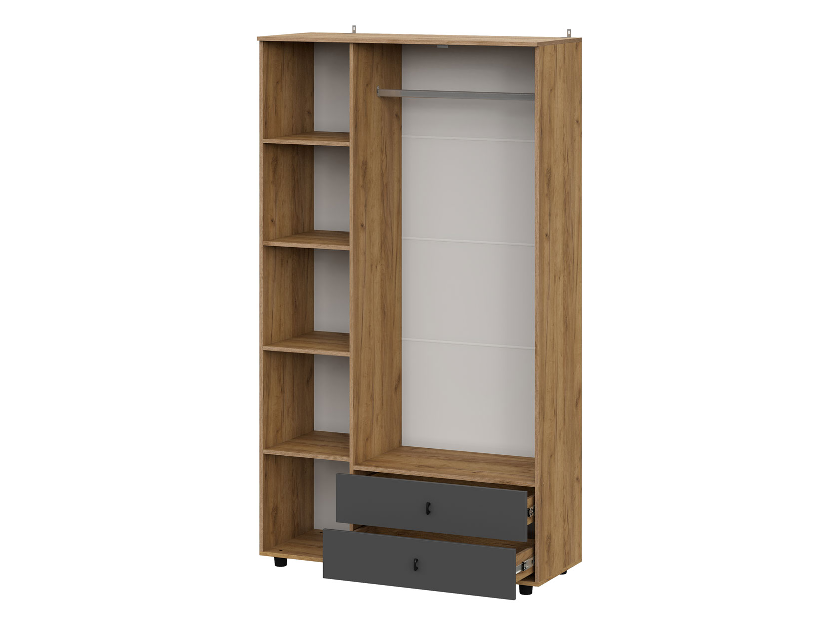 Распашной шкаф Кайло Комби — вместительное решение для хранения различных вещей: от белья до аксессуаров. Разноплановое наполнение позволяет распределить одежду по категориям и легко поддерживать порядок в комнате. Матовые фасады с фрезеровкой удачно сочетаются с текстурой дерева. Небольшие опоры обеспечивают мебели устойчивость на полу с неровностями.
