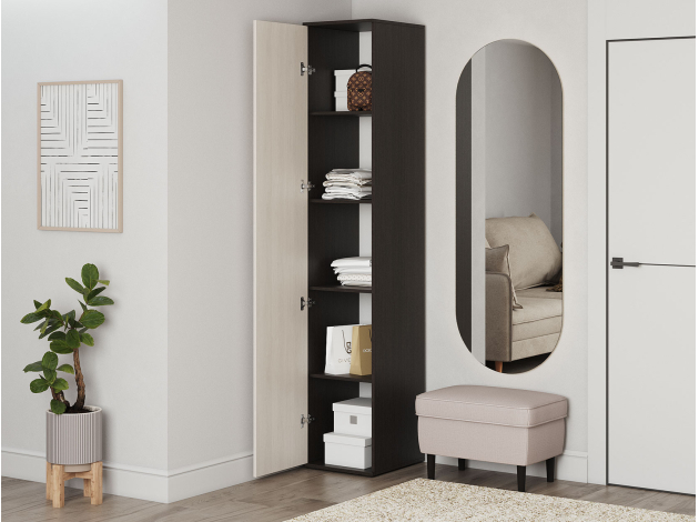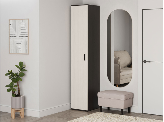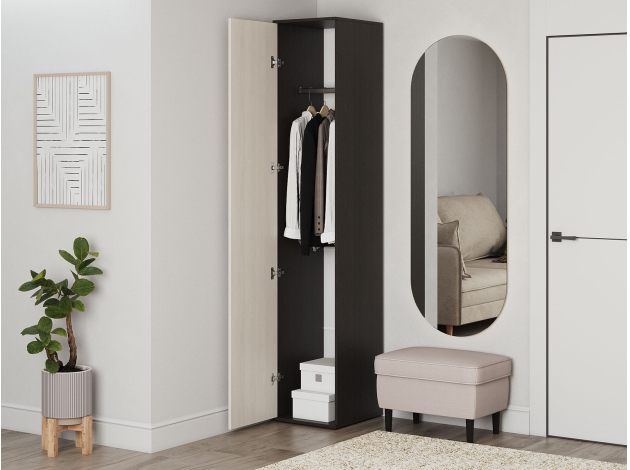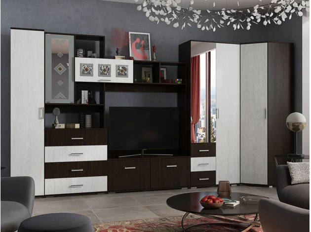 Распашной шкаф Белла расширяет функционал гостиной. В нишах много места для хранения одежды и постельного белья. Популярное сочетание оттенков позволяет вписать модель в любой интерьер.