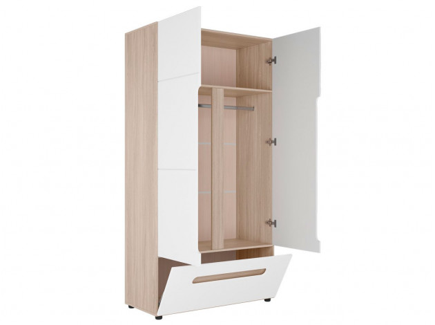 Необычный образ распашного шкафа Палермо С исполнен в стиле минимализм, но при этом обладает незаурядным функционалом. За дверцами расположилась удобная штанга для вешалок с одеждой, а также антресольная полка для головных уборов и сумок. В нижней части имеется ящик, в котором будет удобно хранить как обувь, так и аксессуары.