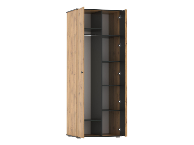 Платяной шкаф Либерти станет практичным и стильным решением для организации системы хранения в современном интерьере. Отделение со штангой и полки позволяют распределить одежду по разным категориям. Текстура дерева и реечный фасад придают обстановке уют и динамичность.