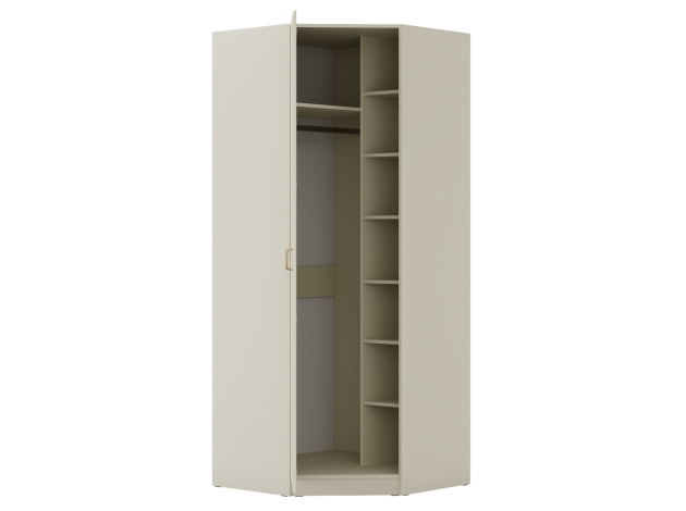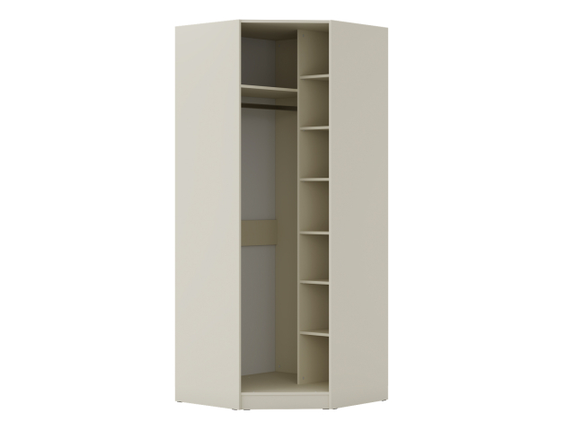 Угловой шкаф Лорето станет незаменимым помощником в организации удобной системы хранения. Вместительная конструкция с полками и штангой позволяет рационально расположить книги, посуду, коробки с аксессуарами и личные вещи. Рамочный фасад поддерживает лаконичный и одновременно элегантный облик мебели.