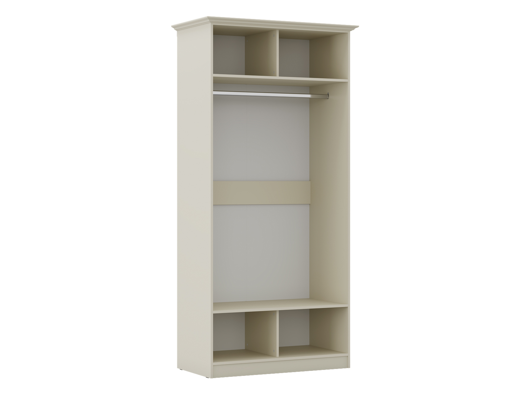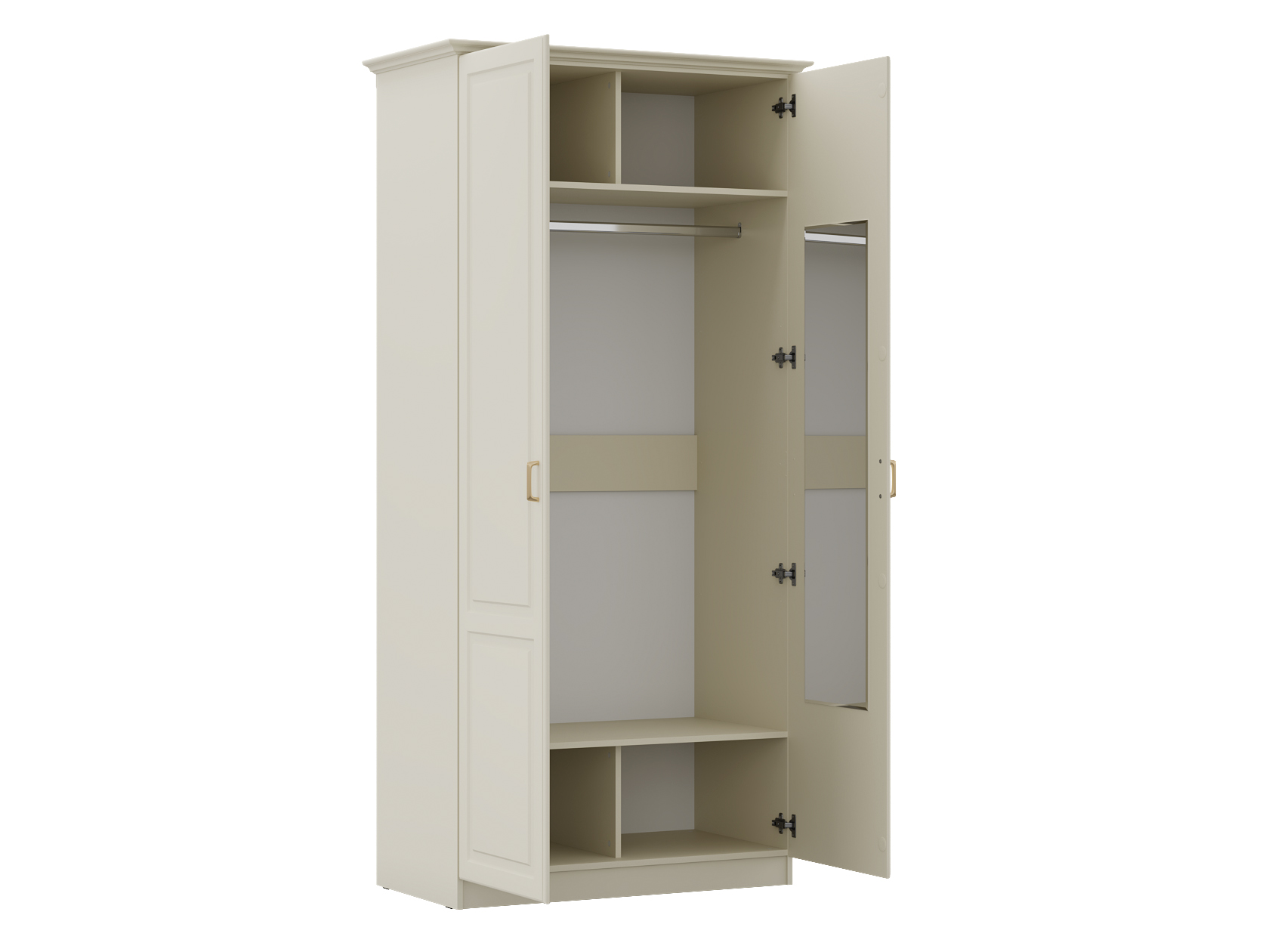 Распашной шкаф Лорето — идеальный вариант для хранения различных предметов гардероба: от одежды на плечиках до белья и аксессуаров. Отделение со штангой и удобные полки в верхней и нижней части шкафа помогут распределить вещи, которые требуются редко или по сезону. Поверхность фасадов дополнена элегантными рамками и ручками золотистого цвета, что придает мебели особую привлекательность.