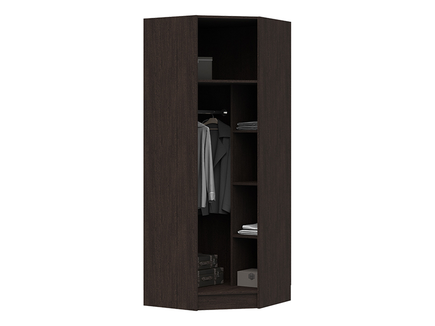 Угловой шкаф Макарена станет незаменимым элементом в организации продуманной системы хранения. Вместительная модель позволяет распределить все категории вещей: от белья до шляпных и обувных коробок. Отделение со штангой поможет аккуратно развесить одежду на плечиках, а глубокая антресольная полка предоставит пространство для сезонных аксессуаров.