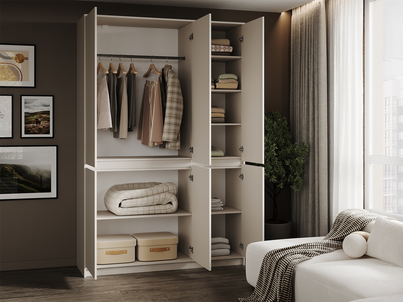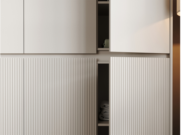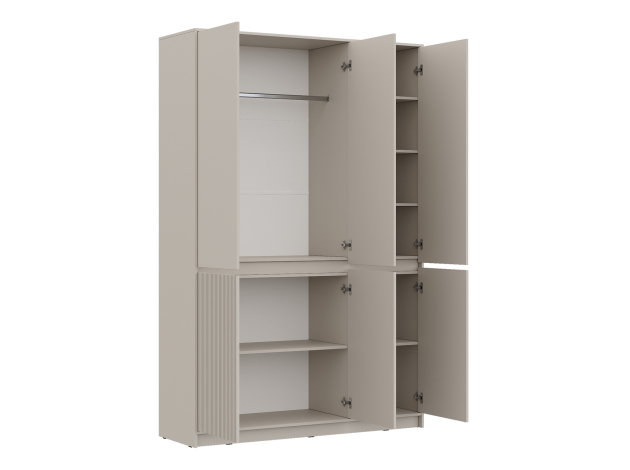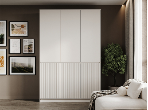 Распашной шкаф Мирен — практичный и элегантный способ держать в порядке все предметы гардероба. Внутреннее наполнение представлено штангой для плечиков и удобными полками разных размеров, что позволяет распределить одежду по категориям, а также разместить коробки и чемоданы. Стильная волнообразная фрезеровка и лаконичный дизайн без выступающих ручек подчеркивает современный облик модели.