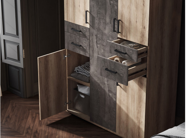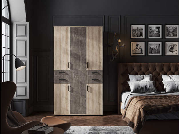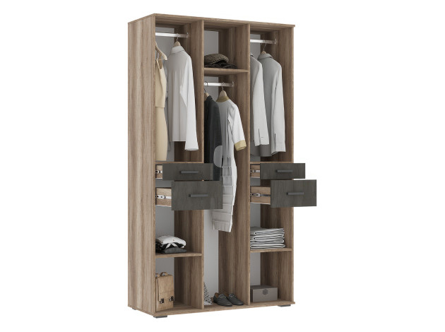 Распашной шкаф Нельсон 2 — лаконичная модель с продуманным наполнением. Несколько разных по высоте ниш позволят аккуратно развесить одежду любой длины, а ящики по центру — хранить небольшие предметы повседневного гардероба. Оформление фасадов достаточно лаконичное, поэтому шкаф удачно сочетается с большинством современных интерьеров.