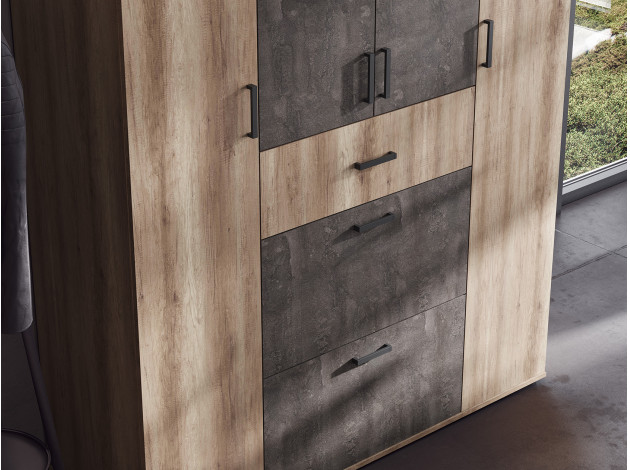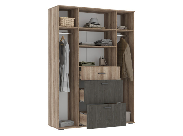 Распашной шкаф Нельсон 3 удобно разместит все предметы гардероба. В нишах со штангами можно аккуратно развесить одежду любой длины, а в ящиках — хранить объемный трикотаж, белье и аксессуары. Такое наполнение поможет поддерживать порядок и легко находить нужную вещь.