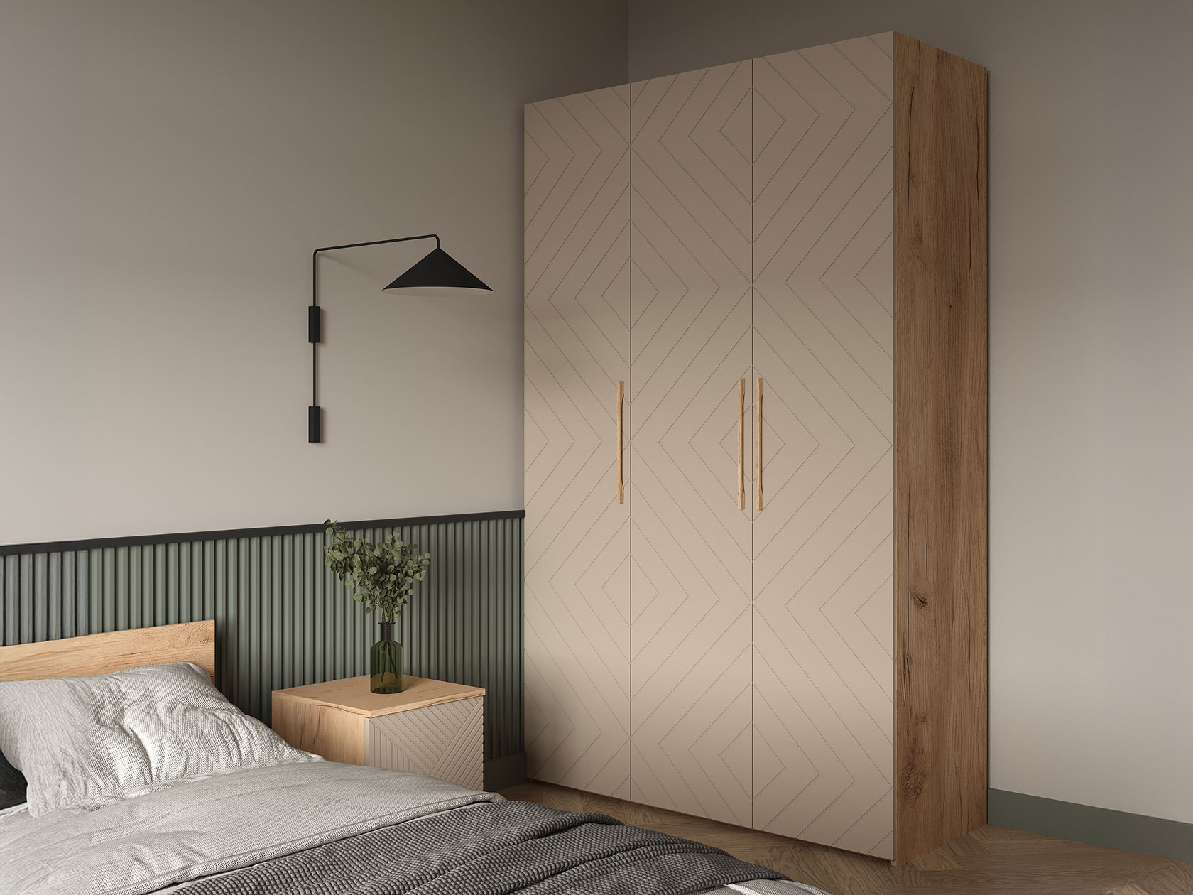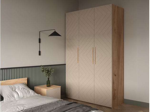 Распашной шкаф Ньерд 3 двери станет практичным дополнением обстановки. Вместительная конструкция позволит хранить одежду любой длины и аккуратно сложить повседневные предметы гардероба. Деревянные ручки и необычная фрезеровка гармонично дополняют модель и дают возможность органично интегрировать шкаф в любой современный интерьер.