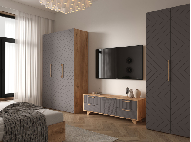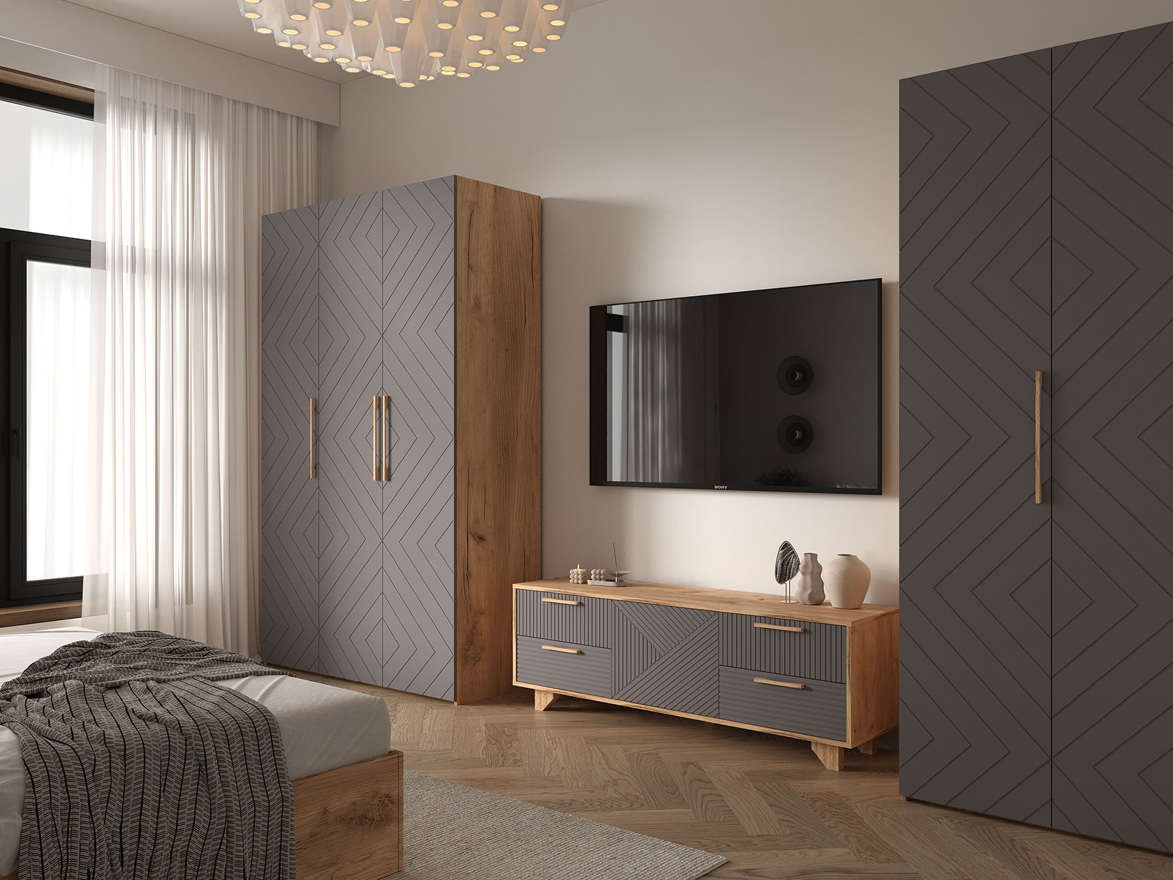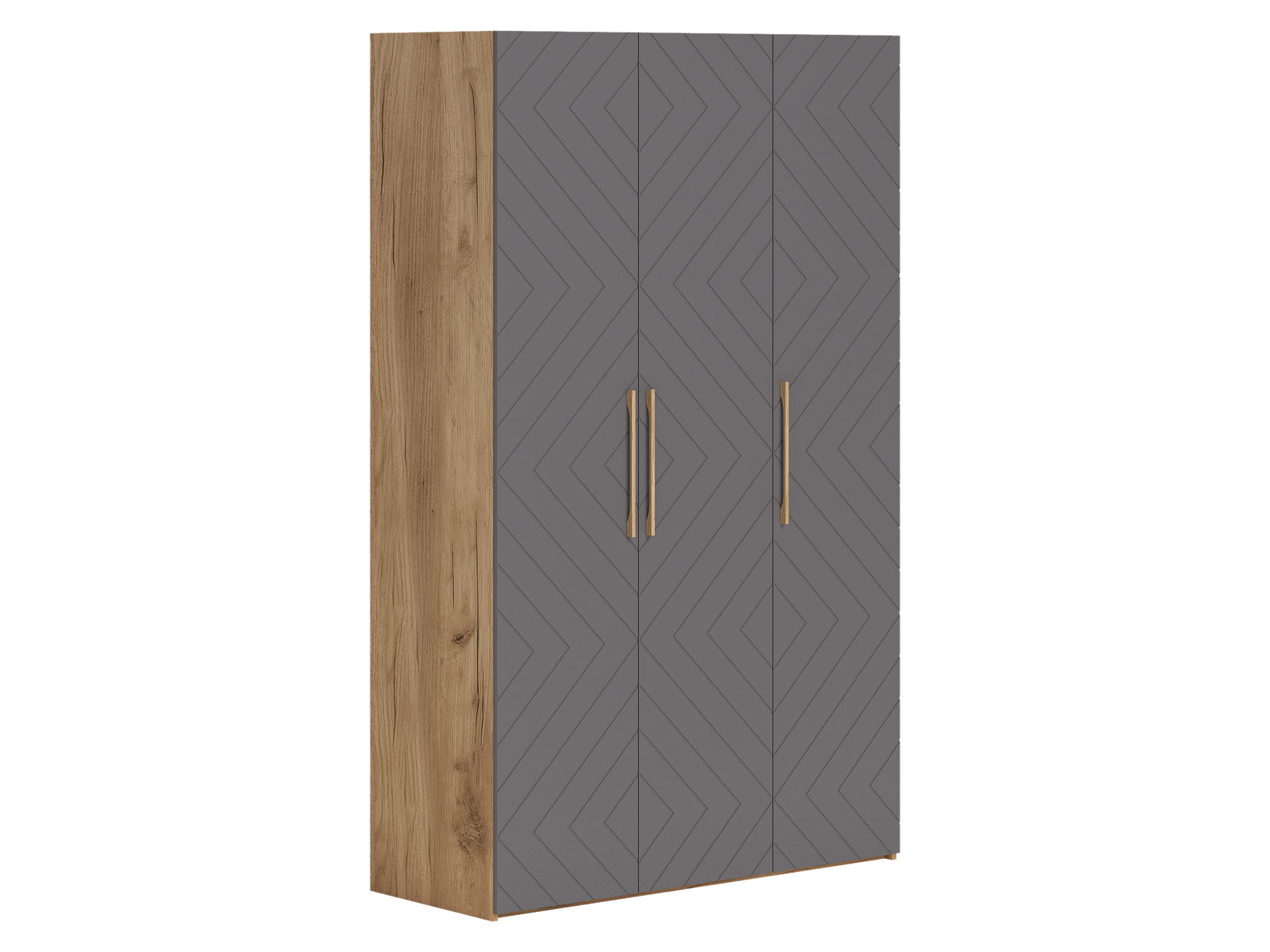 Распашной шкаф Ньерд 3 двери станет практичным дополнением обстановки. Вместительная конструкция позволит хранить одежду любой длины и аккуратно сложить повседневные предметы гардероба. Деревянные ручки и необычная фрезеровка гармонично дополняют модель и дают возможность органично интегрировать шкаф в любой современный интерьер.