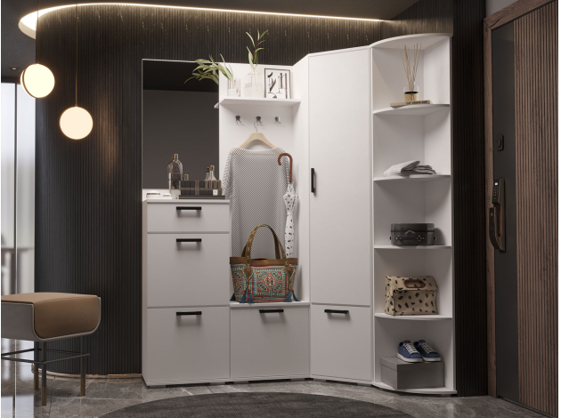 Распашной шкаф Ника станет функциональной частью гарнитура, дополнив интерьер прихожей, спальни или гостиной. Угловая конфигурация подходит для оптимального использования пространства. Модель предлагает достаточно места для хранения одежды, обуви, головных уборов и аксессуаров.