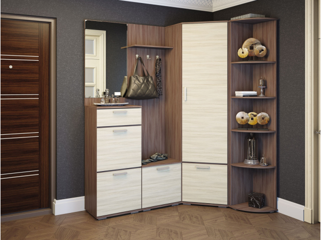 Распашной шкаф Ника станет функциональной частью гарнитура, дополнив интерьер прихожей, спальни или гостиной. Угловая конфигурация подходит для оптимального использования пространства. Модель предлагает достаточно места для хранения одежды, обуви, головных уборов и аксессуаров.