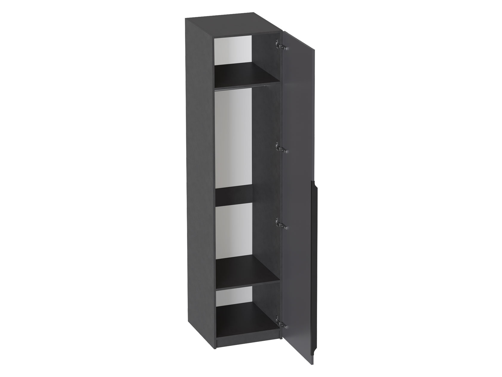 Пенал Нора станет практичным дополнением системы хранения. В нише со штангой можно аккуратно развесить одежду из деликатных тканей, а на полках — разместить вещи, которые удобно держать в сложенном виде. Рельефный фасад украшен лаконичной продолговатой ручкой. Такой дизайн отлично сочетается с разными стилями меблировки.