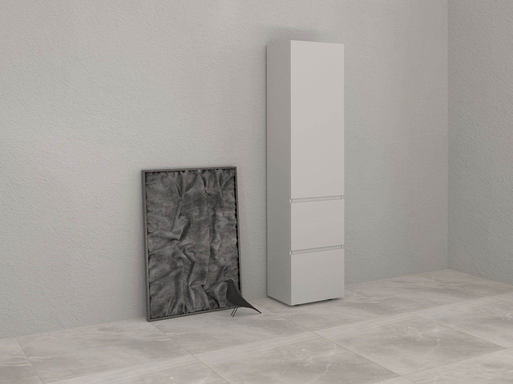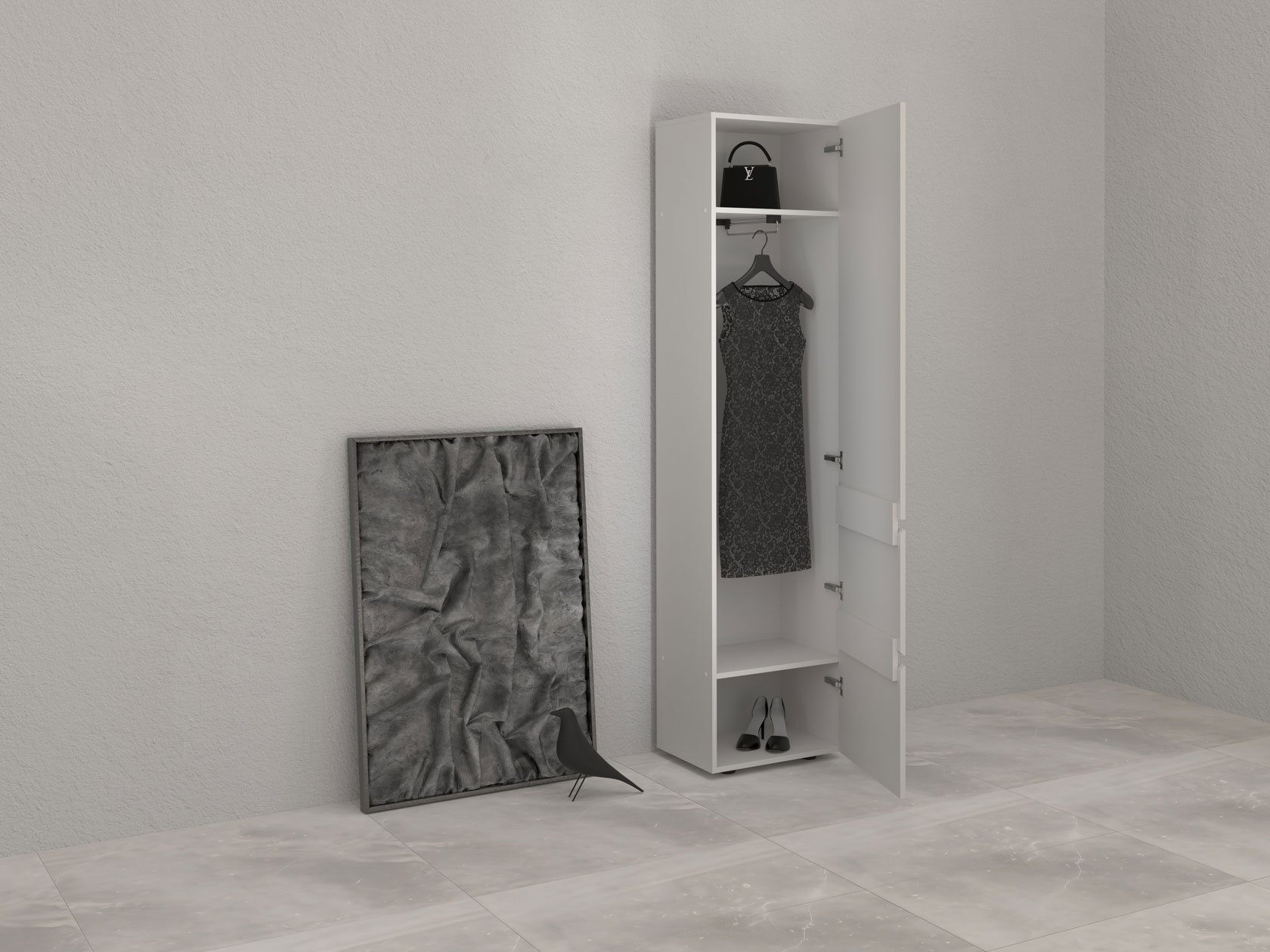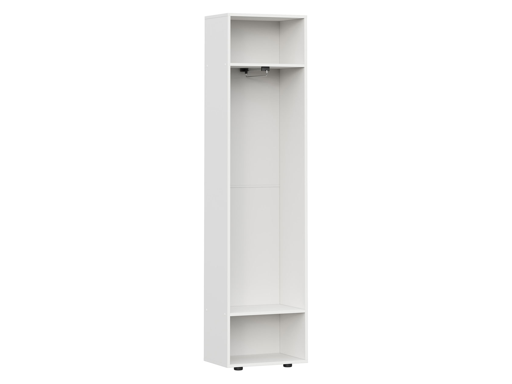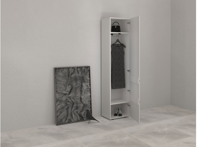 Шкаф-пенал Одри — компактная, но очень удобная и функциональная модель. Полки позволят распределить одежду и аксессуары так, чтобы легко находить нужную вещь даже в спешке. На фасадах нет лицевой фурнитуры, что создает минималистичный облик мебели. Дверца открывается за фрезерованную выемку.
