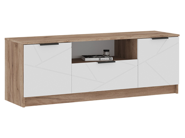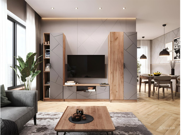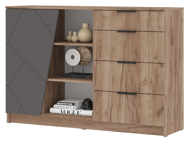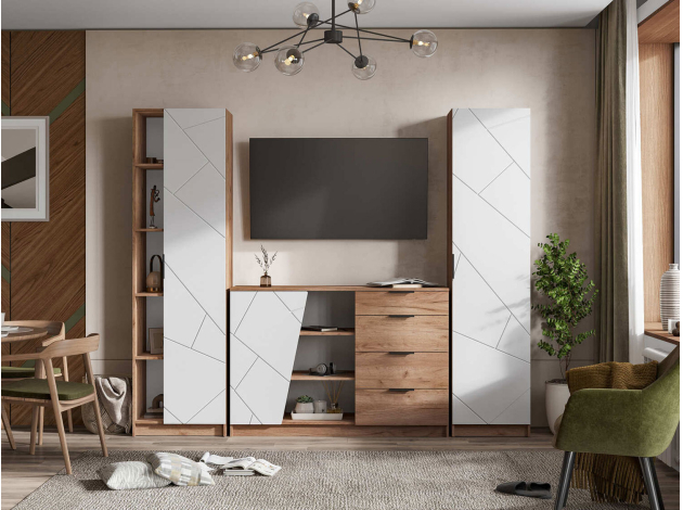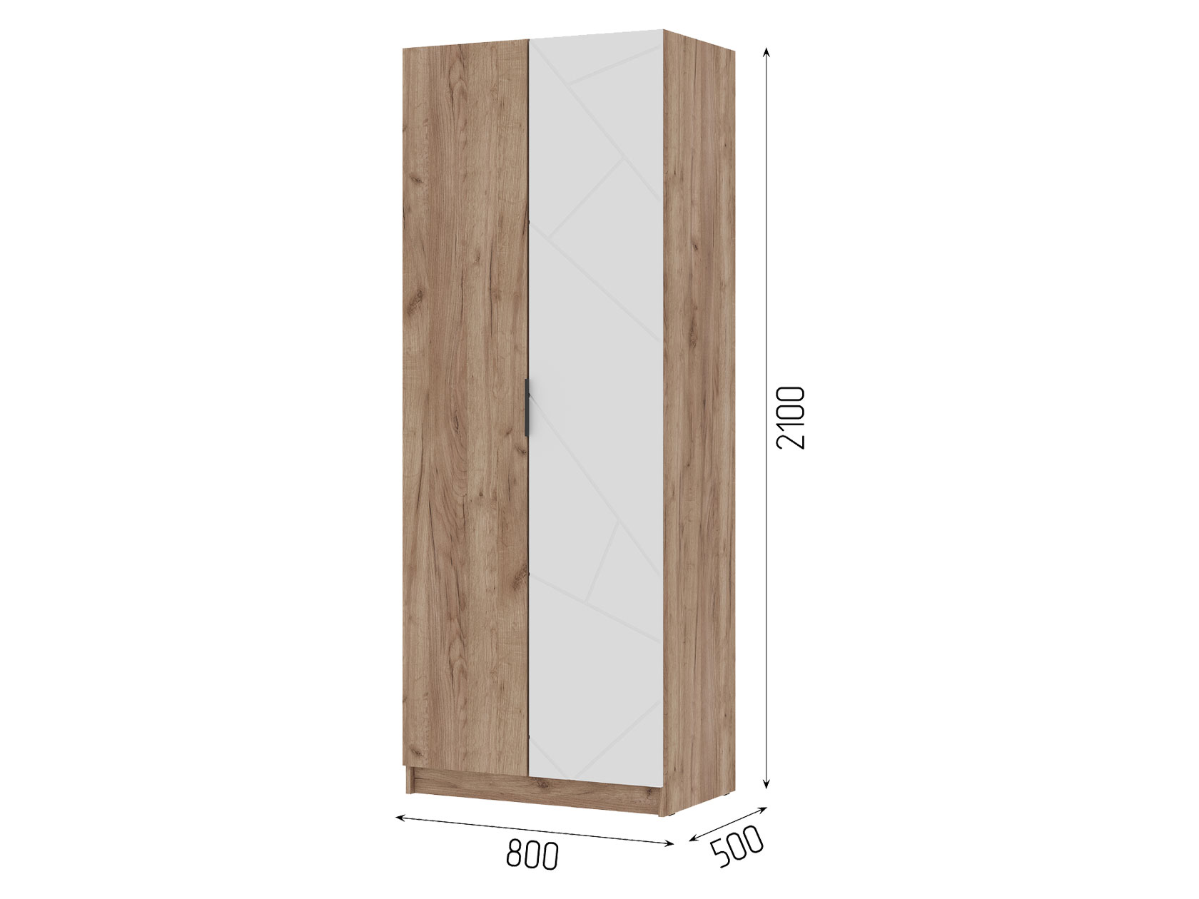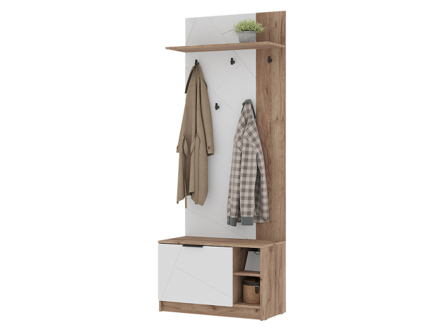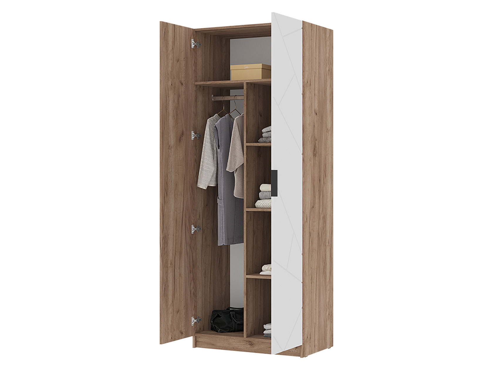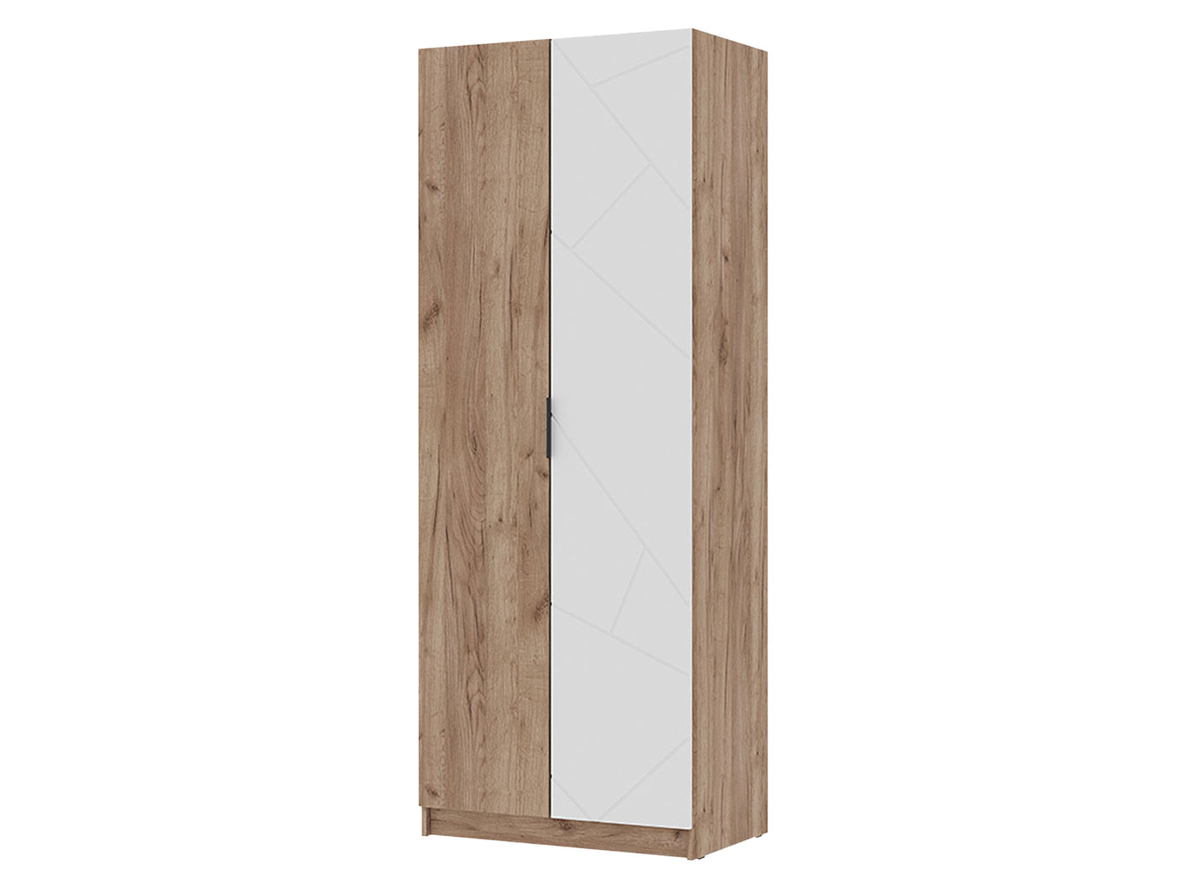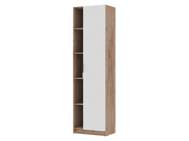 Распашной шкаф Орегон Дуо расширит систему хранения и дополнит интерьер любой комнаты. Внутреннее пространство включает отделение со штангой для плечиков и полки для повседневных и сезонных вещей. В дизайне фасадов использован геометрический узор, а в отделке корпуса — текстура дерева, что создает необычные акценты меблировки.