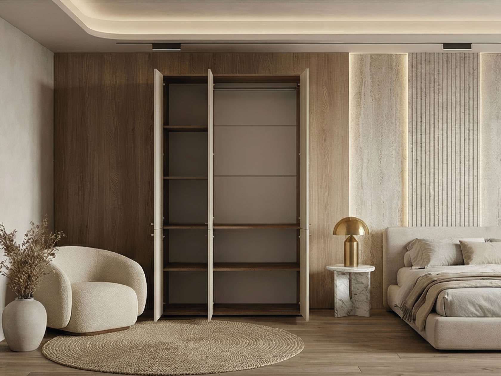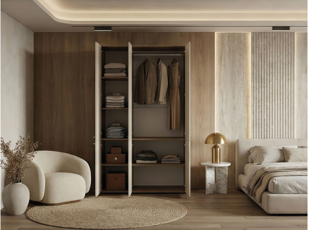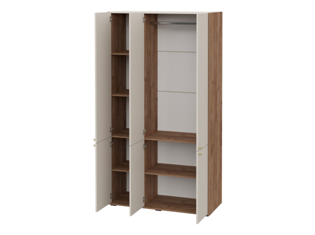 Распашной шкаф Орма Стандарт станет эстетичным дополнением обстановки и организует удобную систему хранения. Вместительная конструкция позволит распределить одежду любой длины и аккуратно сложить повседневные предметы гардероба. Сочетание текстуры дерева с матовыми фасадами и золотой фурнитурой дает возможность органично интегрировать модель в современный интерьер.