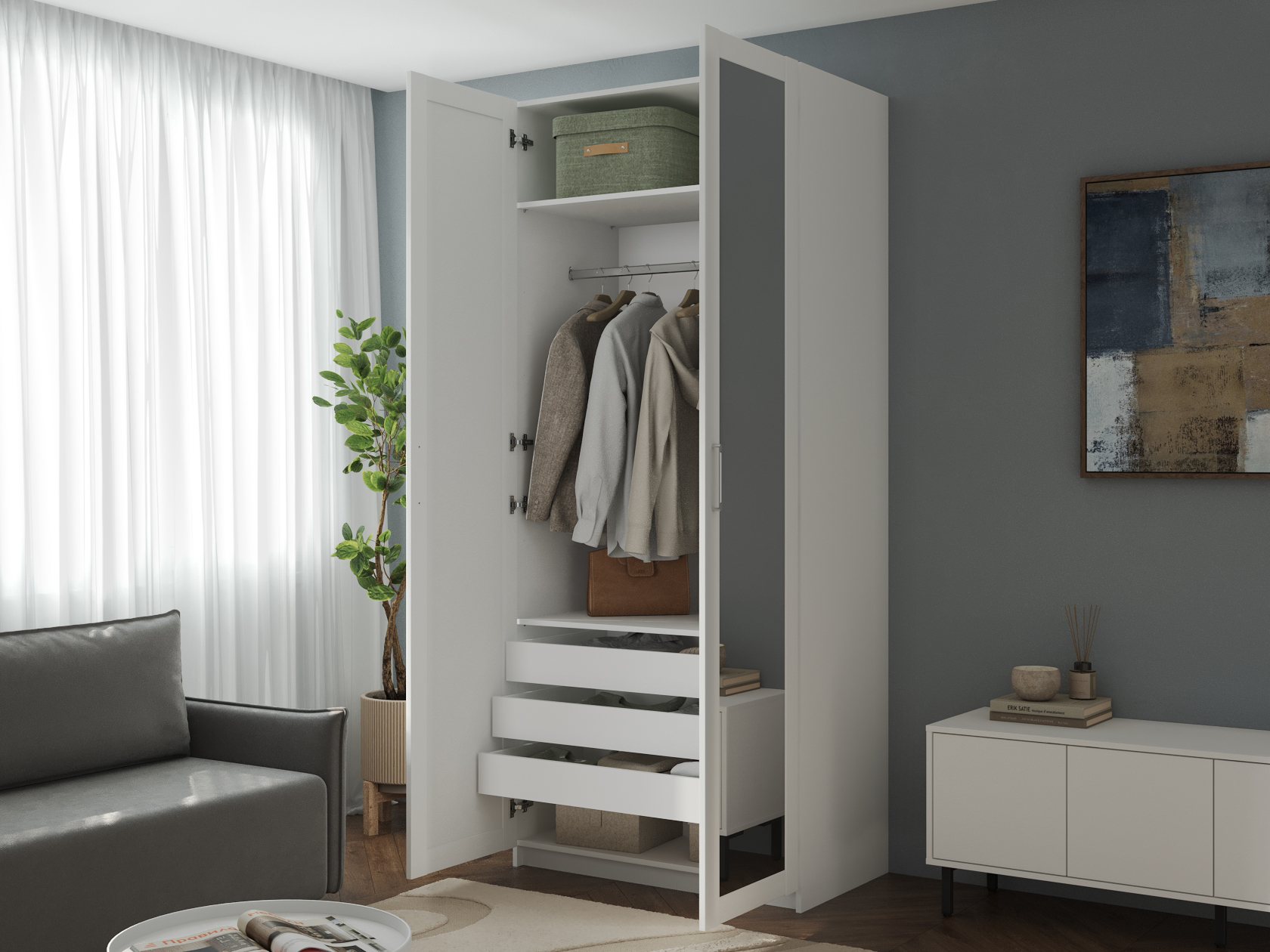 Распашной шкаф Осло Белый Со штангой, двумя полками и тремя ящиками