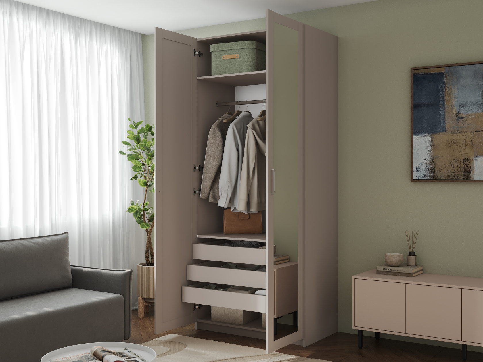 Распашной шкаф Осло Персидский жемчуг Со штангой, двумя полками и тремя ящиками