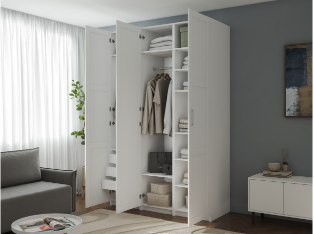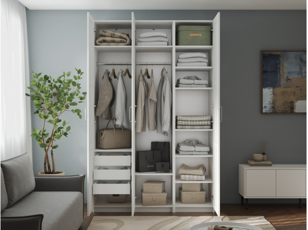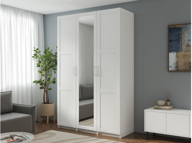 Распашной шкаф Осло Трио — практичное решение для тех, кто ценит уют и порядок в современном интерьере. Продуманное внутреннее пространство обеспечит легкий и удобный доступ к необходимым вещам. Полки, штанги и выдвижные ящики и помогут распределить одежду по категориям. Четкие линии и рамочные фасады с зеркальной вставкой создают ощущение простора и света.