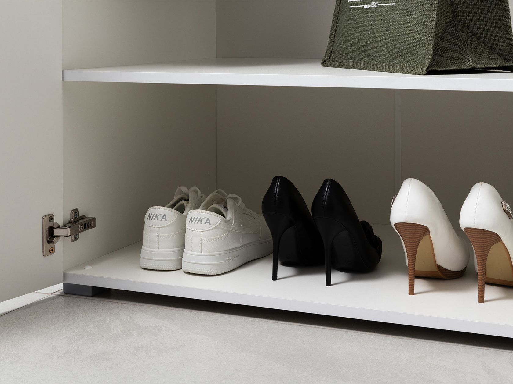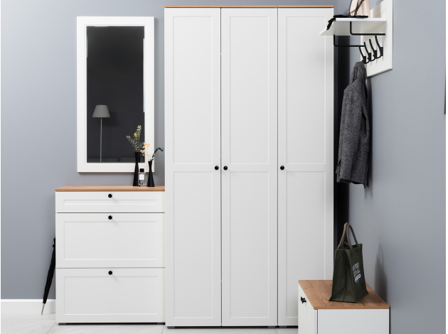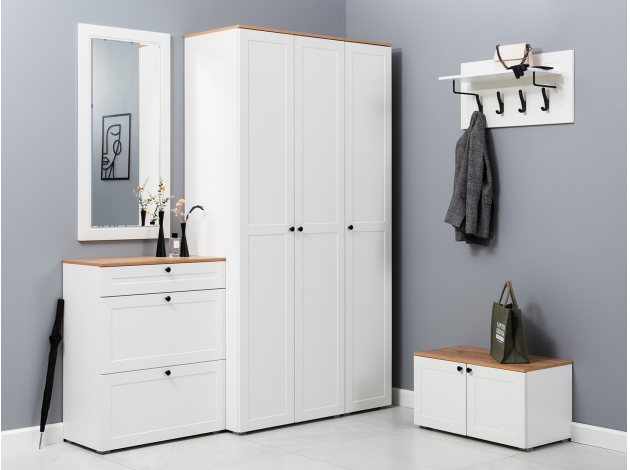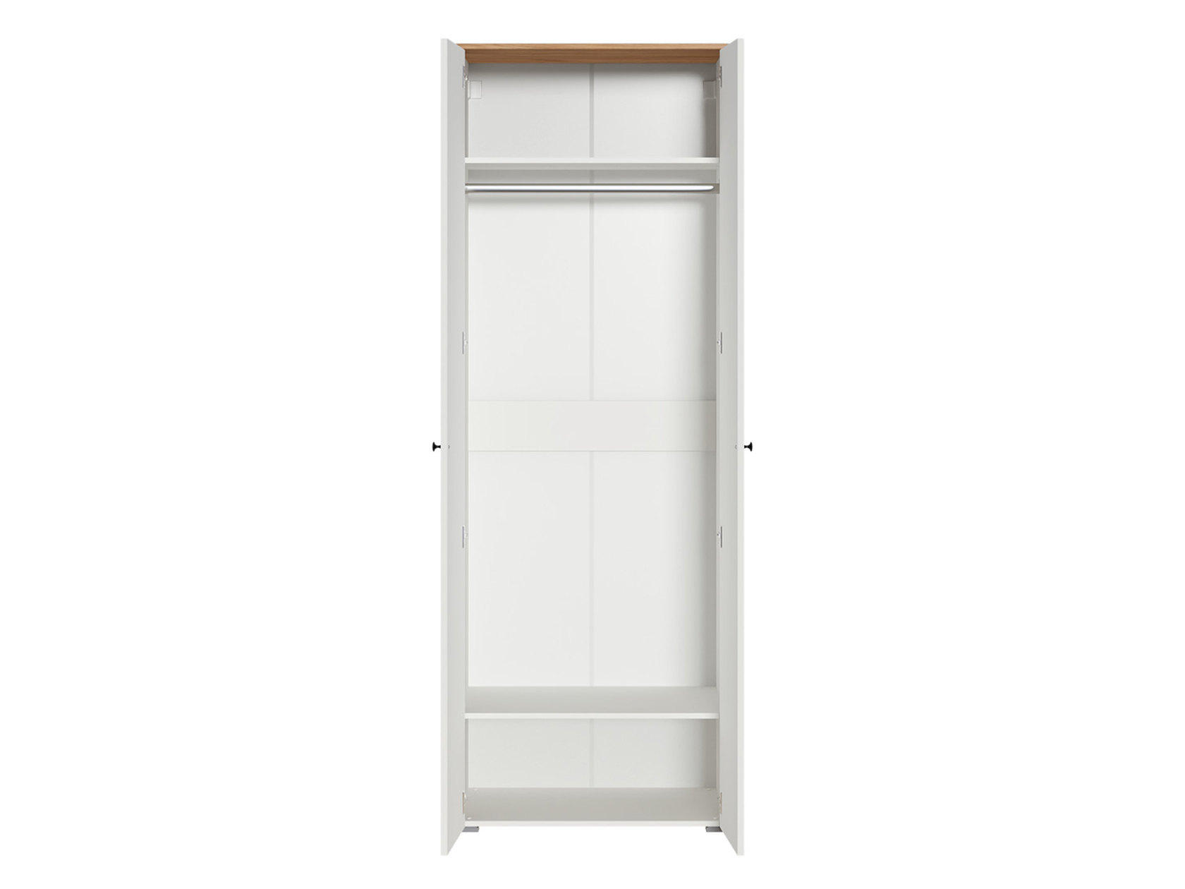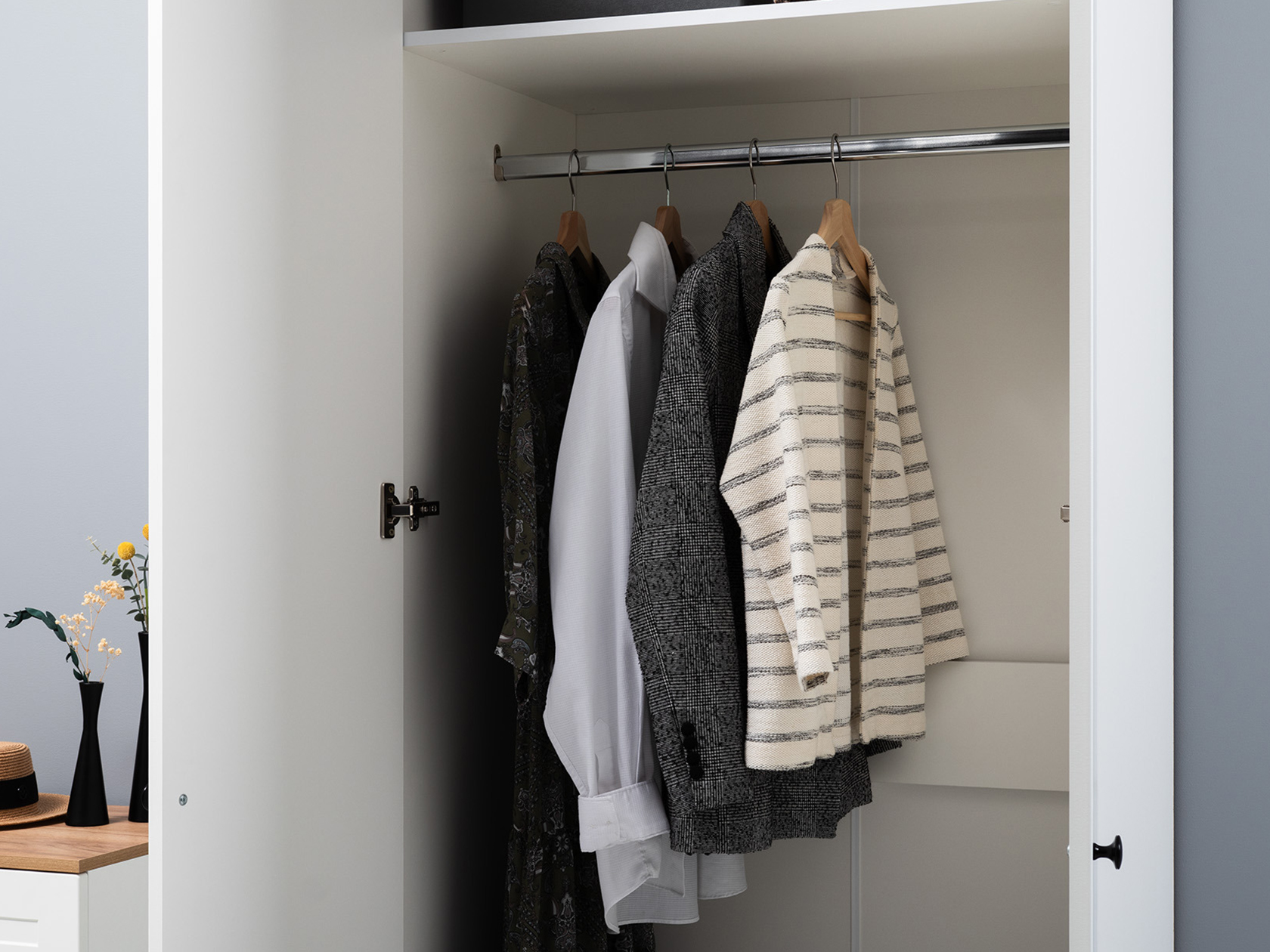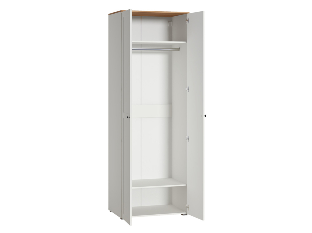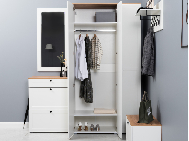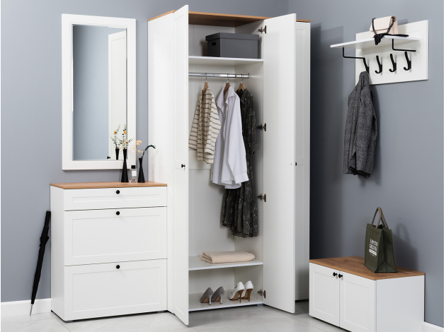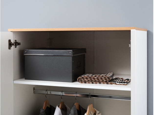Распашной шкаф Остин поможет организовать пространство для хранения гардероба. Внутреннее наполнение представлено продольной штангой для вешалок и полками для обуви и головных уборов. Опоры регулируются по высоте, что позволит разместить модель на полу с неровностями.