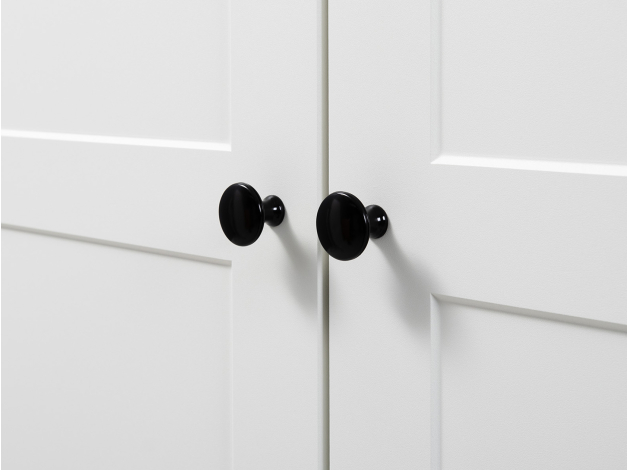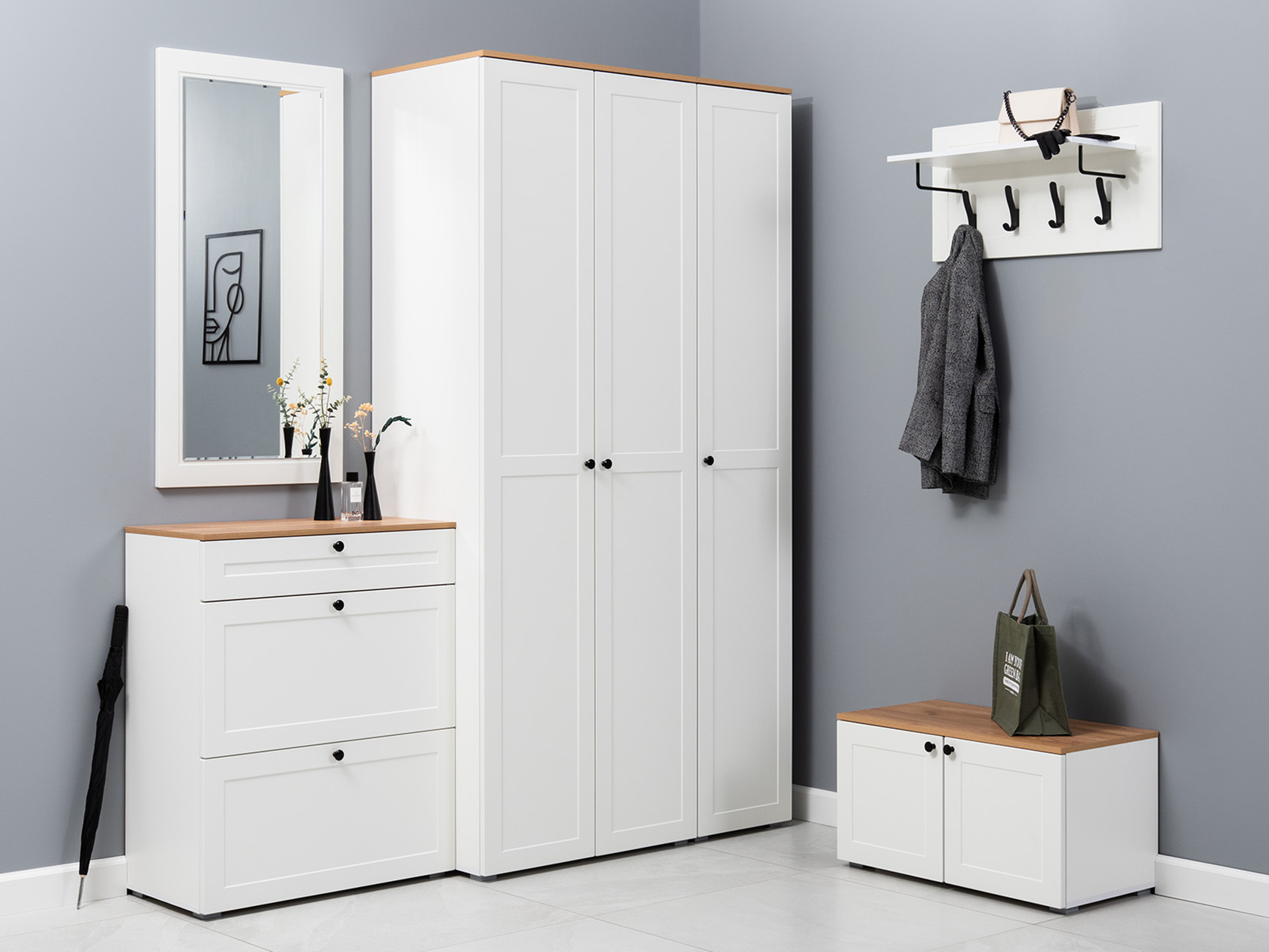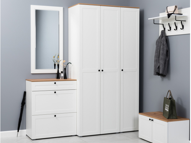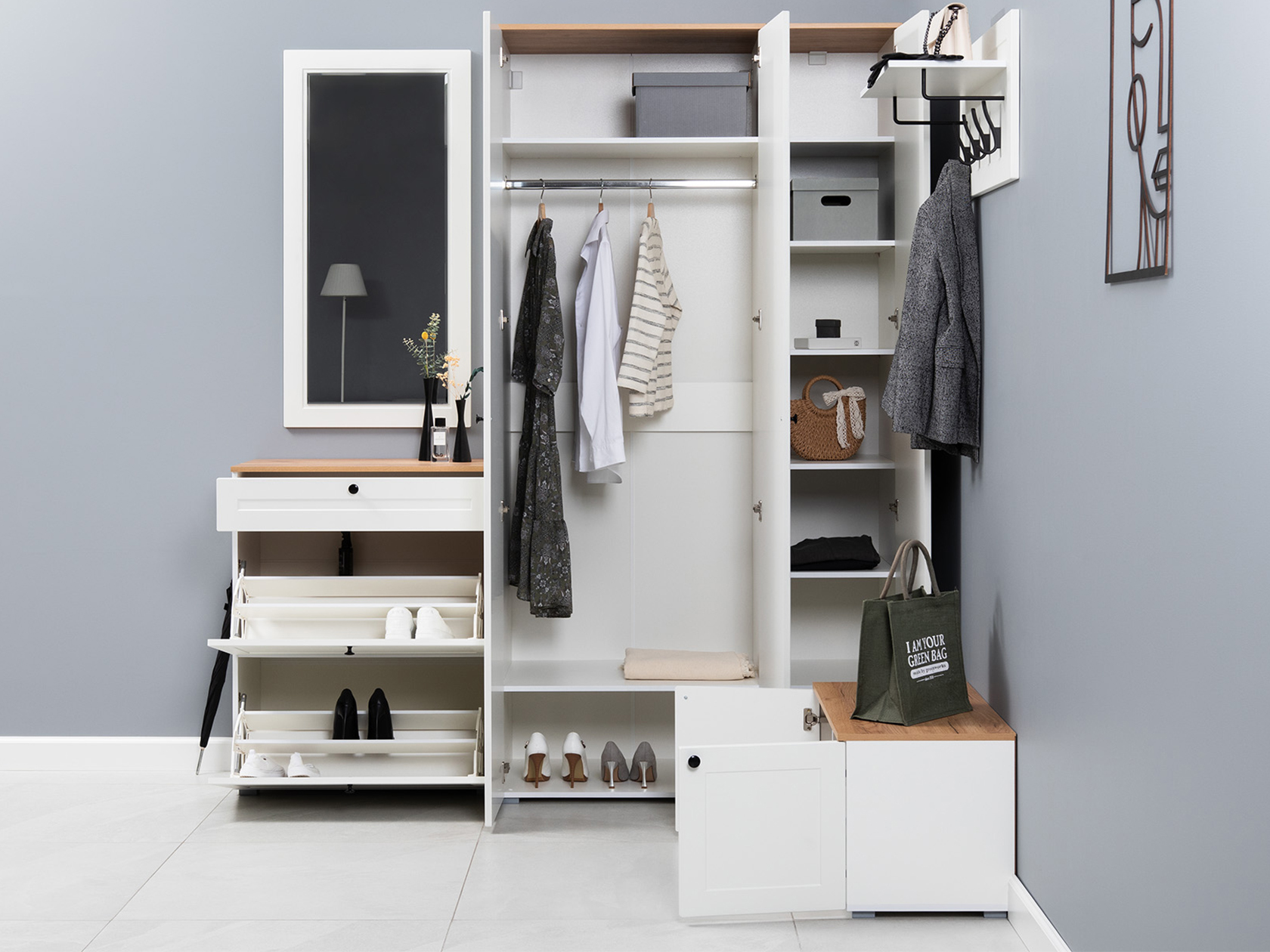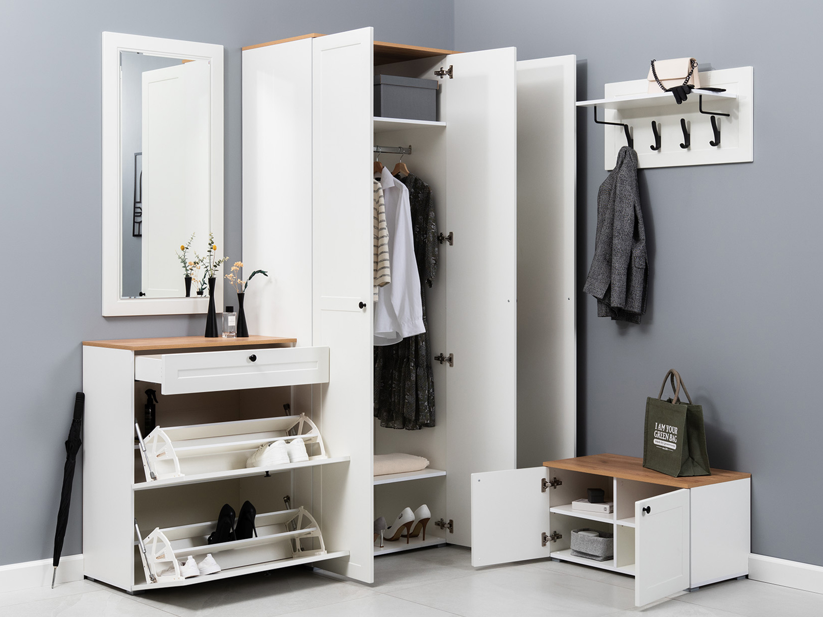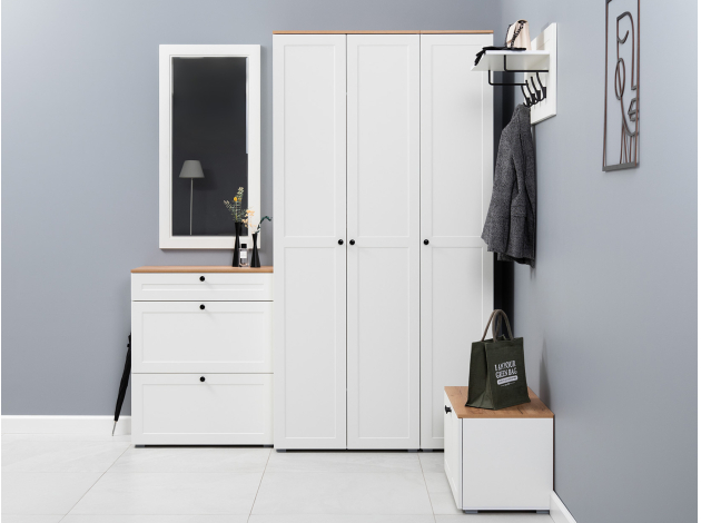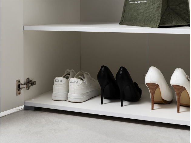 Распашной шкаф Остин поможет организовать пространство для хранения гардероба. Внутреннее наполнение представлено продольной штангой для вешалок и полками для обуви и головных уборов. Опоры регулируются по высоте, что позволит разместить модель на полу с неровностями.