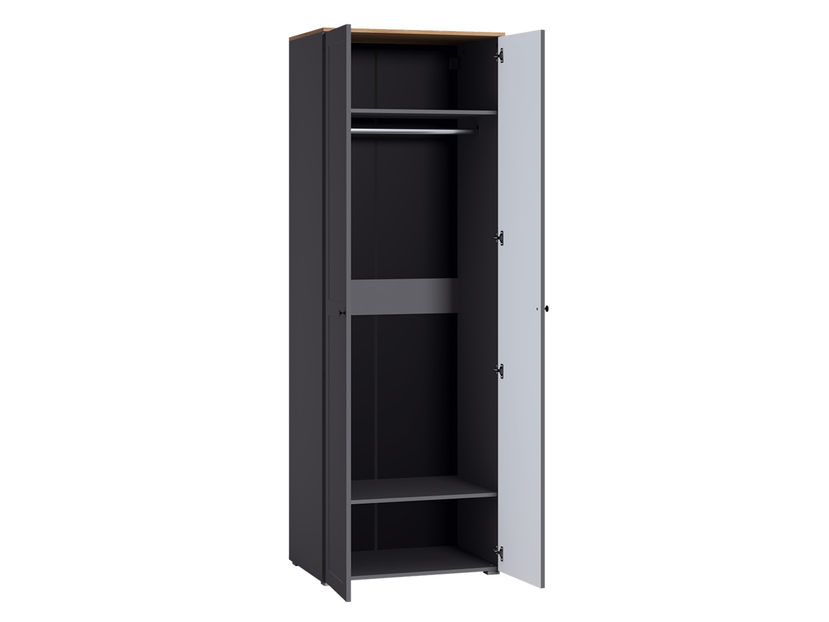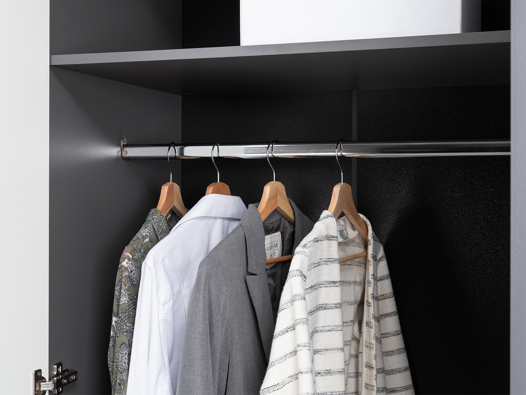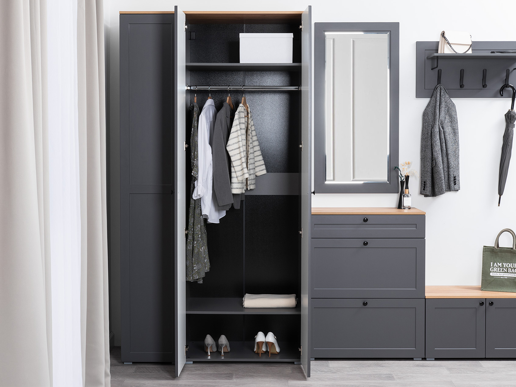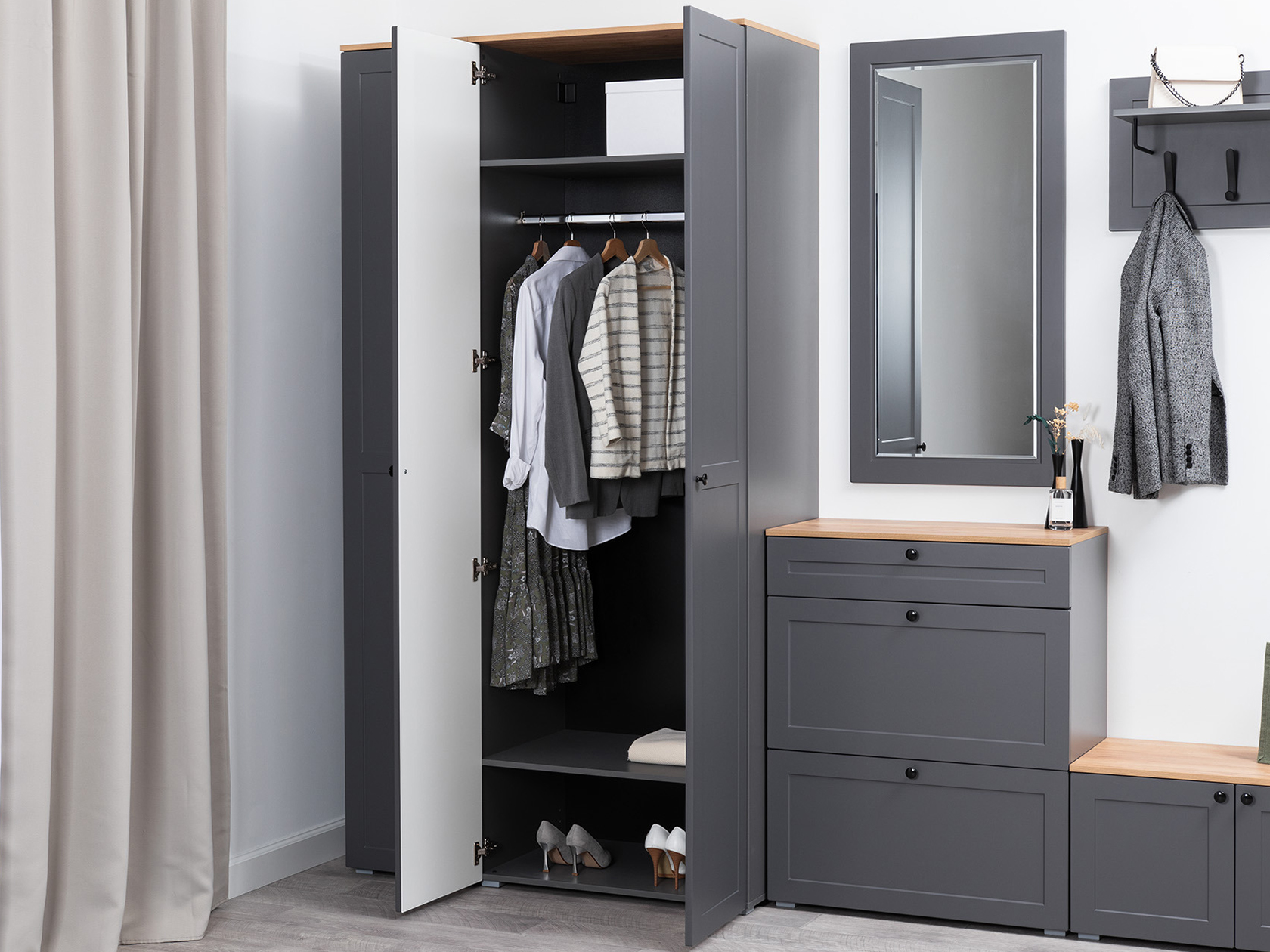 Распашной шкаф Остин поможет организовать пространство для хранения гардероба. Внутреннее наполнение представлено продольной штангой для вешалок и полками для обуви и головных уборов. Опоры регулируются по высоте, что позволит разместить модель на полу с неровностями.