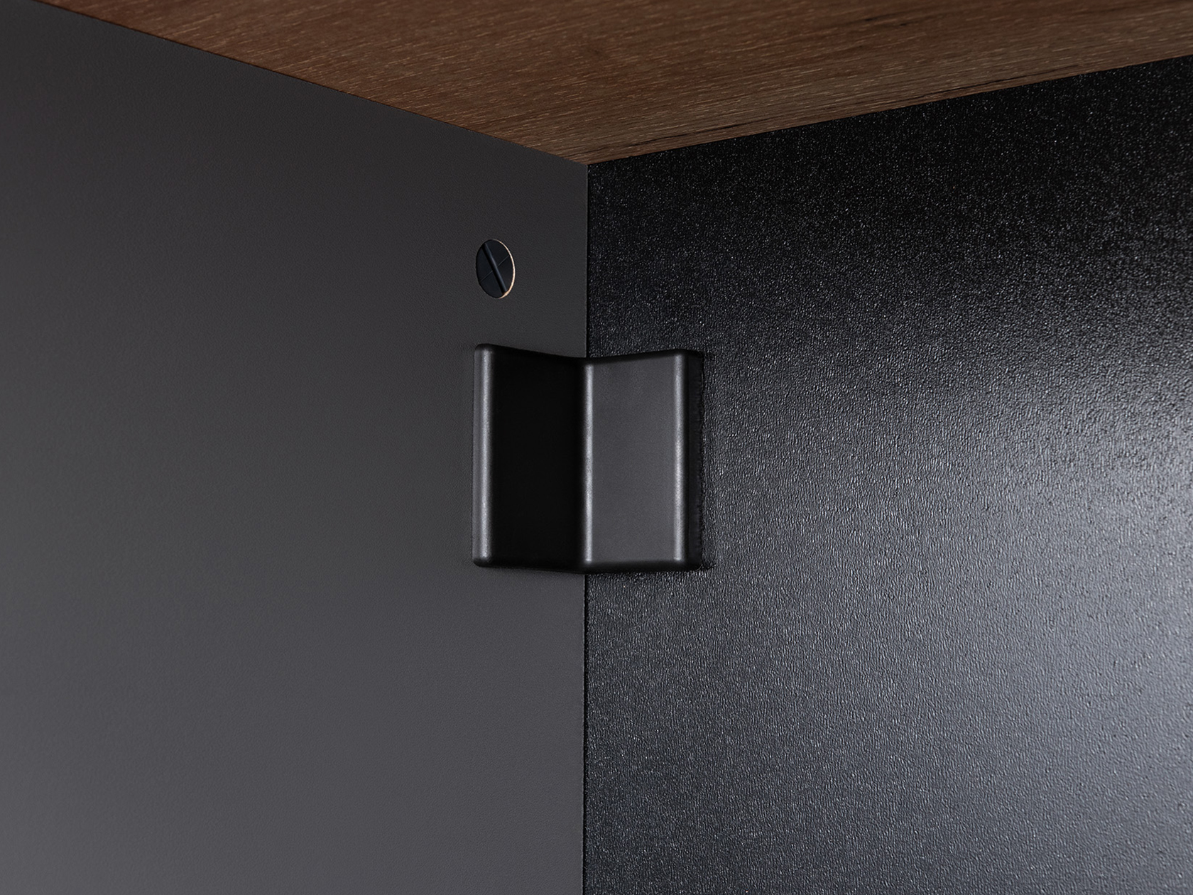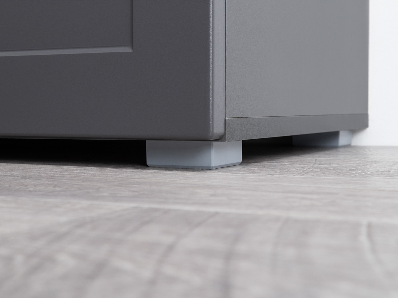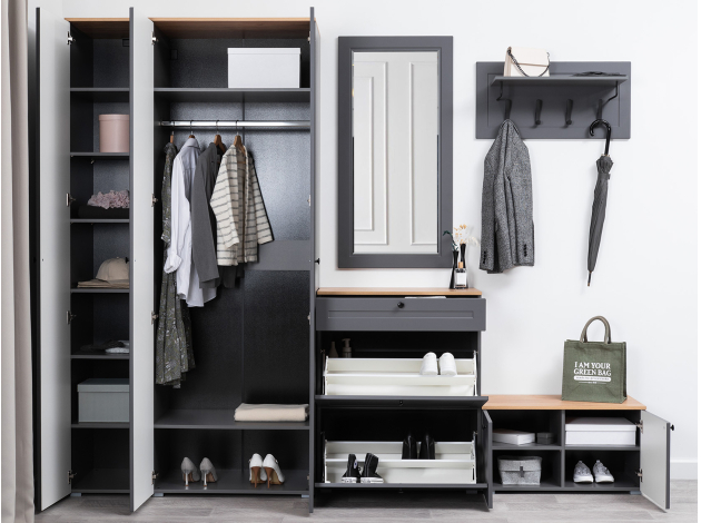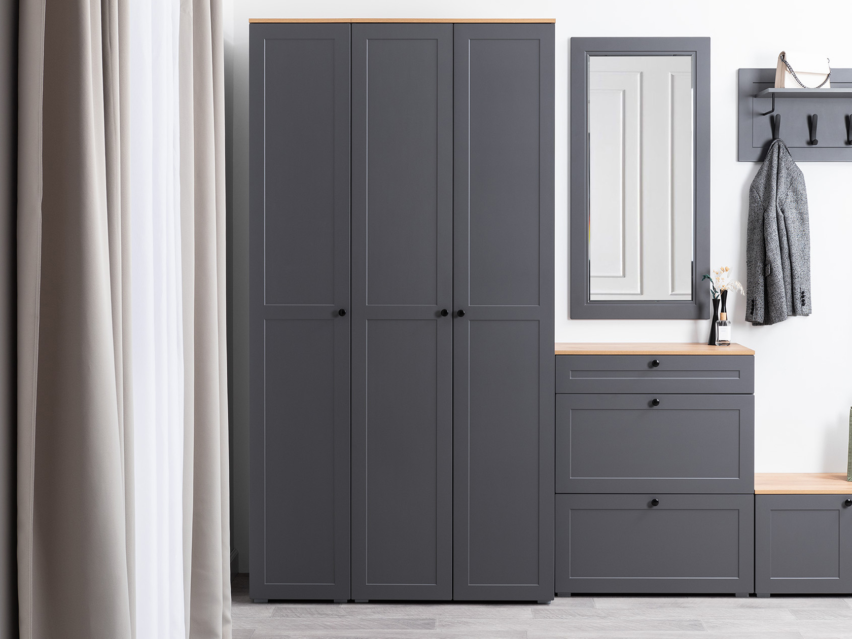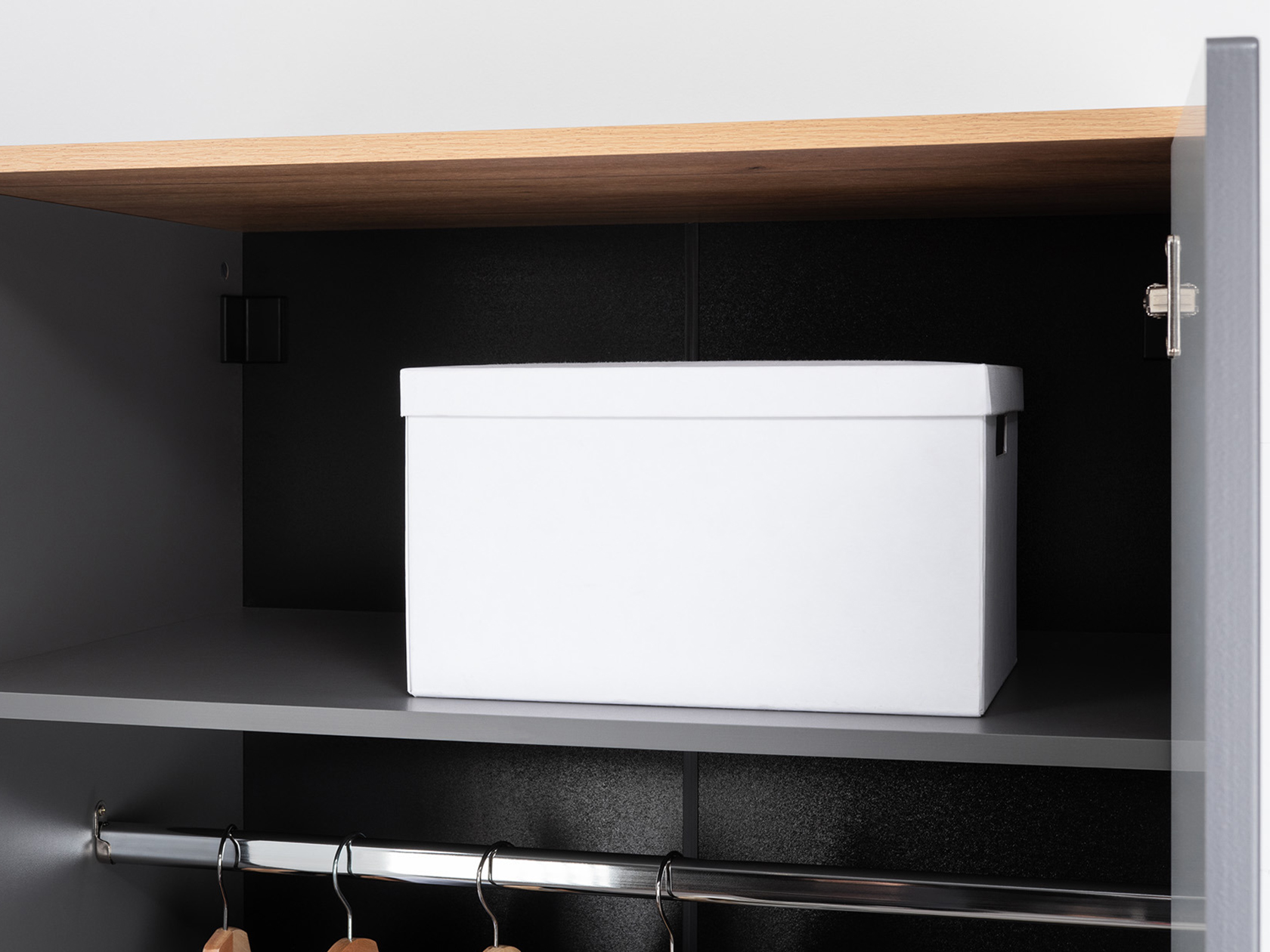 Распашной шкаф Остин поможет организовать пространство для хранения гардероба. Внутреннее наполнение представлено продольной штангой для вешалок и полками для обуви и головных уборов. Опоры регулируются по высоте, что позволит разместить модель на полу с неровностями.