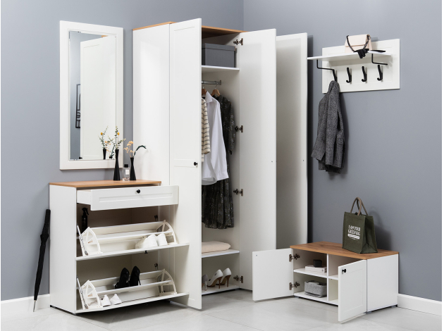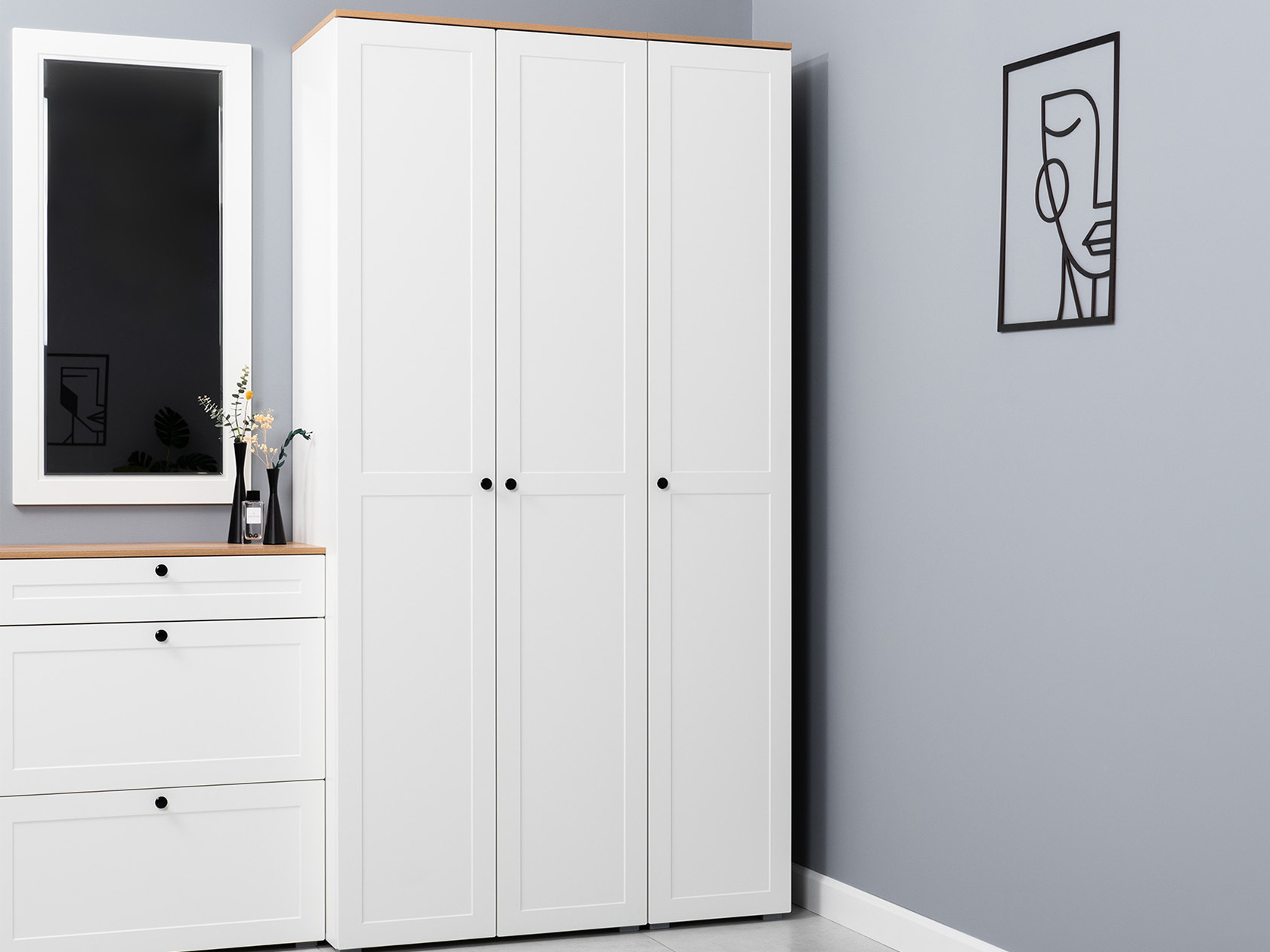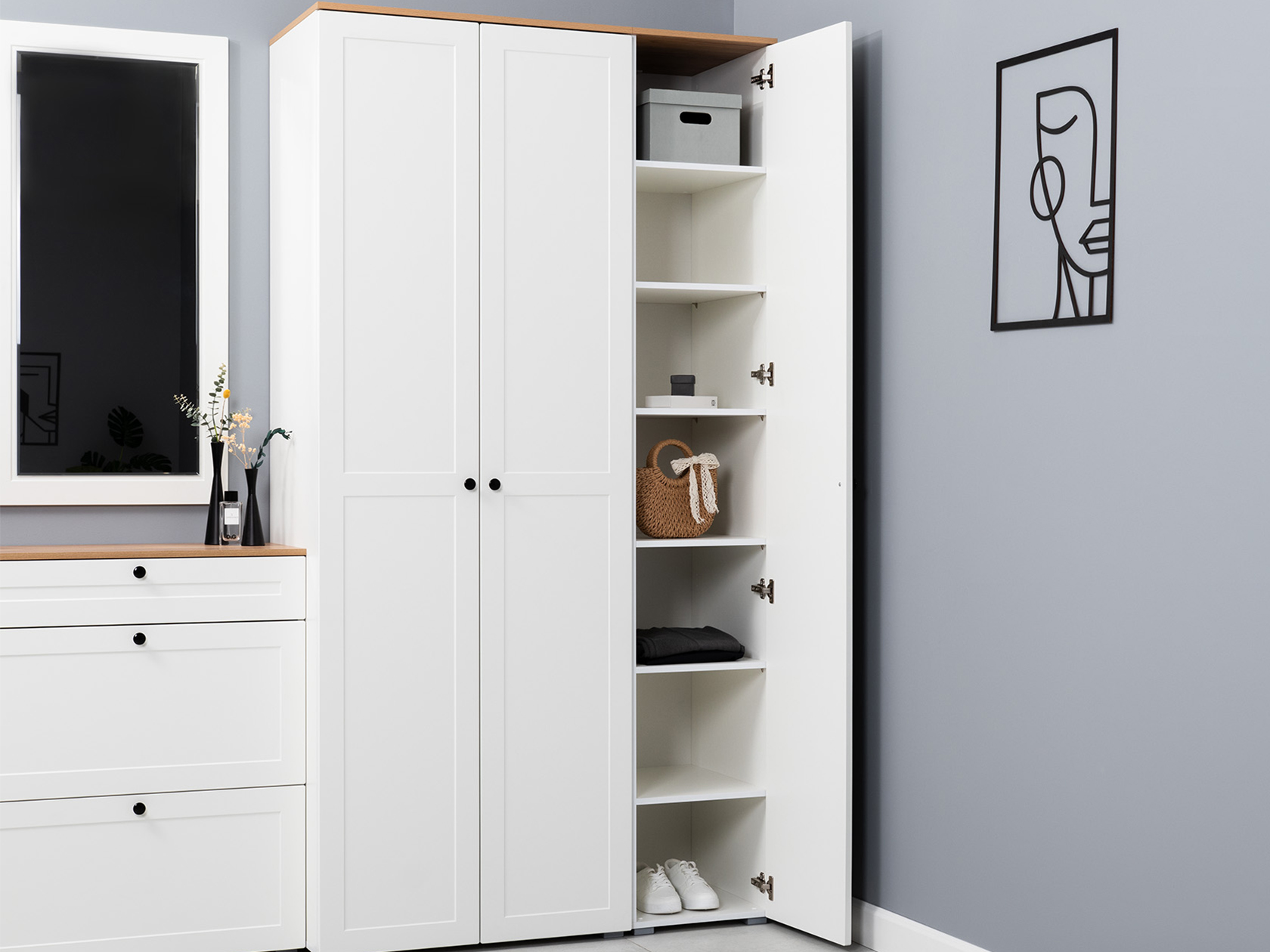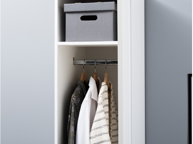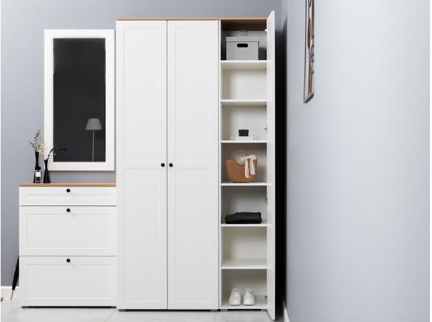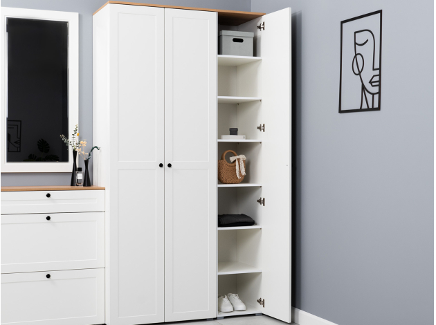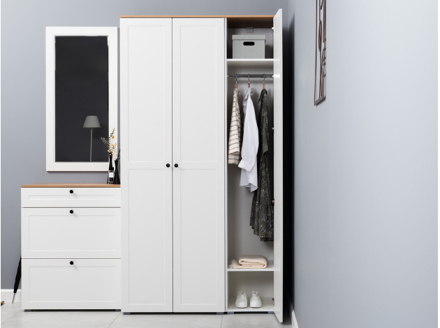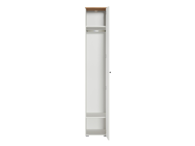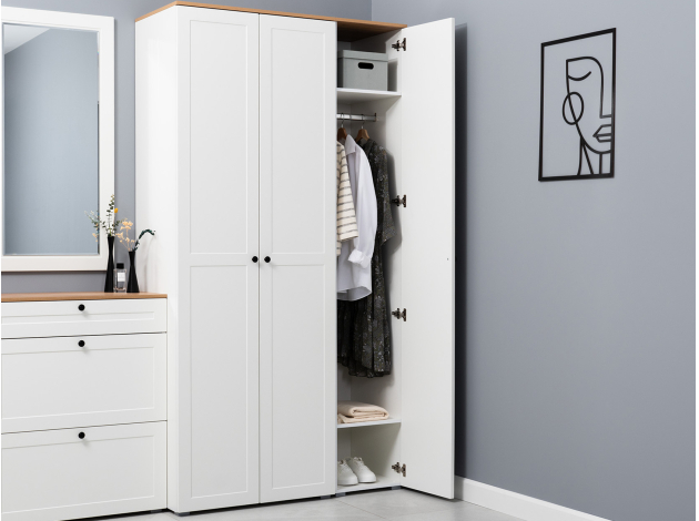 Распашной шкаф Остин станет компактным решением для упорядоченного хранения гардероба. Внутреннее наполнение предусматривает ряд полок для сложенной одежды и продольную штангу для вешалок. Опоры регулируются по высоте, что позволит разместить модель на полу с неровностями.