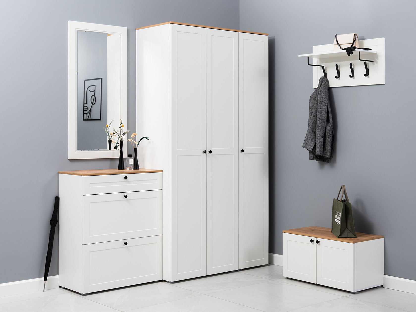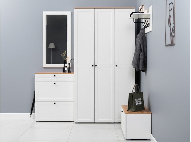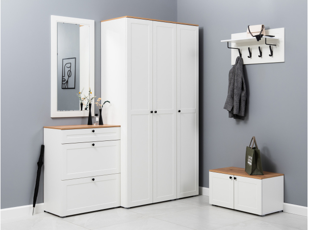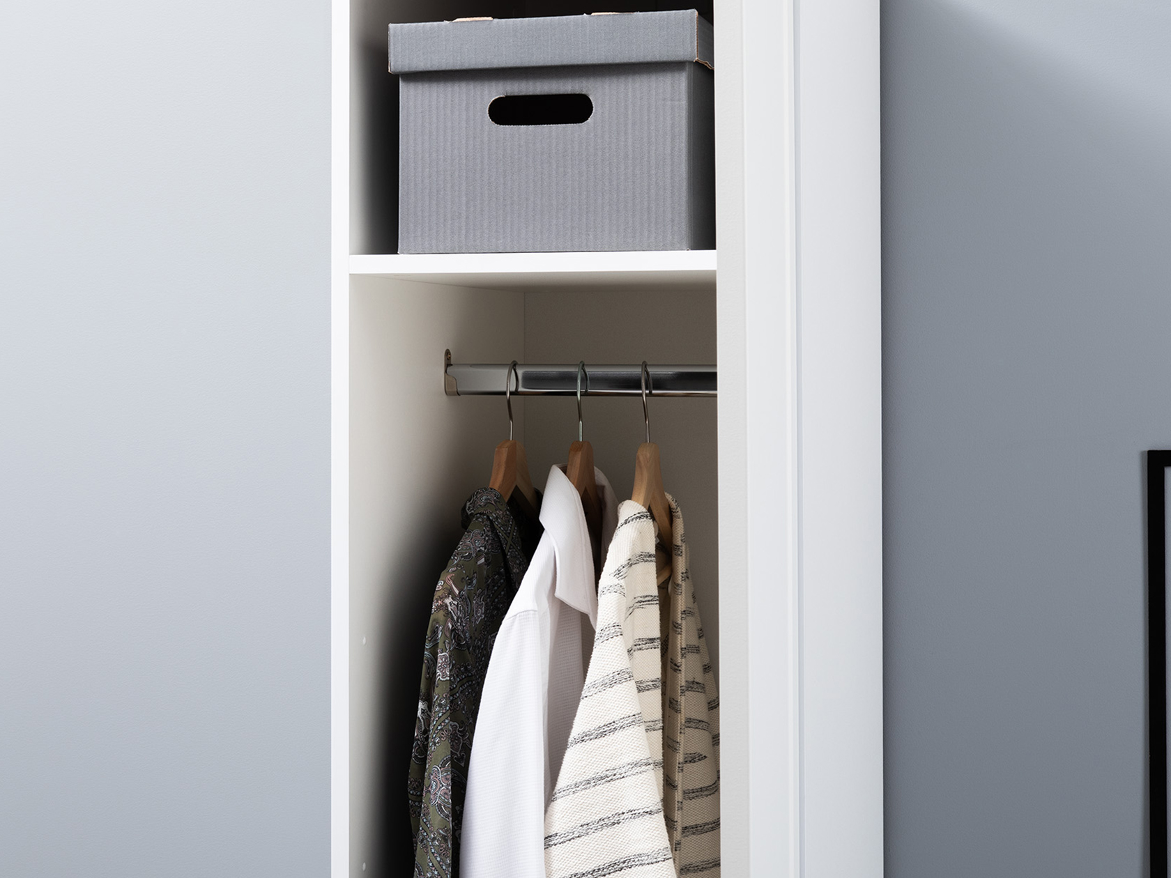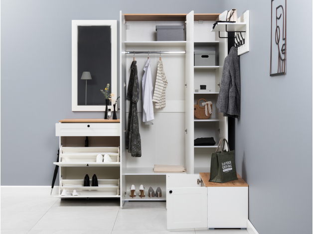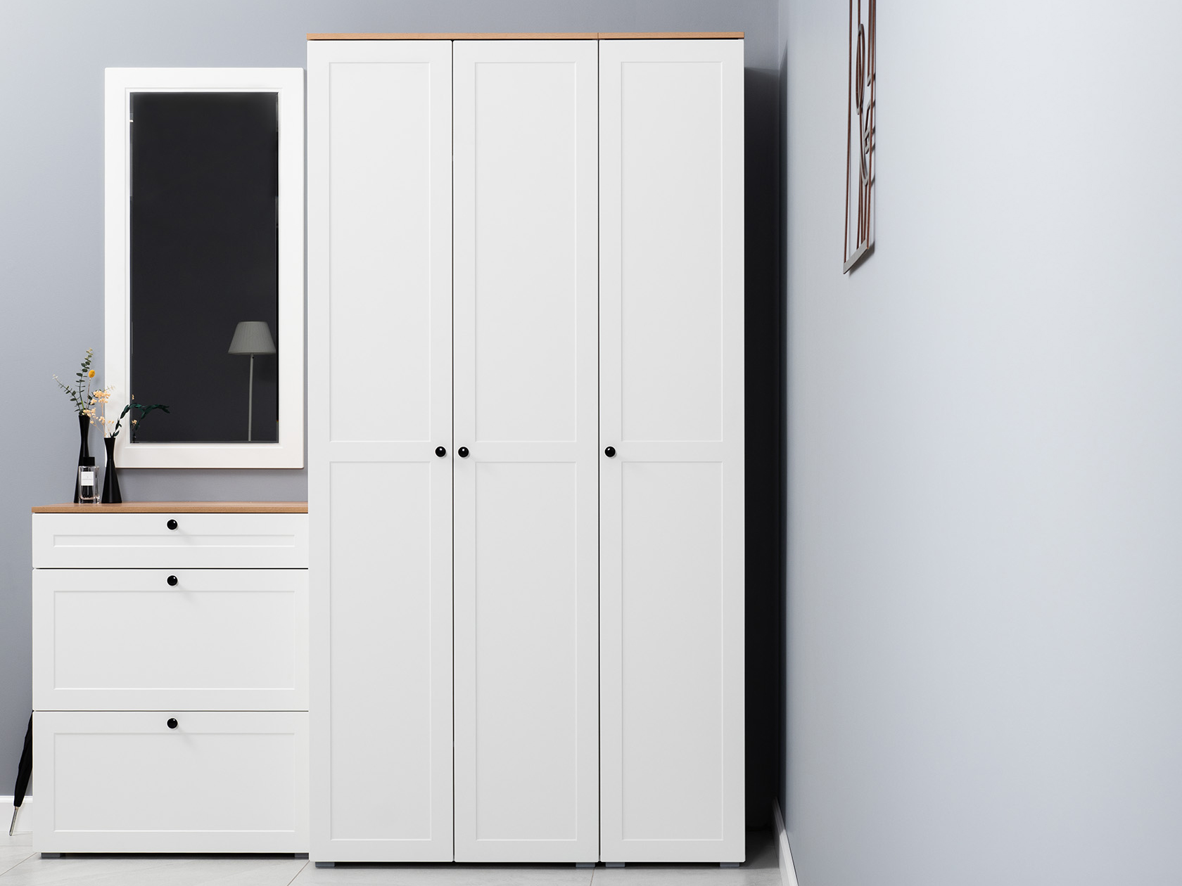 Распашной шкаф Остин станет компактным решением для упорядоченного хранения гардероба. Внутреннее наполнение предусматривает ряд полок для сложенной одежды и продольную штангу для вешалок. Опоры регулируются по высоте, что позволит разместить модель на полу с неровностями.