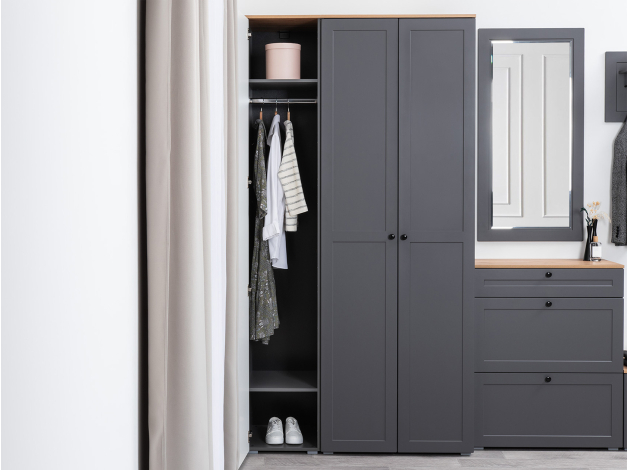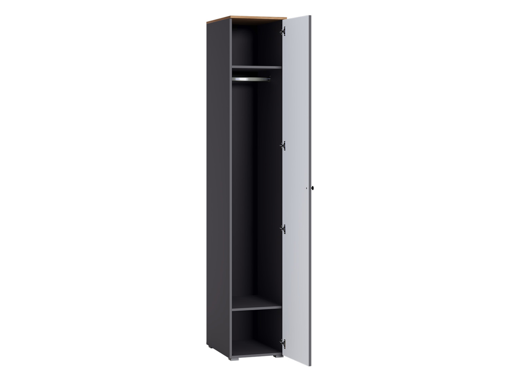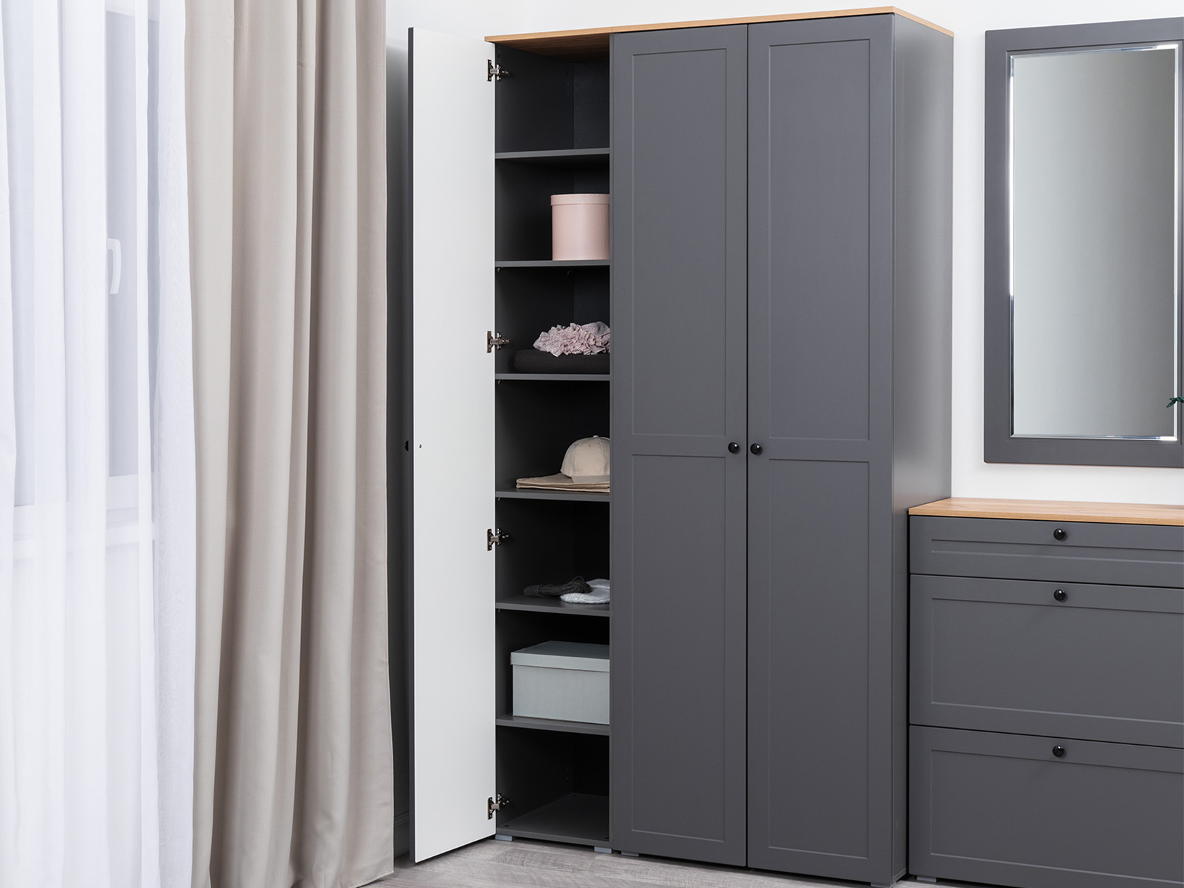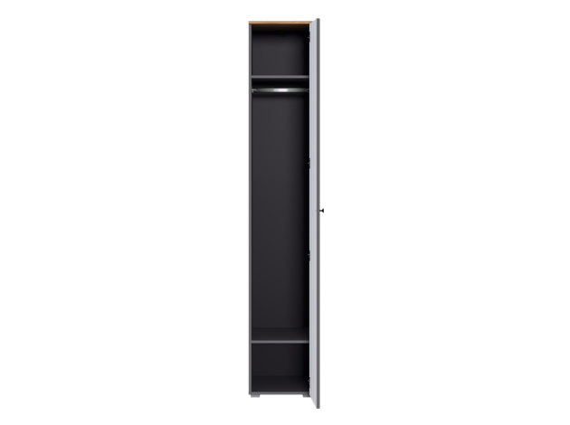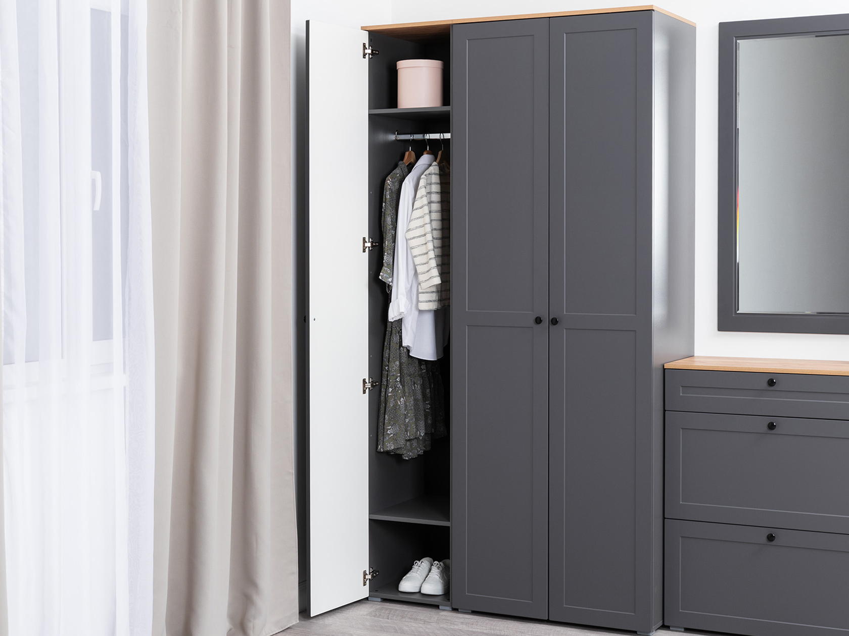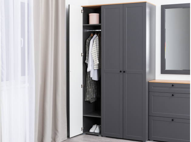 Распашной шкаф Остин станет компактным решением для упорядоченного хранения гардероба. Внутреннее наполнение предусматривает ряд полок для сложенной одежды и продольную штангу для вешалок. Опоры регулируются по высоте, что позволит разместить модель на полу с неровностями.