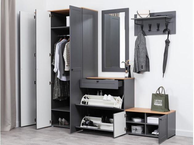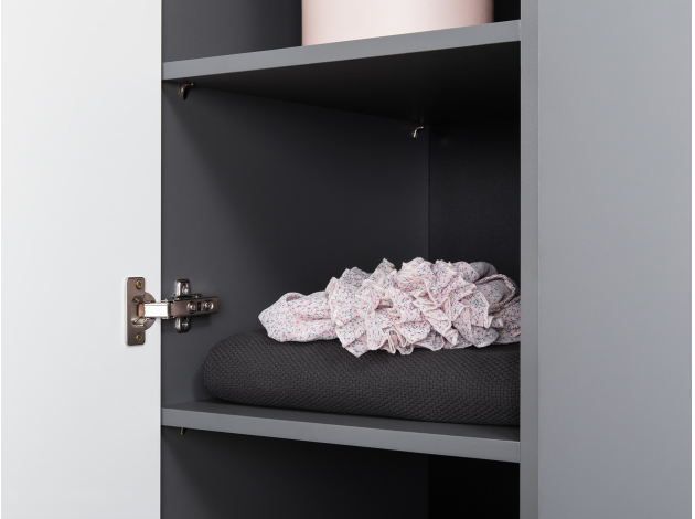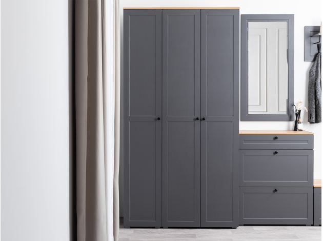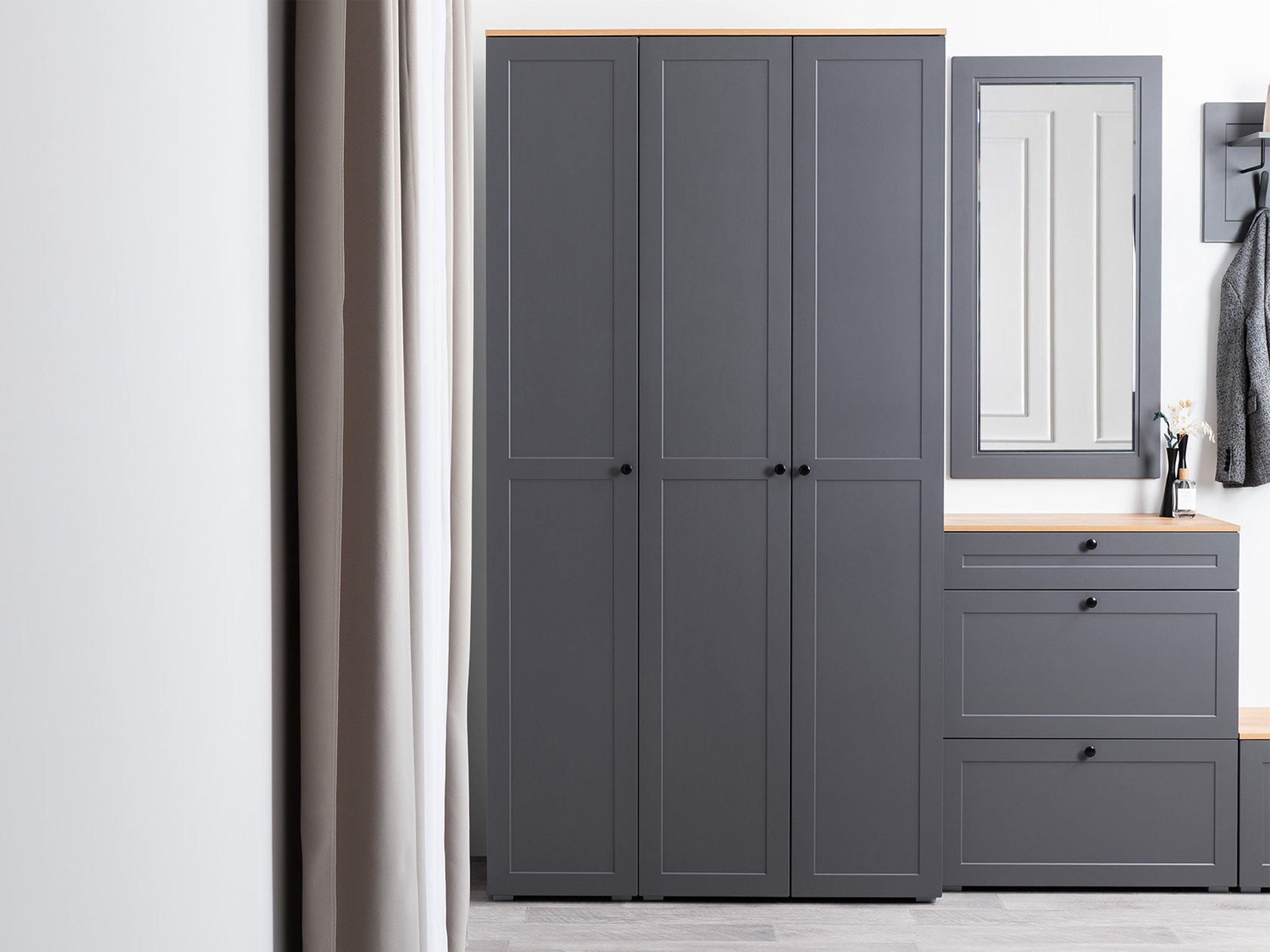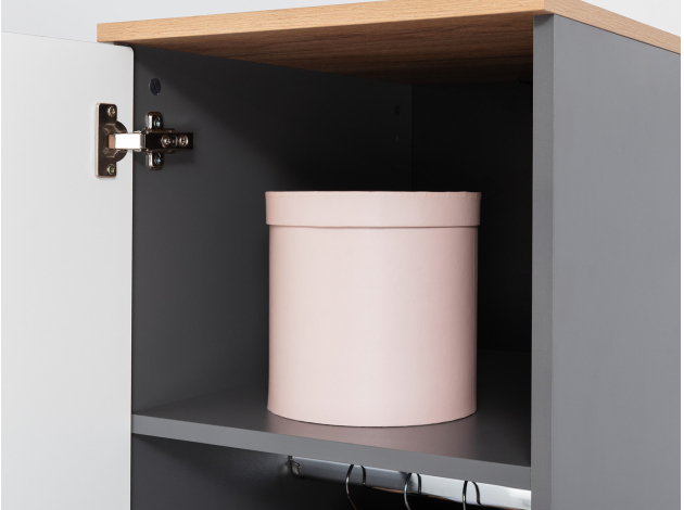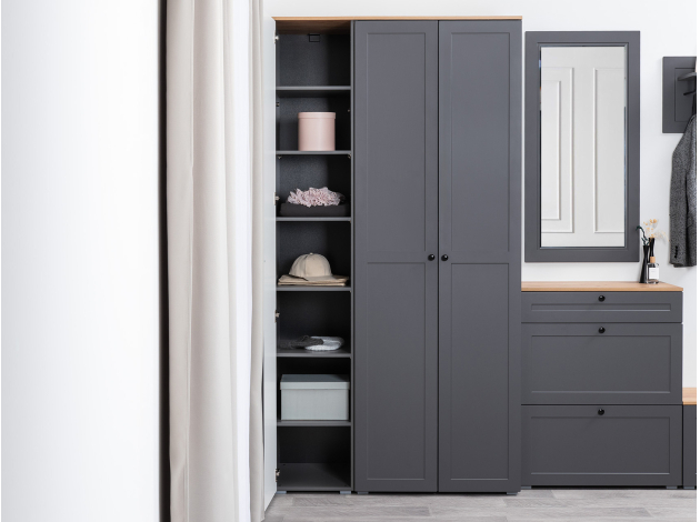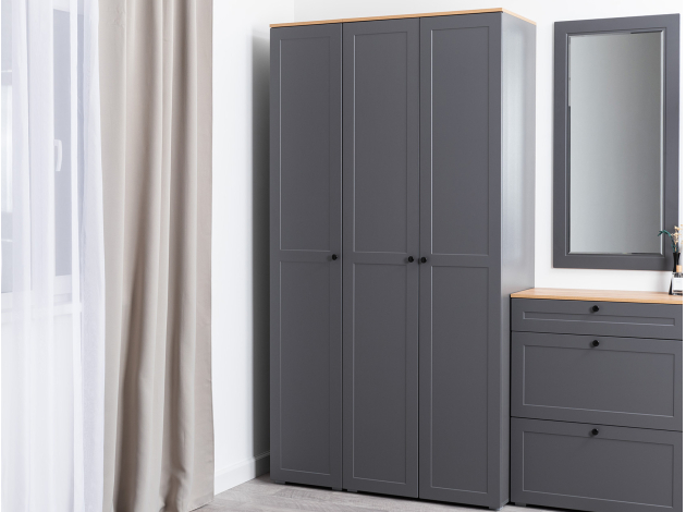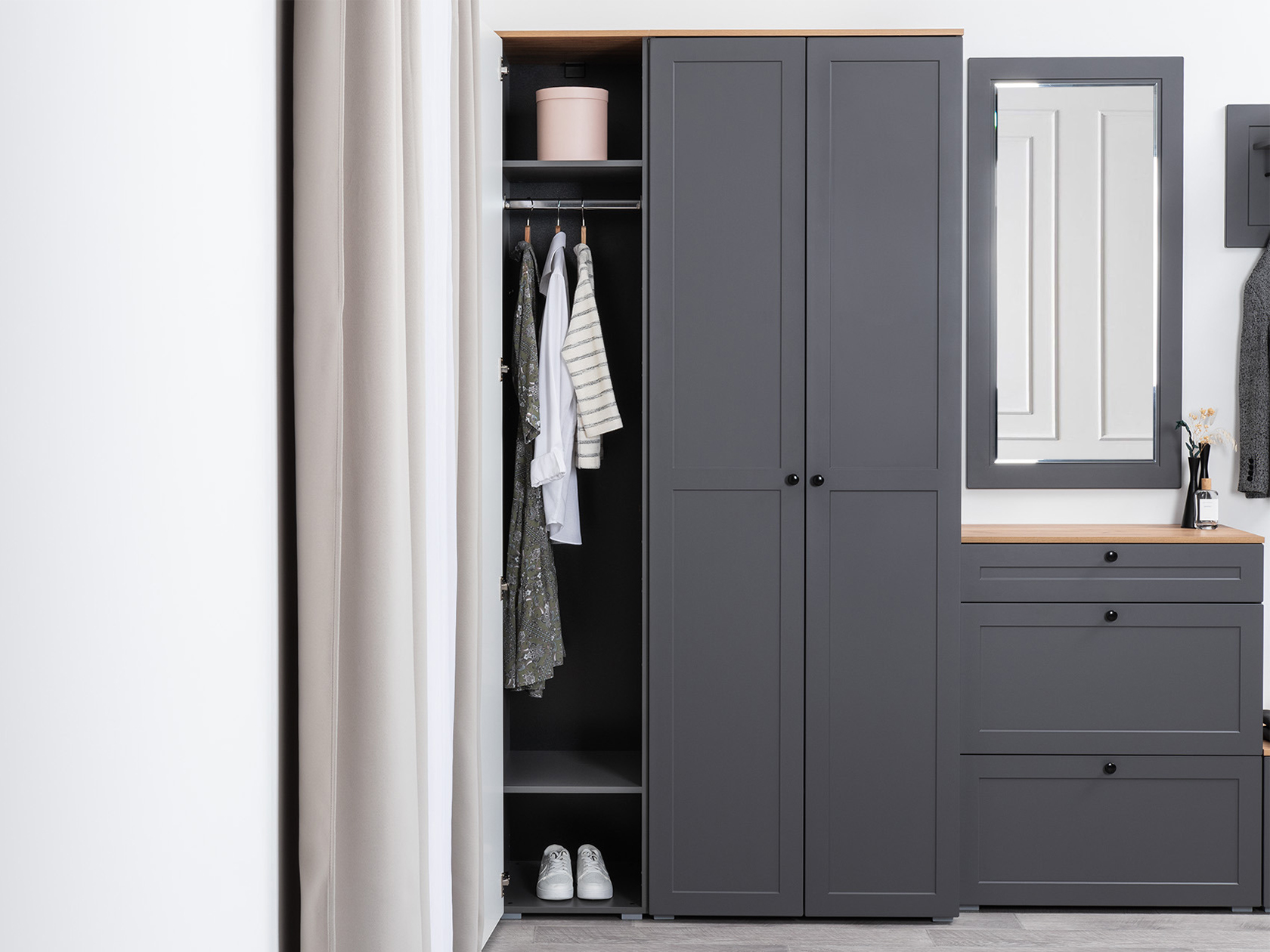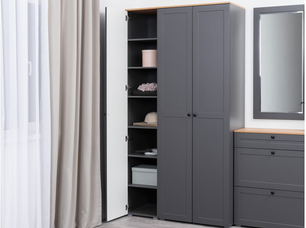Распашной шкаф Остин станет компактным решением для упорядоченного хранения гардероба. Внутреннее наполнение предусматривает ряд полок для сложенной одежды и продольную штангу для вешалок. Опоры регулируются по высоте, что позволит разместить модель на полу с неровностями.