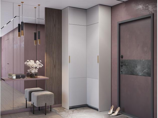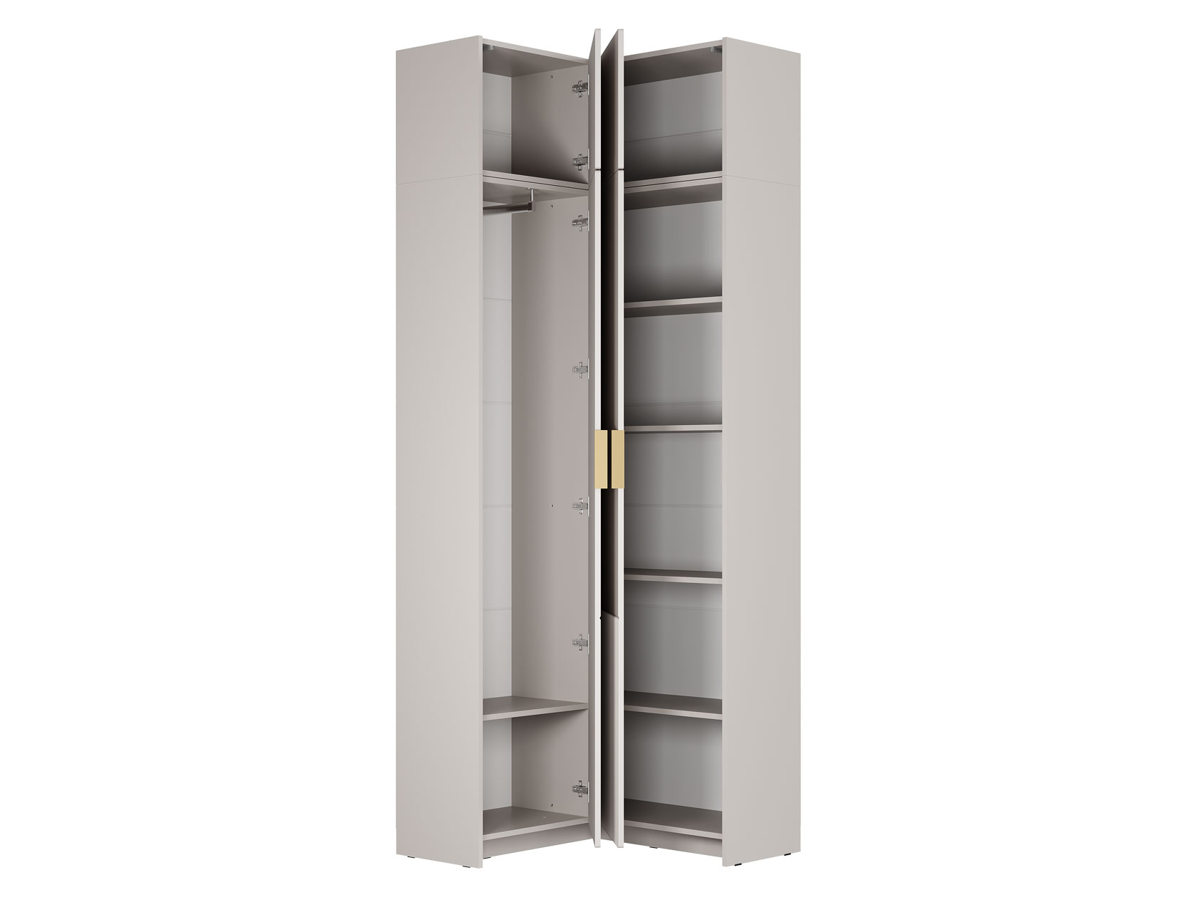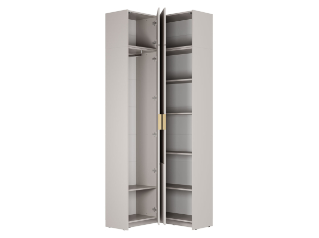 Угловой шкаф Пандора поможет оптимизировать пространство благодаря удобной конструкции. Вместительная модель включает отделение с полками и секцию со штангой, что позволяет разграничить хранение разных категорий вещей. Вертикальная фрезеровка на фасадах в сочетании с контрастными золотыми ручками создают акценты в интерьере.