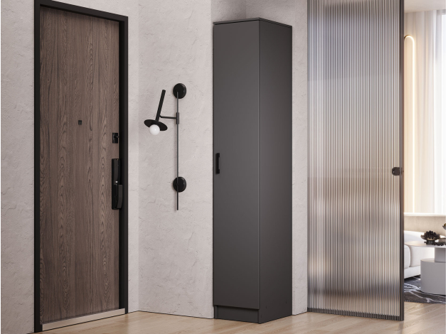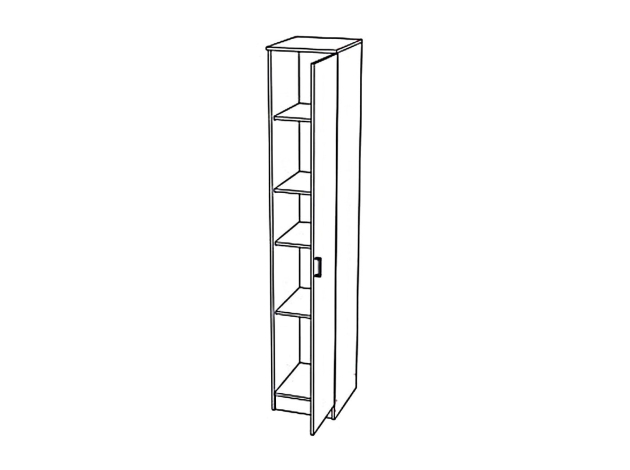 Шкаф-пенал Эко — универсальная модель для хранения любых необходимых вещей: от документов и книг до предметов гардероба. Высокую узкую конструкцию удобно расположить даже в комнате с ограниченной площадью. Гладкий матовый фасад без декора придает мебели лаконичность, а стильная ручка выступает небольшим акцентом.