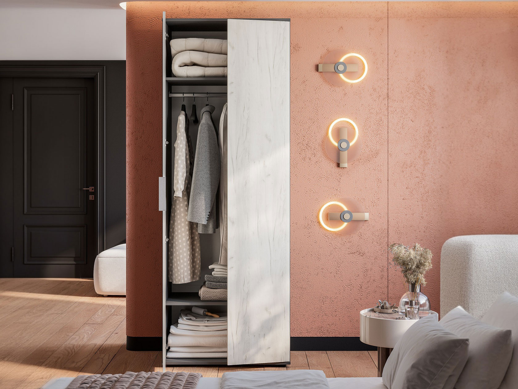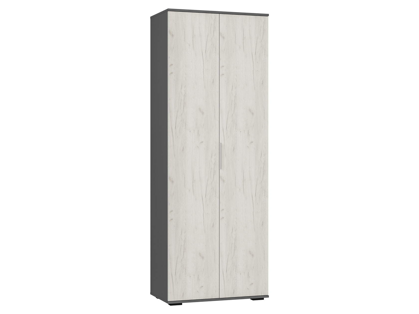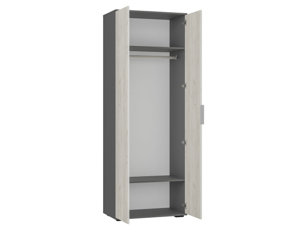 Распашной шкаф Плаза станет идеальным дополнением интерьера, оформленного с акцентом на минимализм. Узкая конструкция легко поместится даже в ограниченном пространстве. Отделение со штангой позволит хранить на вешалках одежду разной длины, а на полках можно расположить обувь, коробки и сезонные вещи. Гладкие фасады без декора подчеркивают лаконичный стиль мебели.