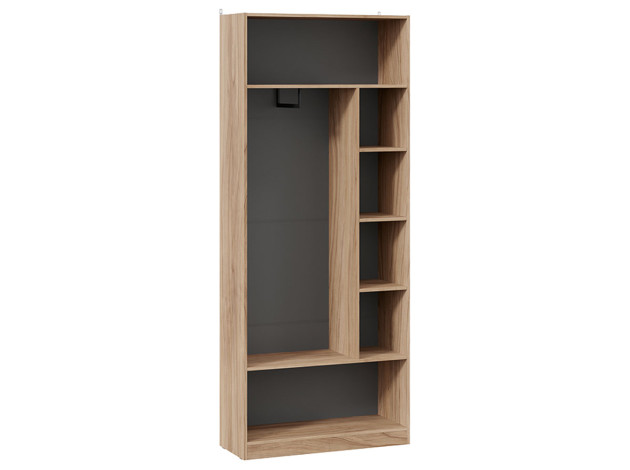 Распашной шкаф Порто — универсальная модель с базовым наполнением. Внутри расположены ниша со штангой и пара вместительных полок, где можно хранить объемные сезонные вещи или коробки с обувью.